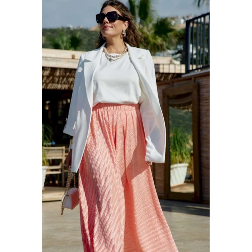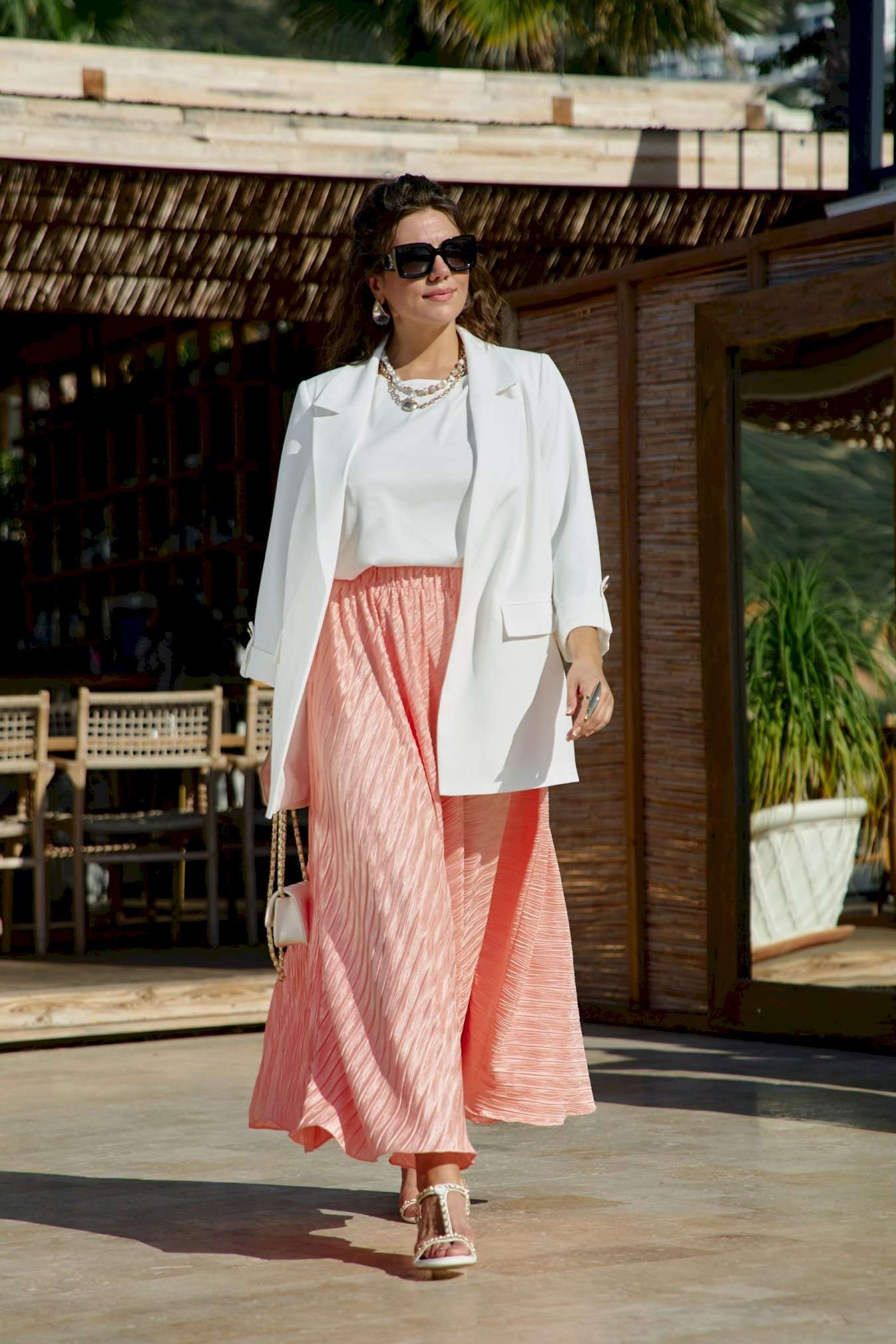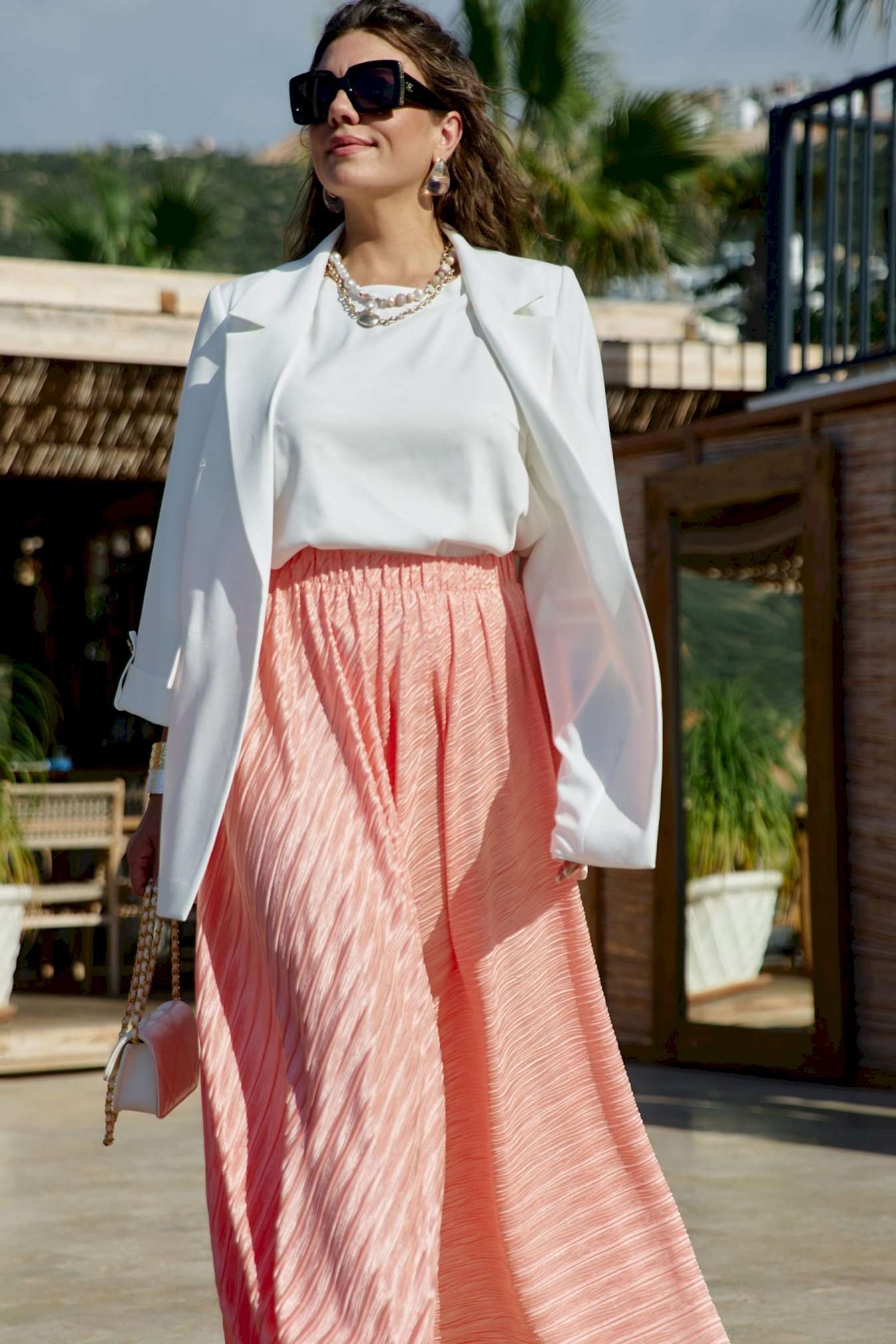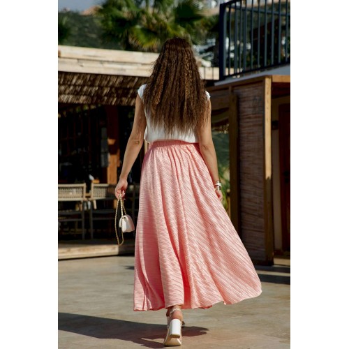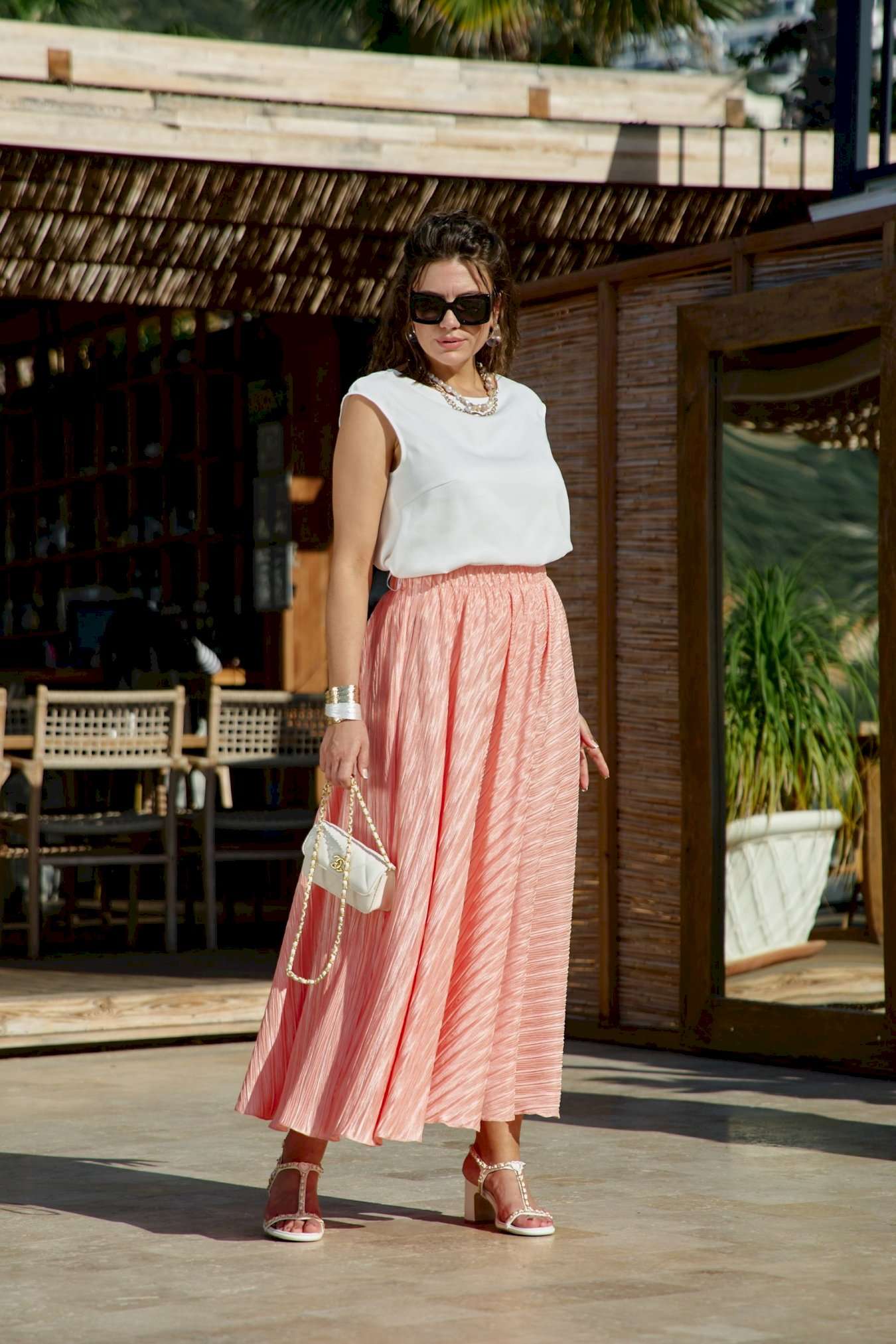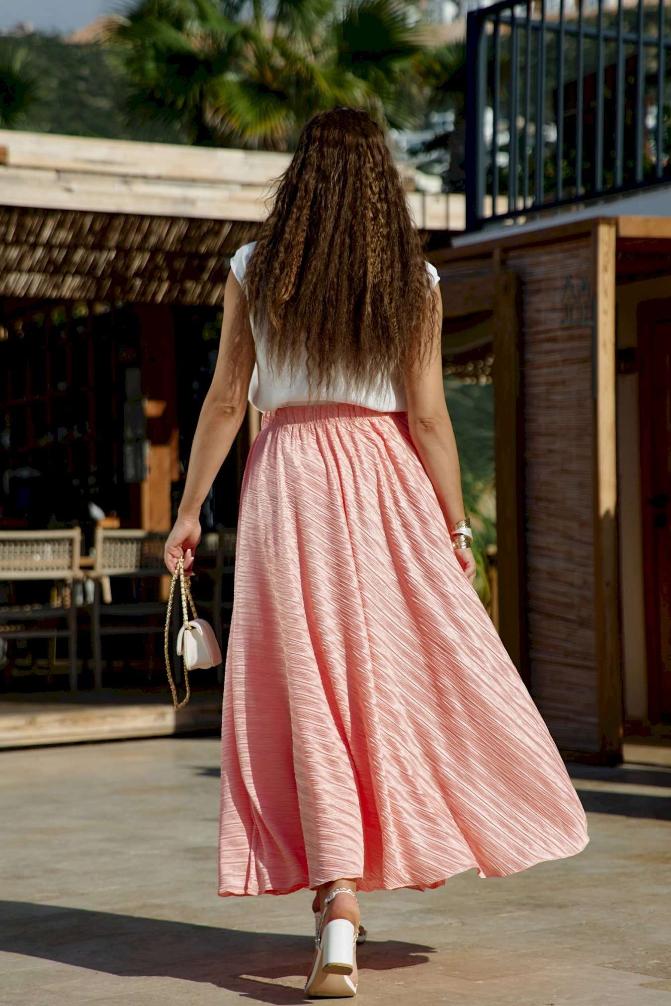 Юбка «полусолнце» в длине миди с жатой фактурой — это сочетание лёгкой драматичности и непринуждённой элегантности. Её силуэт создаёт мягкую визуальную волну, а жатая поверхность превращает каждый изгиб в игру света и тени: она одновременно утончённая и характерная, романтичная и по-городски современная. Из-за сжатой фактуры ткани юбка выглядит живой и объёмной. Юбка силуэта полусолнце , длины «миди» с притачным поясом на эластичной тесьме-резинке. Крой юбки уравновешивает визуально бёдра и создаёт плавный силуэт. Длина юбки 96 см.
