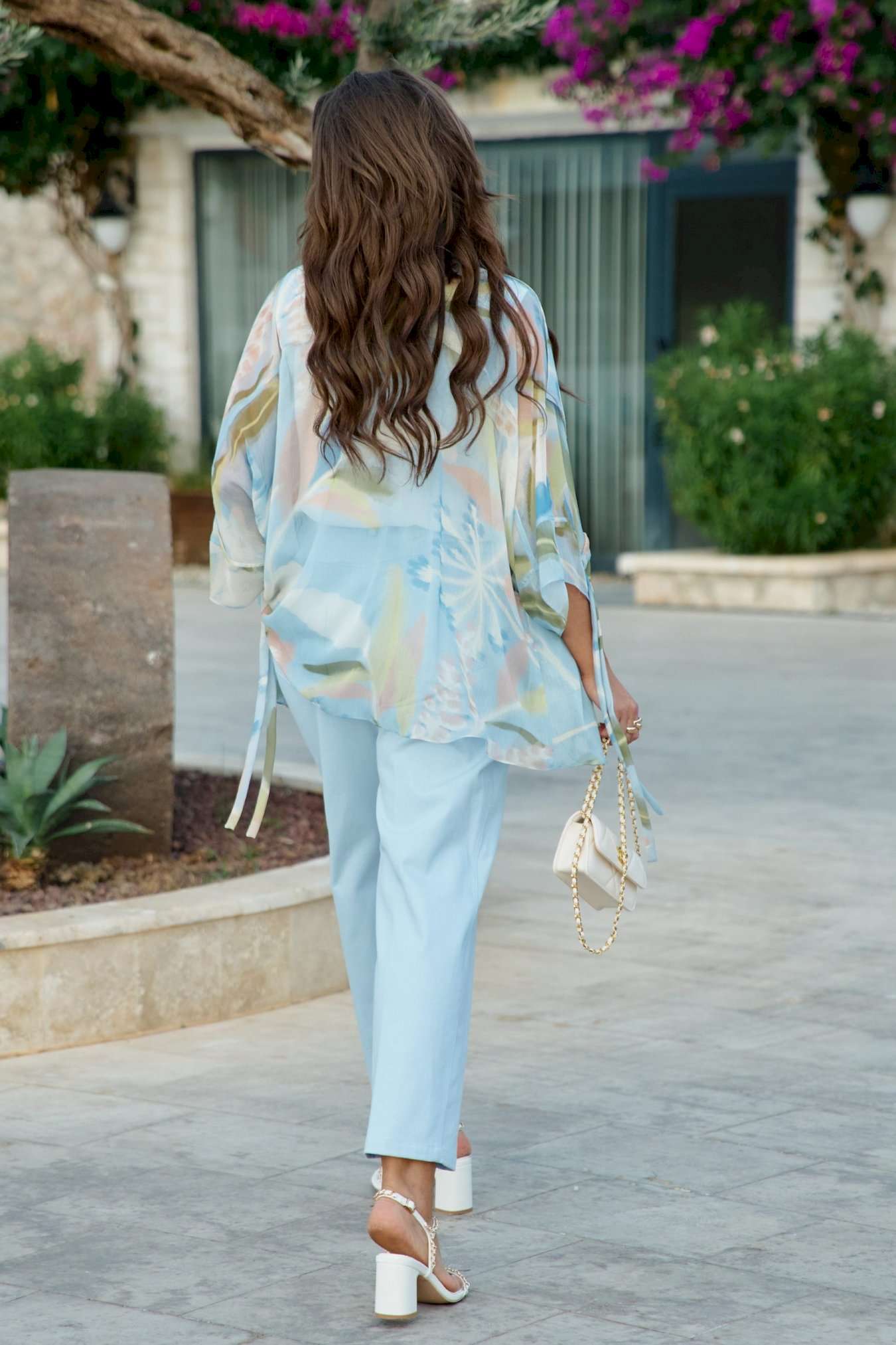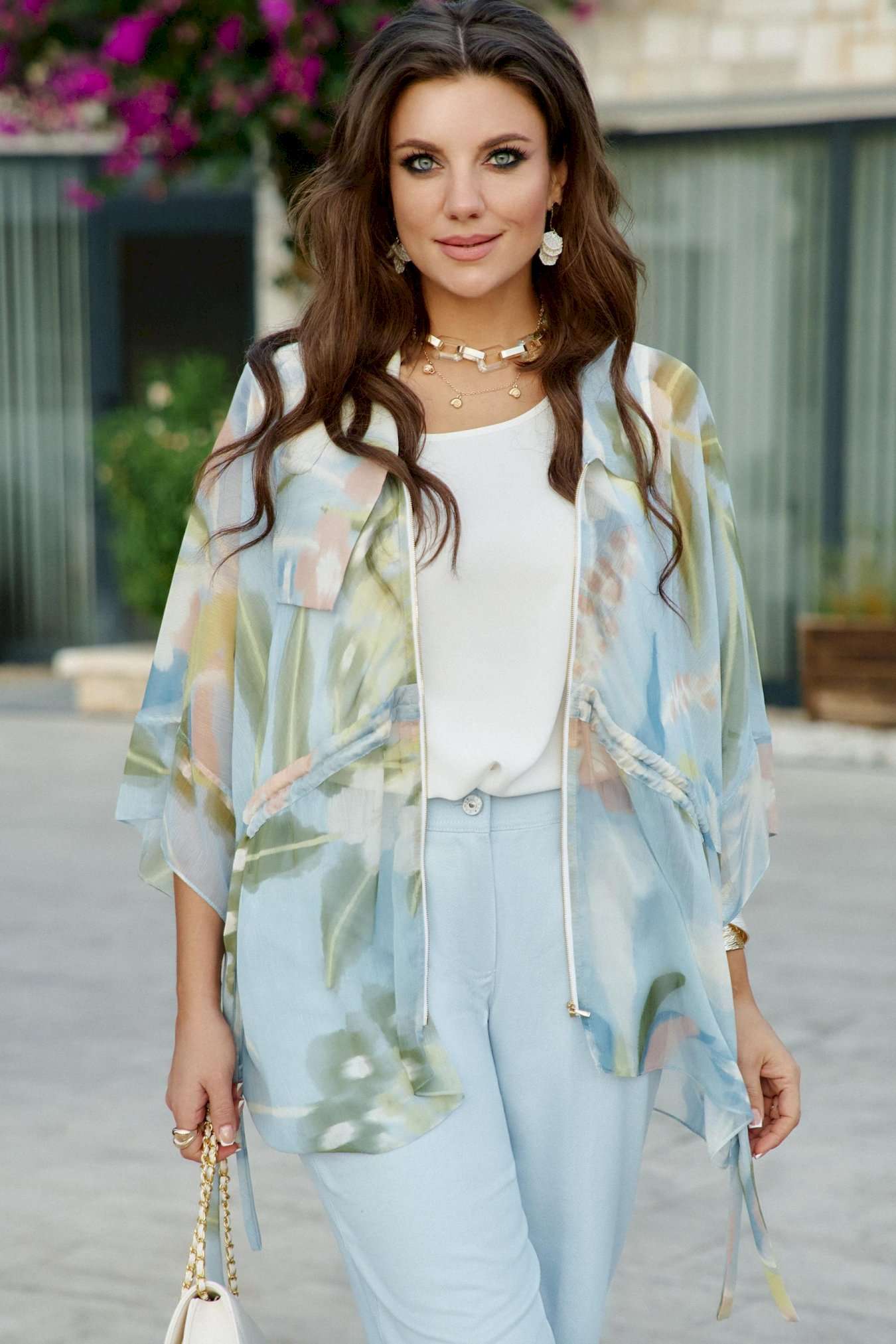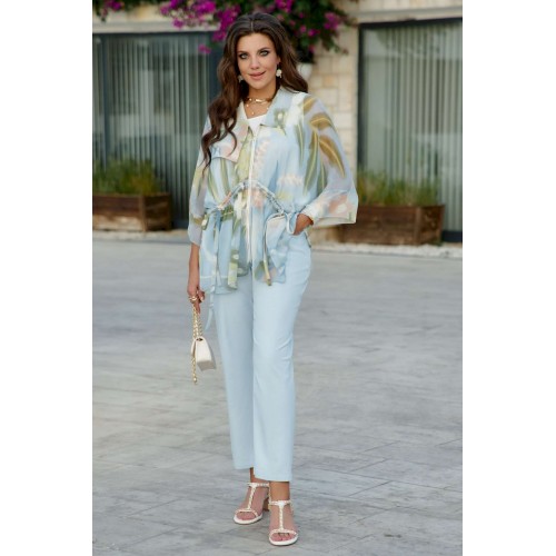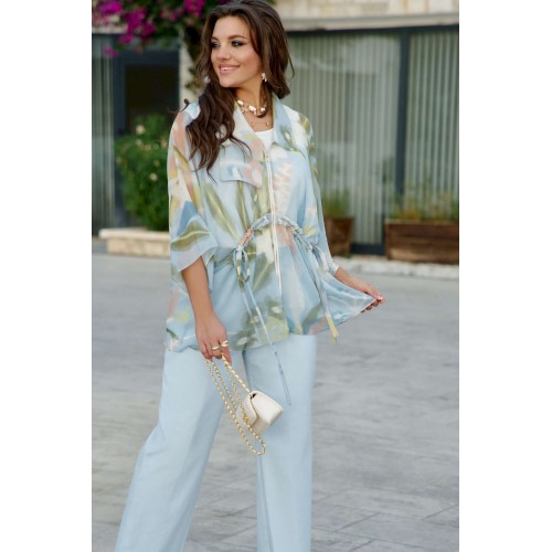 Комплект женский, двух предметный, состоящий из блузки и блузы. Этот комплект читает женственность спокойно — без пафоса. Он рассказывает о комфорте, о внимании к текстурам и о желании выглядеть легко, но продуманно. Вместе они создают образ, где современная минималистика встречается с женственной романтикой: практично, но вдохновляюще. Главный акцент комплекта – это невесомая шифоновая блузка с абстрактным цветочным принтом в пастельных тонах, создающая ощущение воздушности и легкости. Ее свободный крой и завязки на талии позволяют регулировать силуэт, добавляя динамичности. Его дополняет базовая белая блуза, которая служит чистым холстом для более яркого элемента. Блузка свободного силуэта, с центральной застёжкой на тесьму молнию по переду; воротник в блузке отложной, ассиметричный. В качестве отделочного элемента по переду блузки - кулиса со шнуром из основной ткани. Рукав цельнокроеный, длиной 7/8, с притачной манжетой. По спинке отрезная кокетка. Низ в блузке ассиметричный. Блуза прямого силуэта с округлой формой горловины и нагрудными вытачками по полочке. Спинка без особенностей. Данный комплект имеет множество вариантов стилизации. Можно неебрежно заправить переднюю часть блузы в джинсы — блузка свободно расправится сверху. Застегнуть молнию наполовину, чтобы создать V-образный переход между шифоном и топом. Длина верхней блузы по центру спинки 75,5 см (р 52-56), 76 см (р 58-62). Длина рукава верхней блузы 56 см (р 52-56), 57 см (р 58-62).