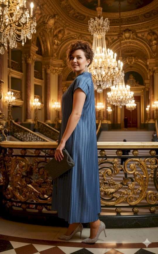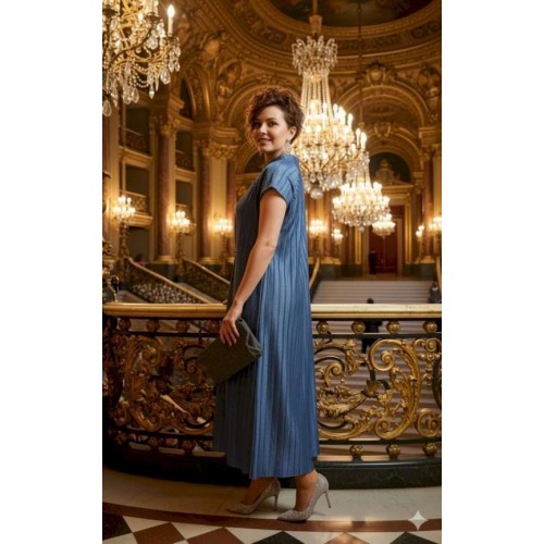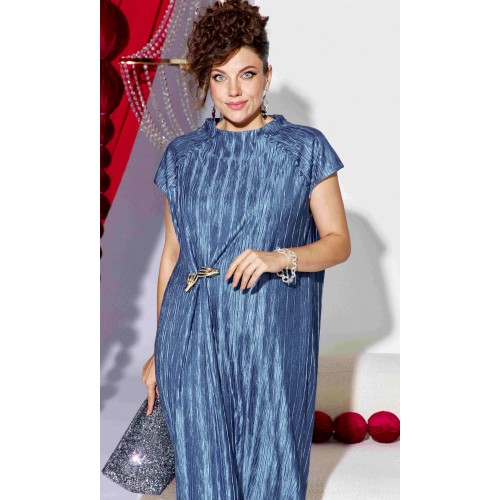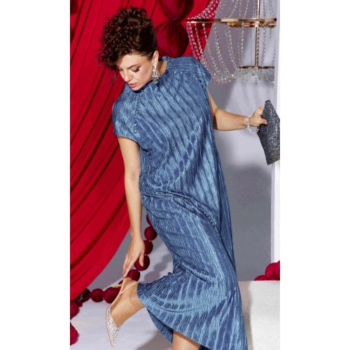 Платье прямого силуэта из фактурной ткани с крэш-эффектом, который создает в силуэте вертикальные заломы визуально вытягивающие фигуру и придает модели выразительный образ. Короткий рукав-реглан с навесными петельками и пуговицами, обтянутыми основной тканью рисует линию рельефа по переду и спинке сужая плечевой пояс. Платье на подкладке мягкое и удобное в движении. По спинке в среднем шве короткая потайная молния. Длина платья 134 см, ширина плеча 23 см (р 50-54), 23,5 см (р 56-60). Длина платья 134 см, ширина плеча 23 см (р 50-54), 23,5 см (р 56-60).