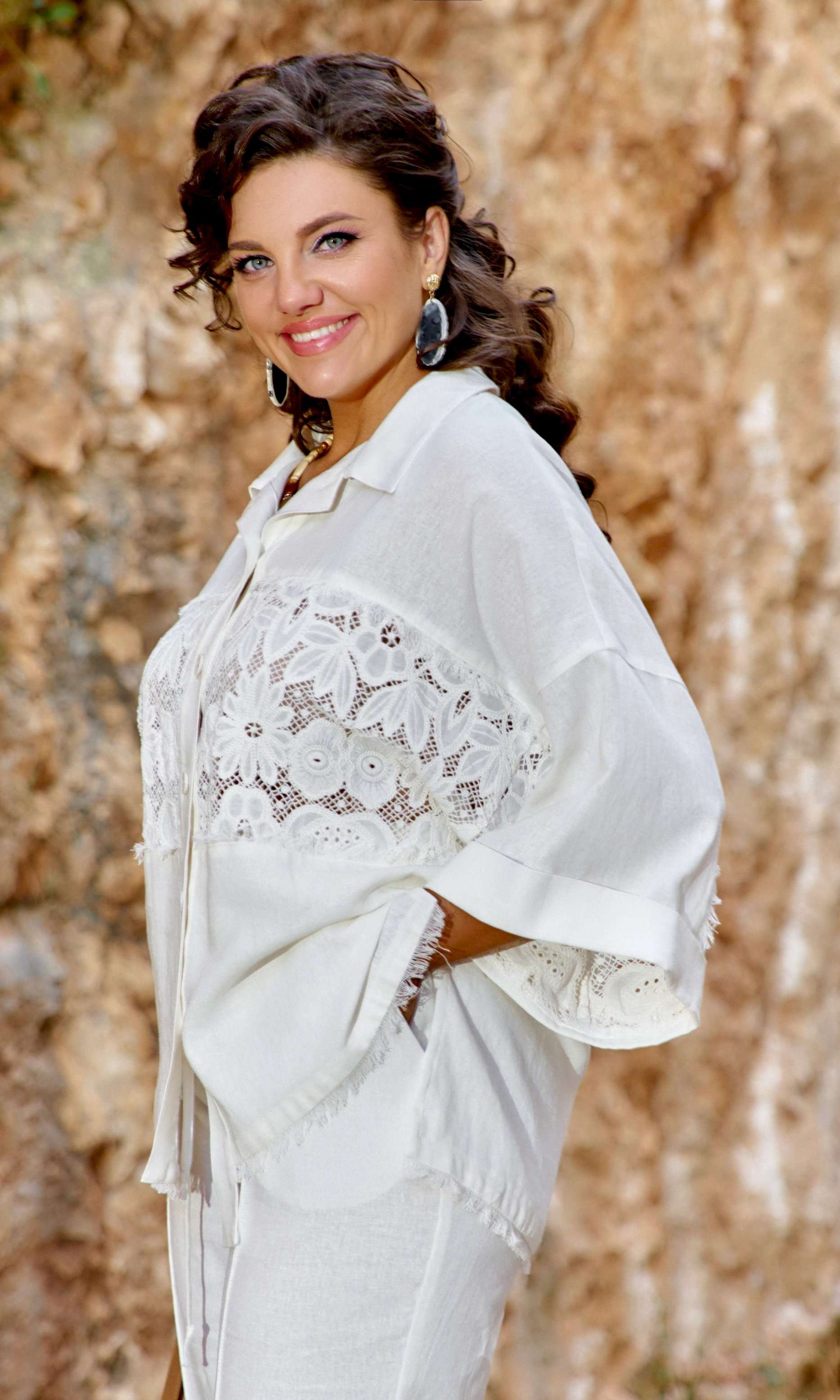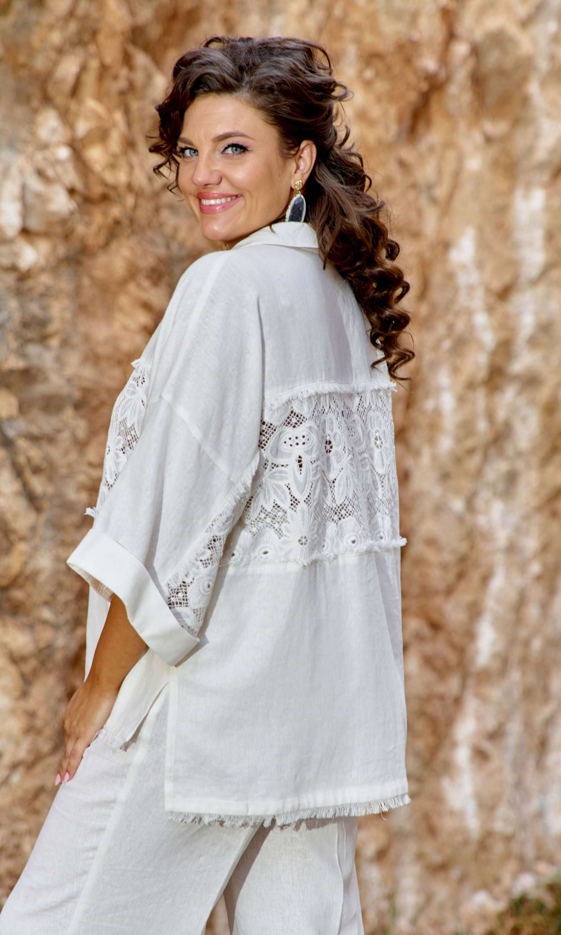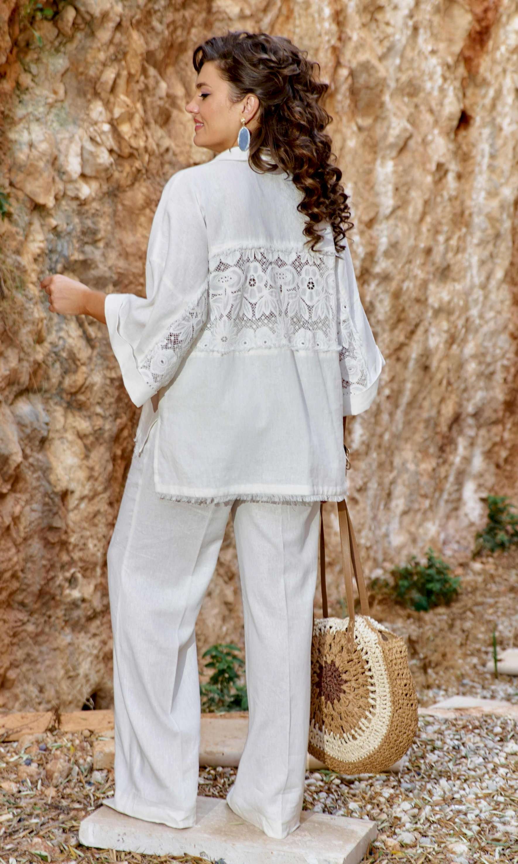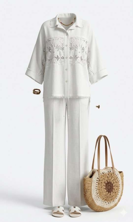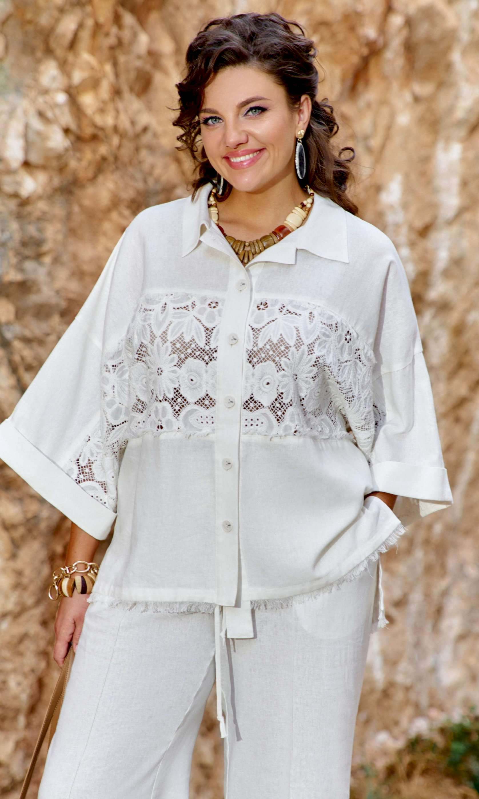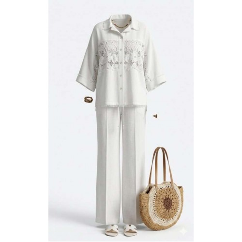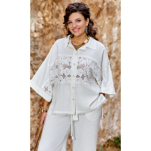Этот костюм словно создан для тех, кто ценит гармонию между комфортом и элегантностью, между современными тенденциями и вечными классическими нотами. Блузка свободного силуэта, «оверсайз», с центральной застёжкой на петли-пуговицы по планке (нижняя планка длиннее), отложным воротником рубашечного типа. По центральной части блузки по переду и спинке декоративная вставка из кружевного ришелье «на просвет» с дополнительной отделкой из бахромы. Спинка без особенностей. Линия плеча спущенная. Рукав втачной, длиной 7/8, с декоративной вставкой из ришелье и отделкой в виде бахромы по внутренней части рукава. По низу рукаваотложная манжета. Низ блузки ассиметричный с разрезами в боковых швах и отделкой в виде бахромы. Брюки прямого силуэта с притачным поясом с эластичной тесьмой-резинкой, которая обеспечивает максимально удобную посадку на любой тип фигуры. В поясе брюк в качестве декоративного элемента шнур из основной ткани. По переду брюк прорезные карманы и застроченные канты, которыевизуально вытягивают силуэт. Обращаем Ваше внимание, что фурнитура может незначительно отличаться от фото.