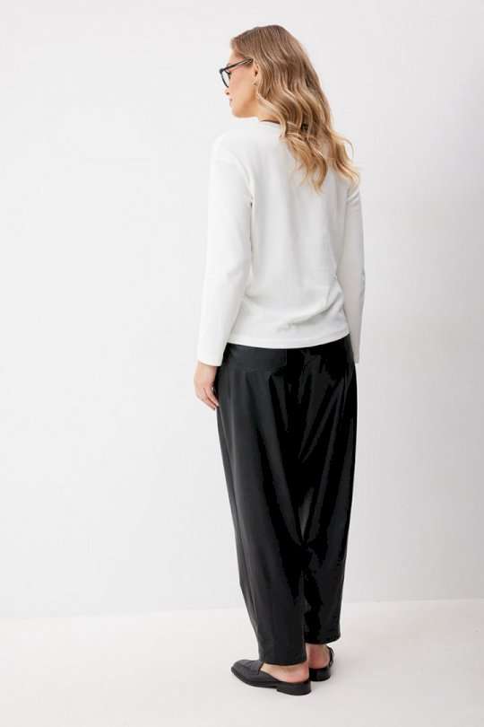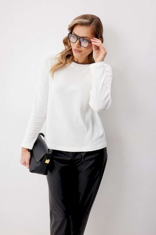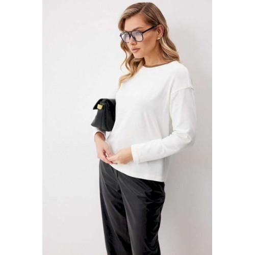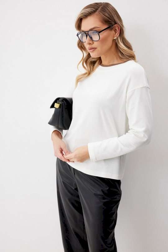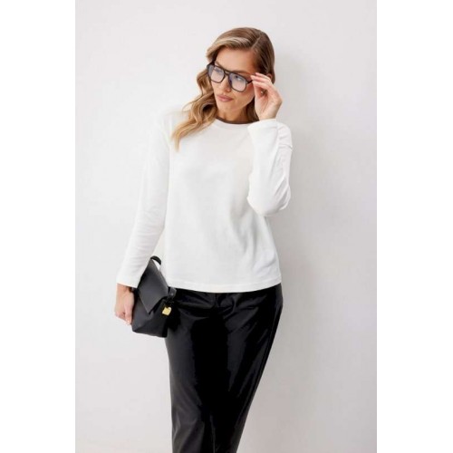Блуза женская прямого силуэта из трикотажной ткани длиной до линии бедра. Линия плеча спущена, рукав втачной одношовный. Горловина округлой формы, обработана притачным довязом. Длина спинки изделия 62 см, длина руква от горловины 74 см.