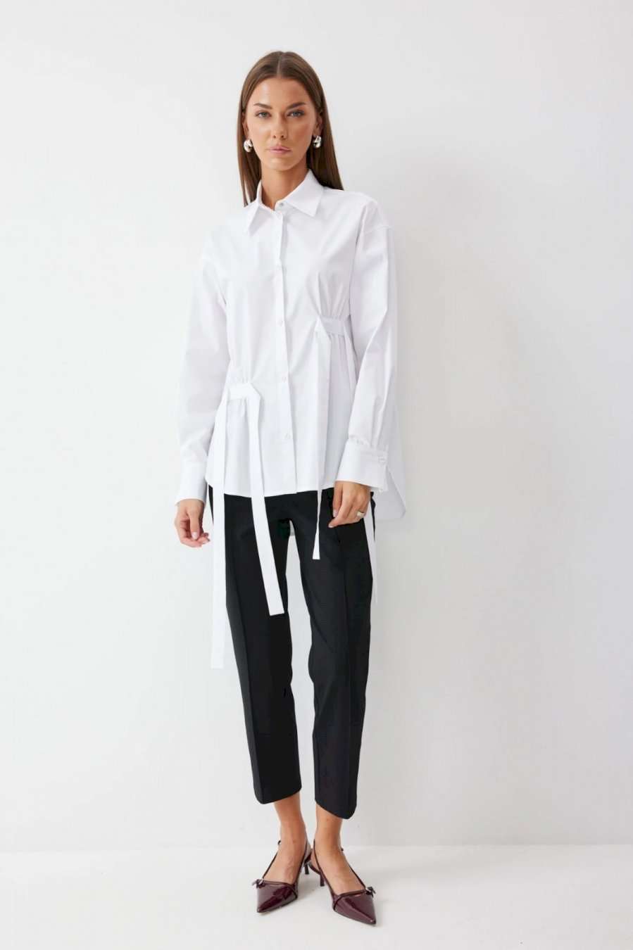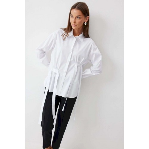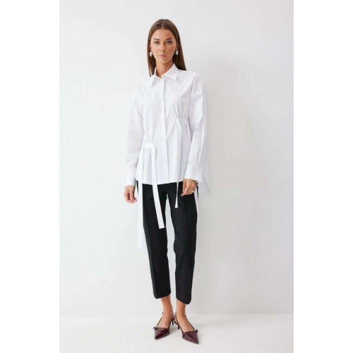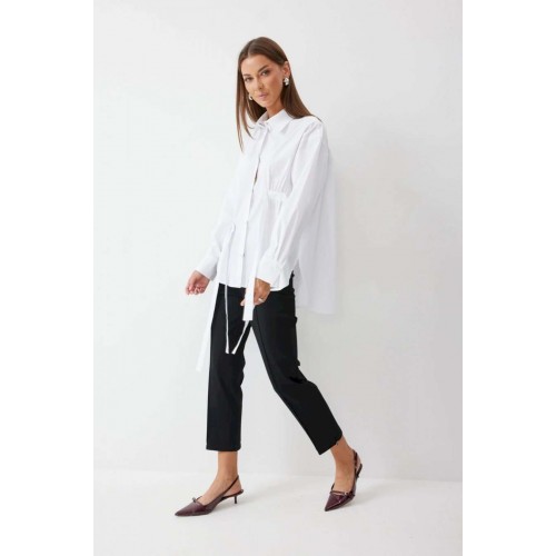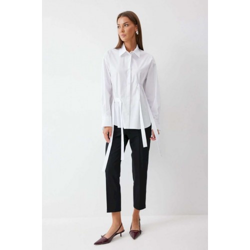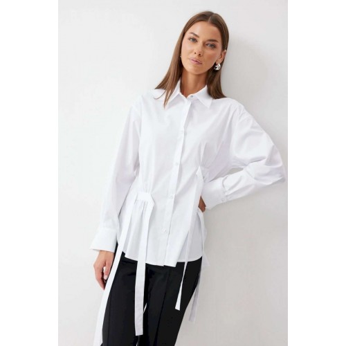 Блузка прямого силуэта из хлопковой ткани с фигурным низом. Воротник рубашечного типа по центру с застежкой на кнопки. Рукав со спущенной линией плеча, по низу манжета с застежкой на кнопку. На спинке кокетка и складки. По переду декоративные элементы со сборкой. Обращаем ваше внимание, что фурнитура может отличаться от фото.