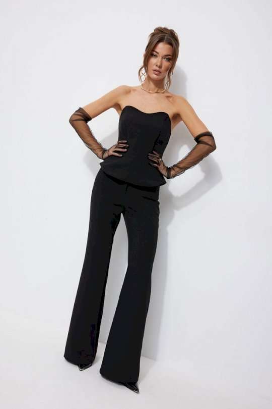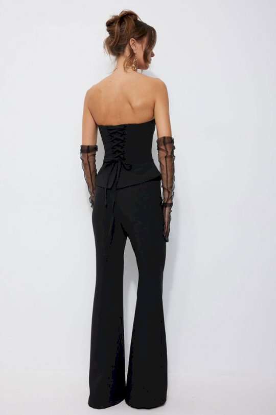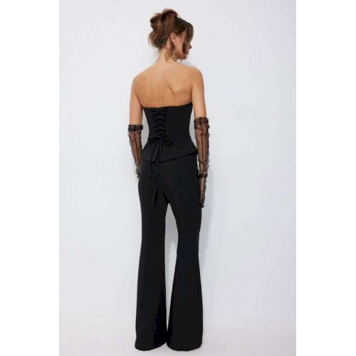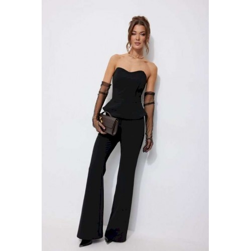 Корсет прилегающего силуэта из костюмной ткани. По переду лифа фигурный вырез. По переду и спинке рельефы. Корсет отрезной по линии талии. На спинке декоративный элемент со шнуровкой корсетного типа для регулирования степени прилегания. Корсет на косточках с корсетными чашками. Корсет на подкладке. Длина блузы по спинке 30 см.