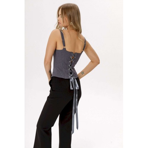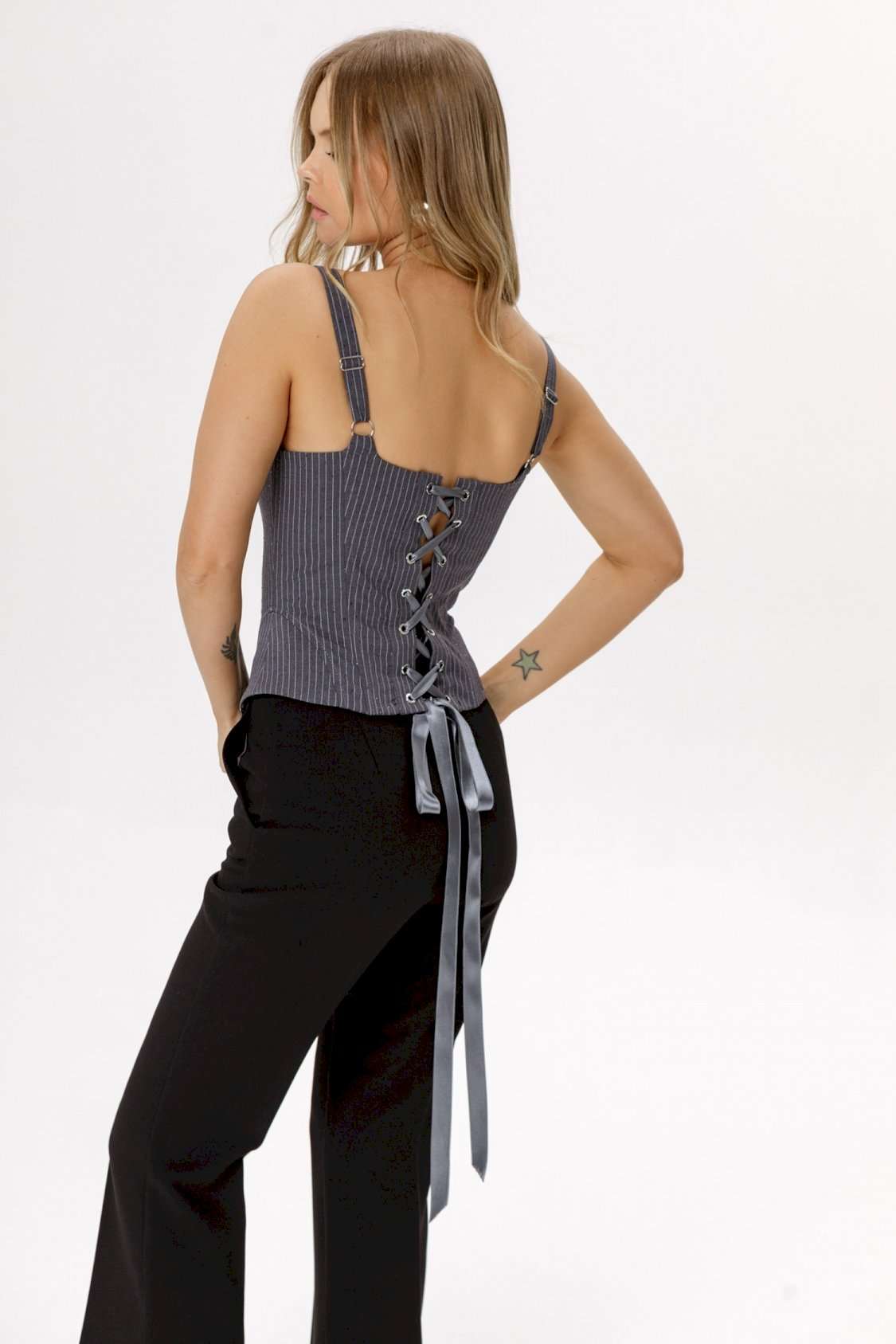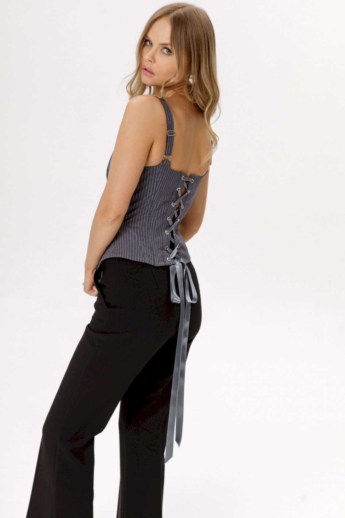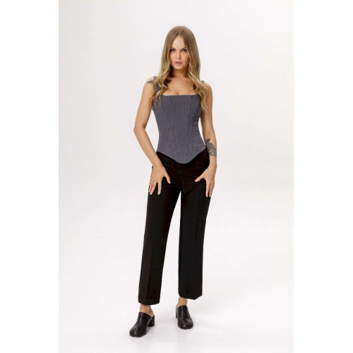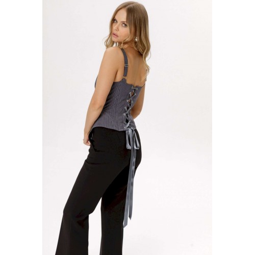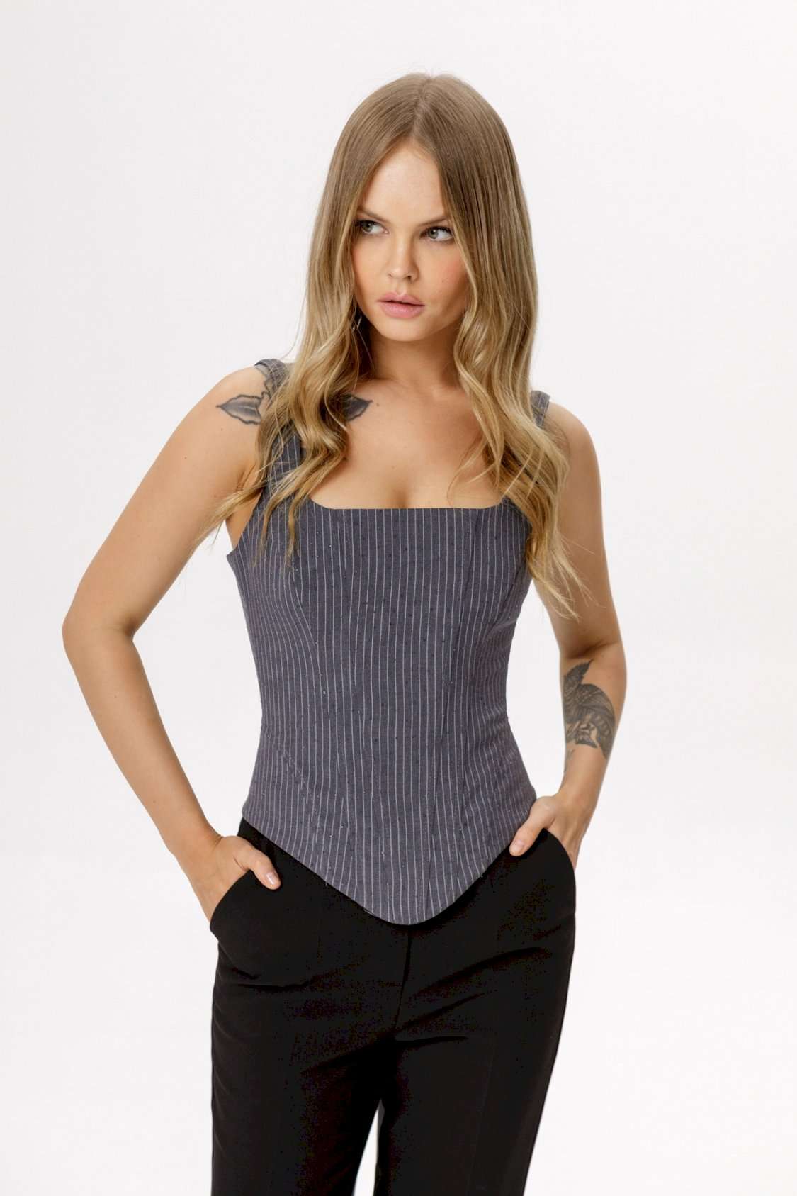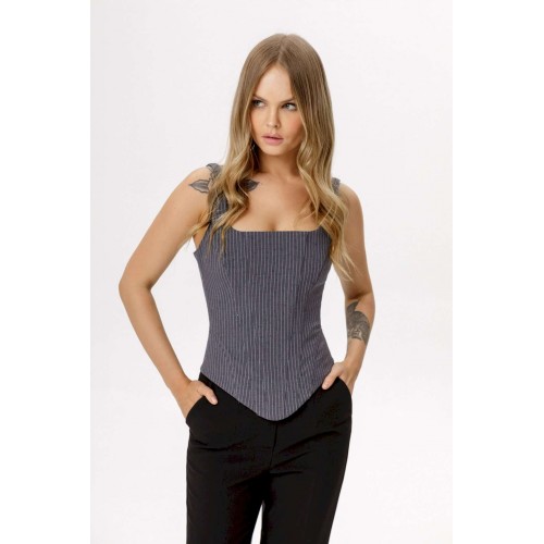 Корсет с глубоким квадратным вырезом из костюмной ткани в тонкую полоску со стразами. Детали: прилегающий силуэт, фигурный вырез переда и спинки, рельефные швы с регилиновыми вставками, фигурный низ, застежка-шнуровка по спинке, регулируемые бретели. Длина корсета по боковому шву около 30 см в размерах 40-46 и около 31 см в размерах 48-52.