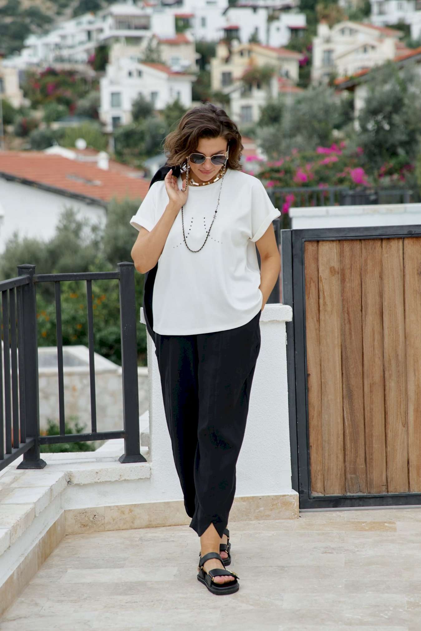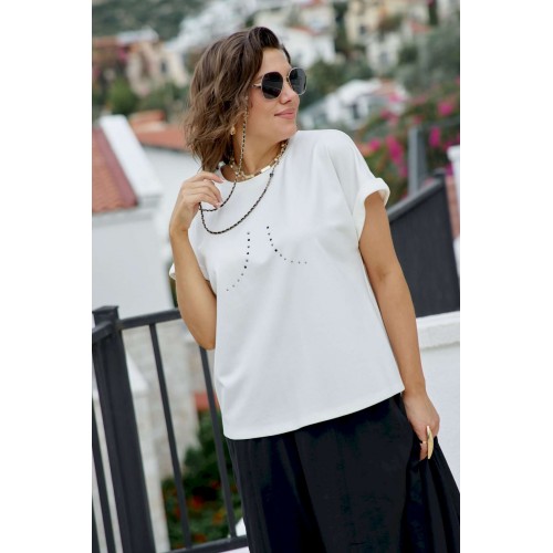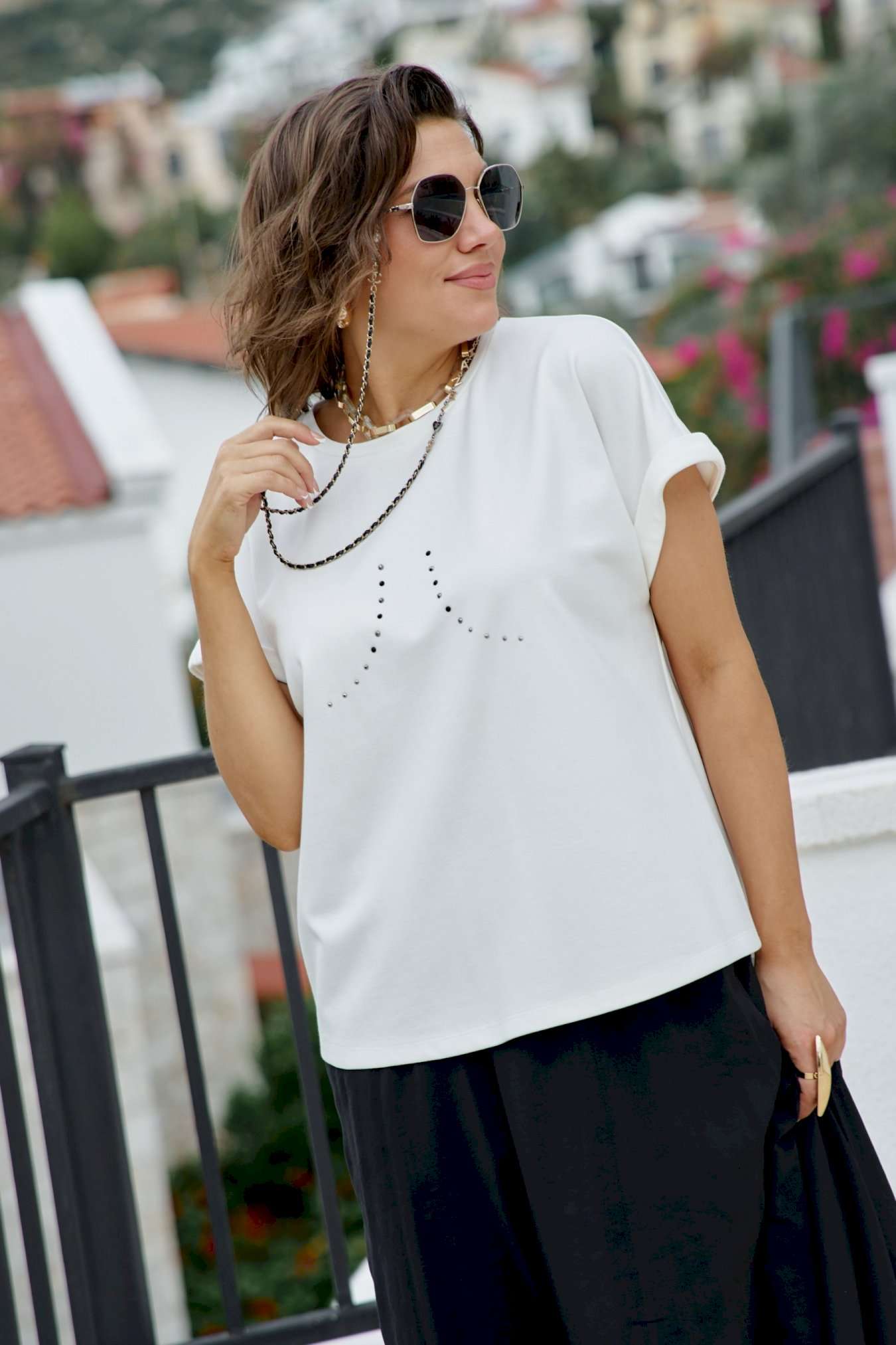Блуза из трикотажа, немного расширена к низу, с цельнокроеными рукавами и отворотами. Спереди выполнена аппликация из страз разного размера. Блуза подойдет для прогулок, посиделок с друзьями, похода в кафе и отдыха. Модель свободного кроя органично впишется в гардероб, всегда будет элегантной и уместной, эта модель «вне времени» и будет актуальна в следующих сезонах. Блуза комфортна в носке на каждый день, создает женственный, игривый и элегантный образ. Мы используем материалы высокого качества, делаем акцент на фигуру и современный крой, что позволяет нашим изделиям не терять актуальности, а для вас служить выгодным приобретением. Длина блузы 62 см, длина рукава 26,5 см (р 52-56), 29,5 см (р 58-62).