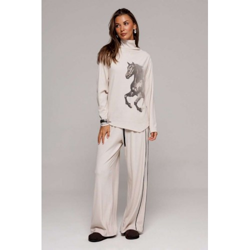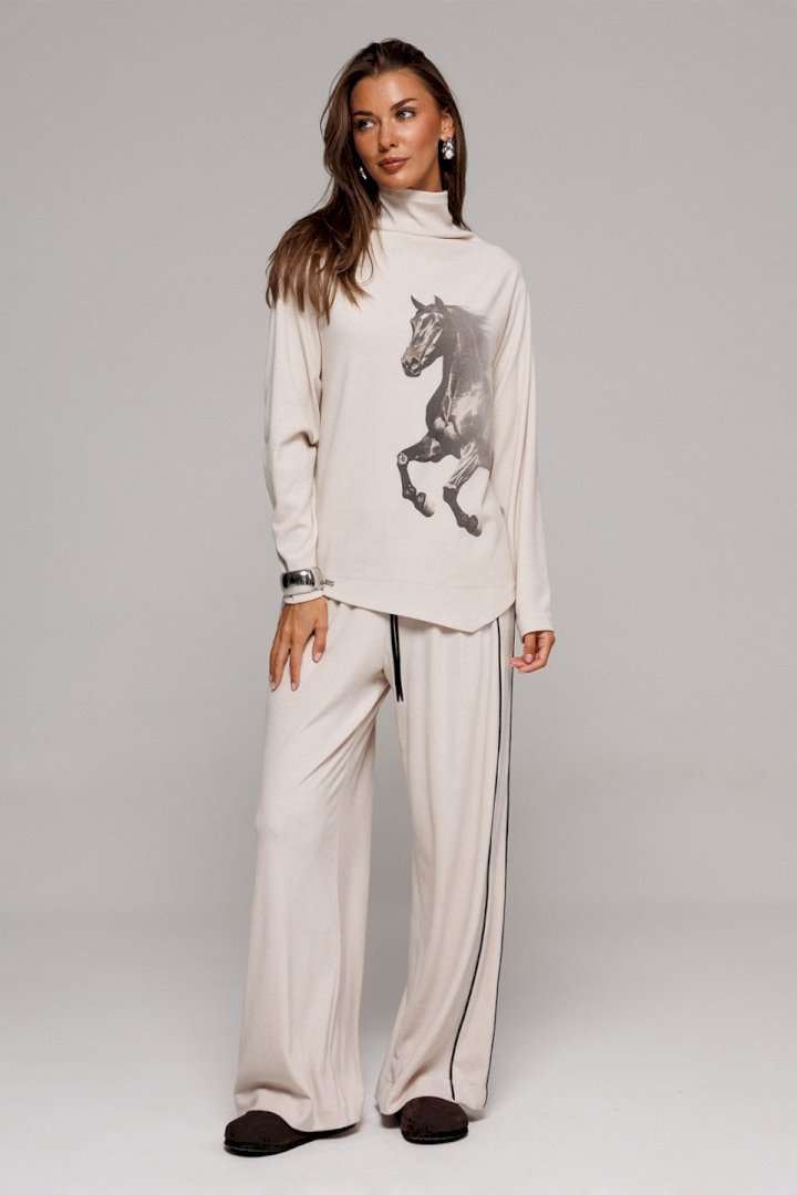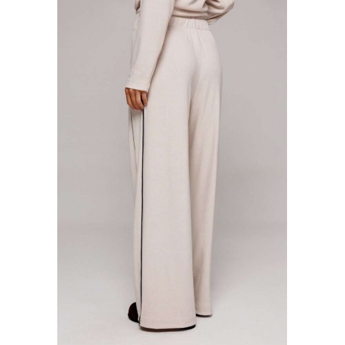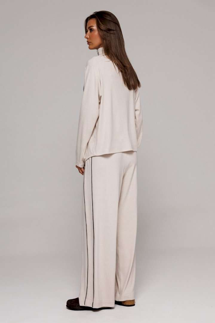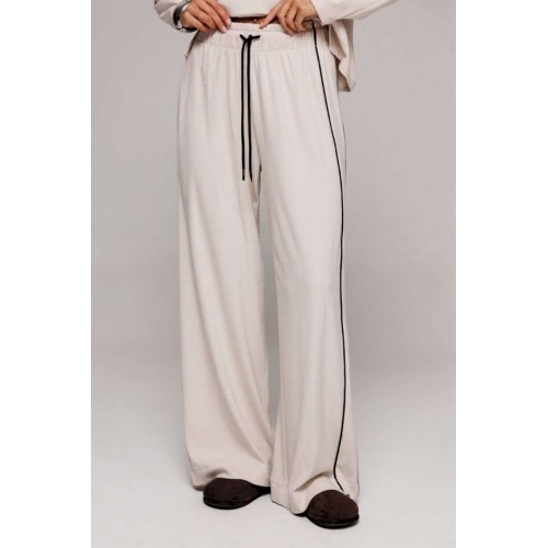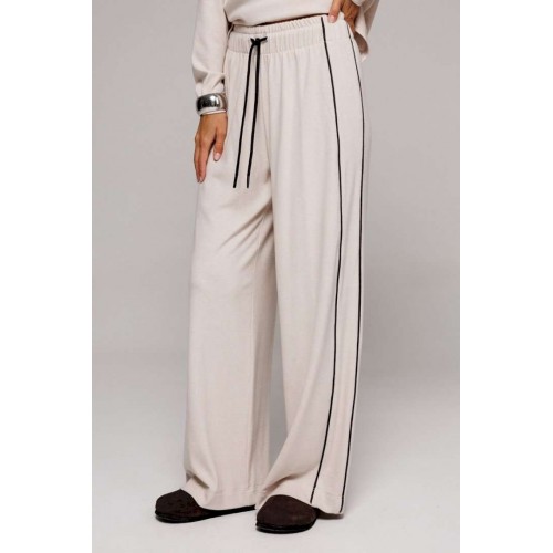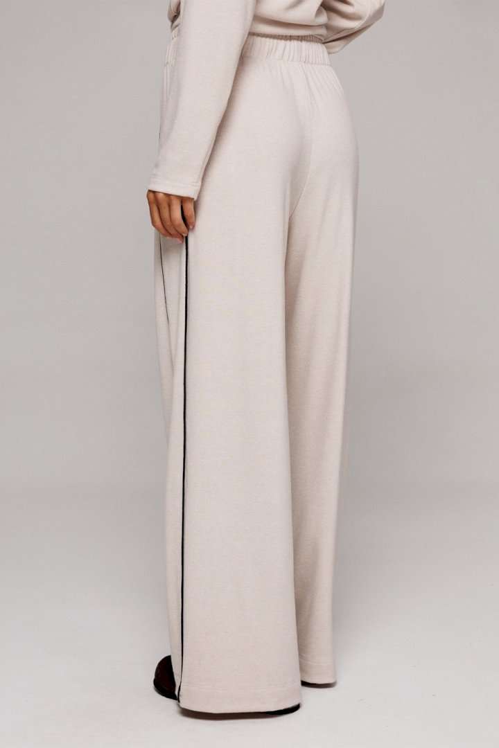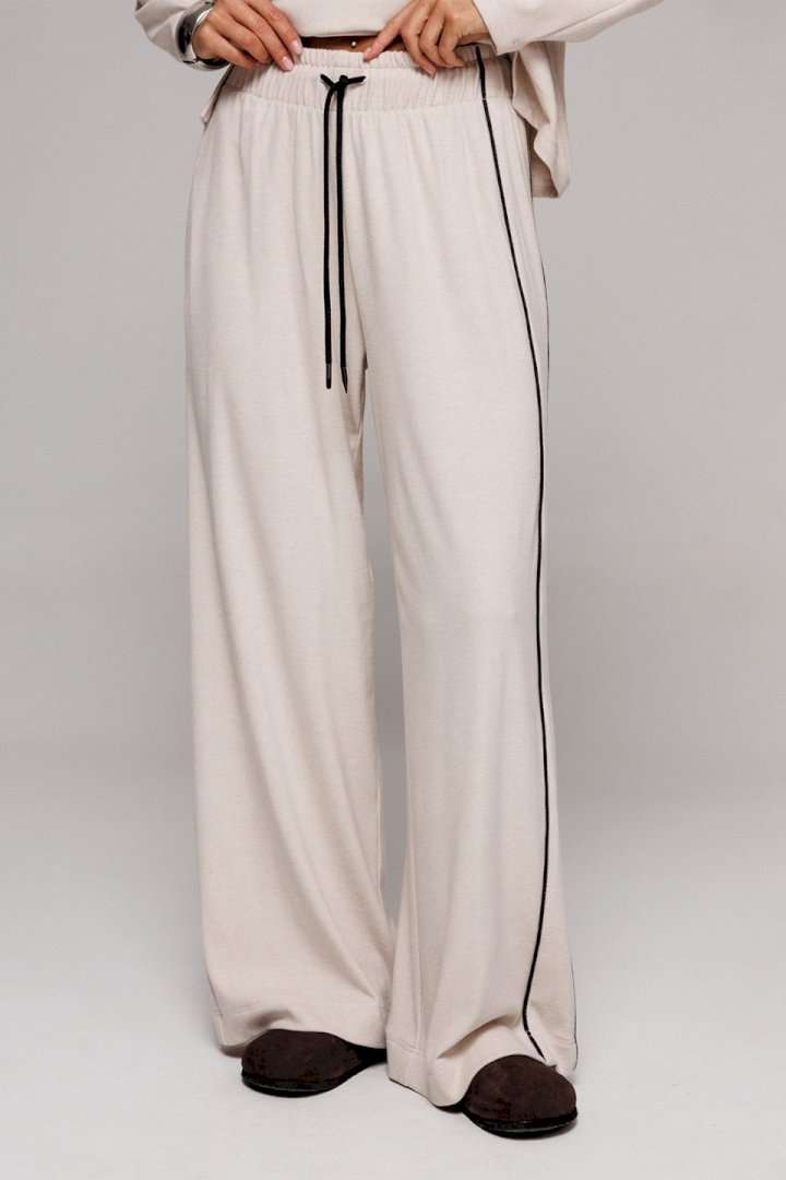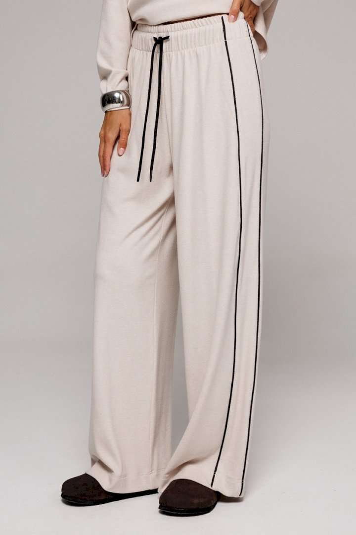 Элегантные бежевые трикотажные брюки прямого кроя. Оснащены удобным цельнокроеным поясом с внутренней резинкой и декоративным шнурком для регулировки посадки. Дизайн дополнен отрезным боковым кантом с правой стороны и удобным карманом на левом боку. Идеальный выбор для создания стильного и комфортного образа.