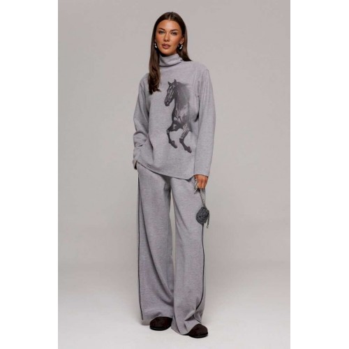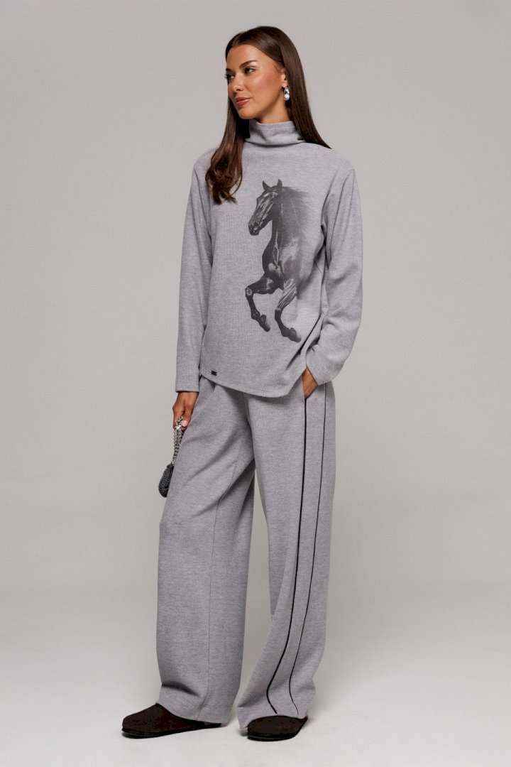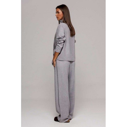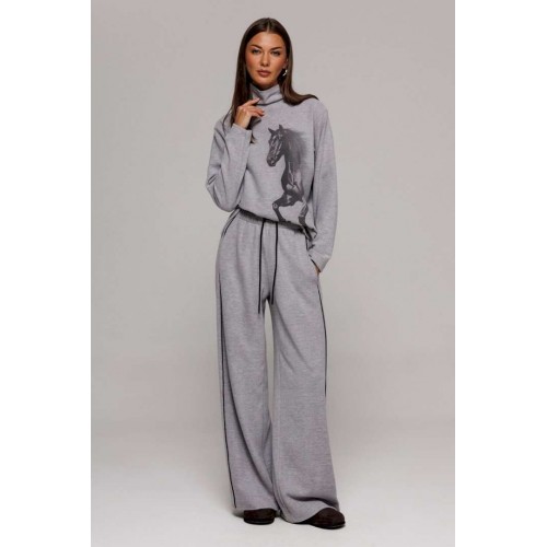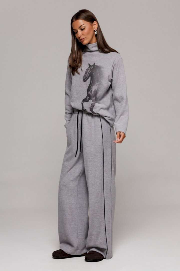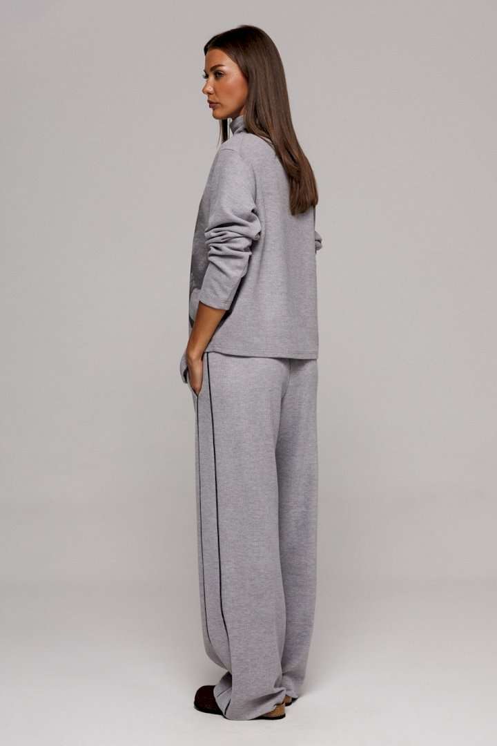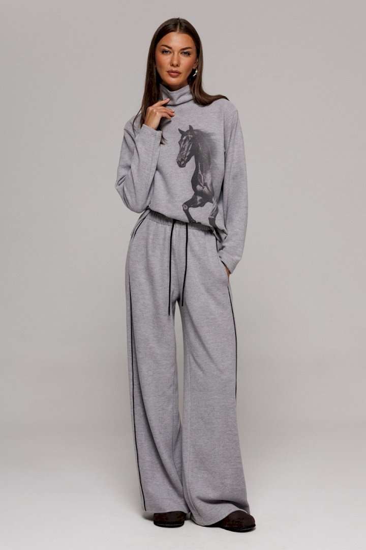 Брюки из трикотажного полотна с велюровым эффектом прямого силуэта на цельнокроеном отстроченном поясе со вставленной в него резинкой и декоративным шнурком. По бокам отрезной бочок с кантом и карманом в шве притачивания бочка.