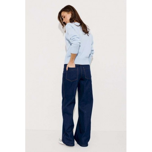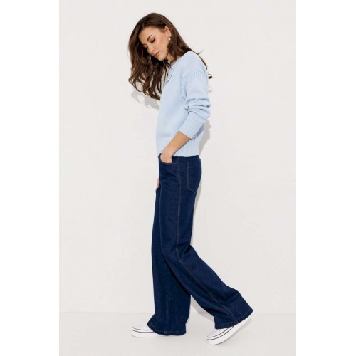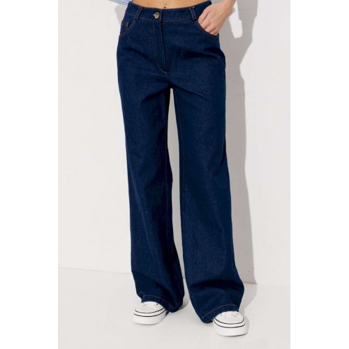 Брюки-джинсы прямого силуэта. На притачном поясе со шлёвками, застежкой-гульфик. Пояс застегивается на петлю-пуговицу. По переду карманы. По спинке кокетка, накладные карманы.