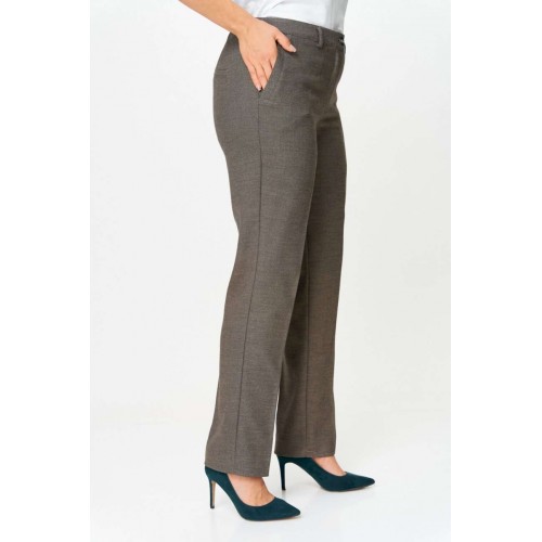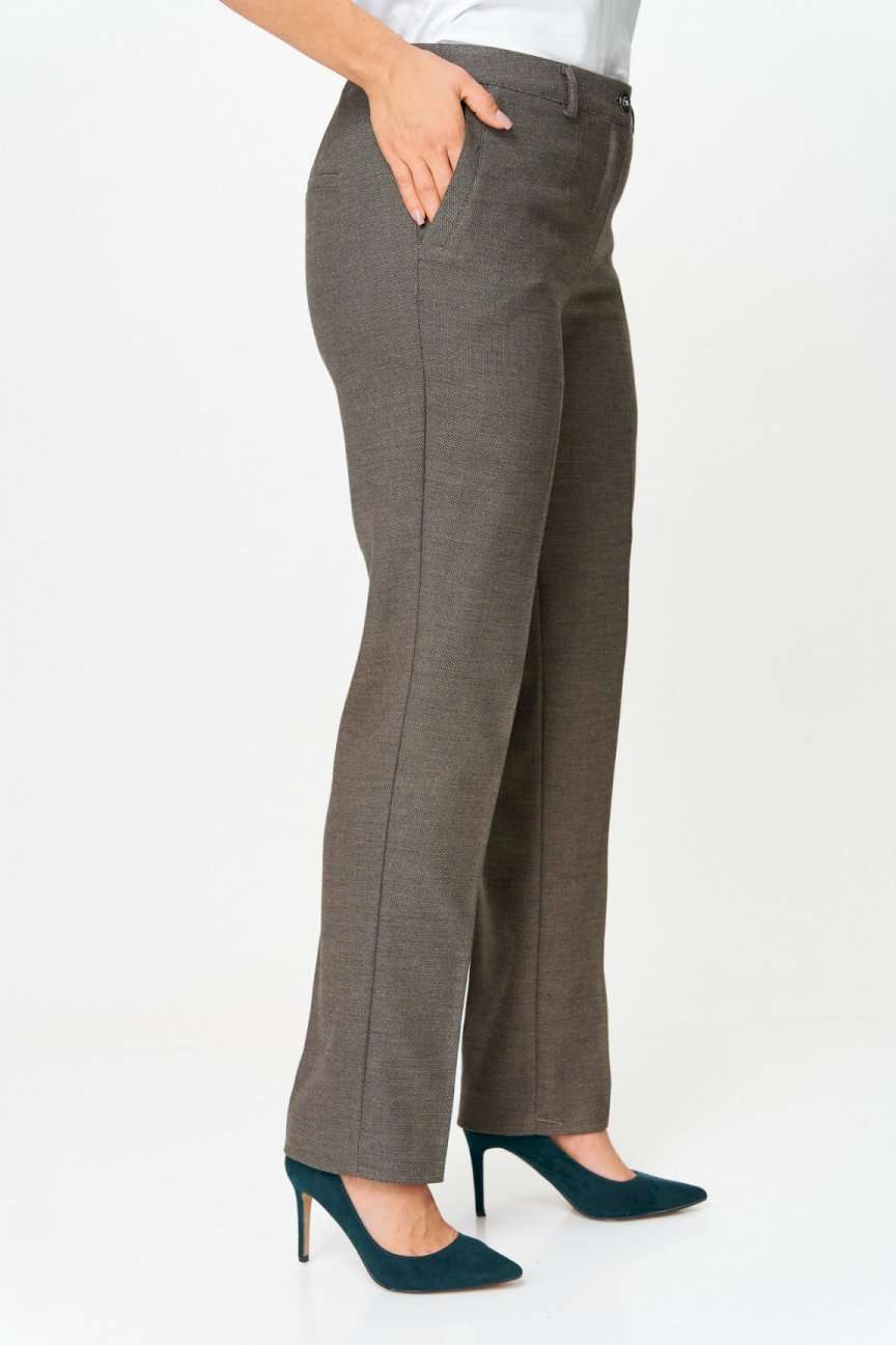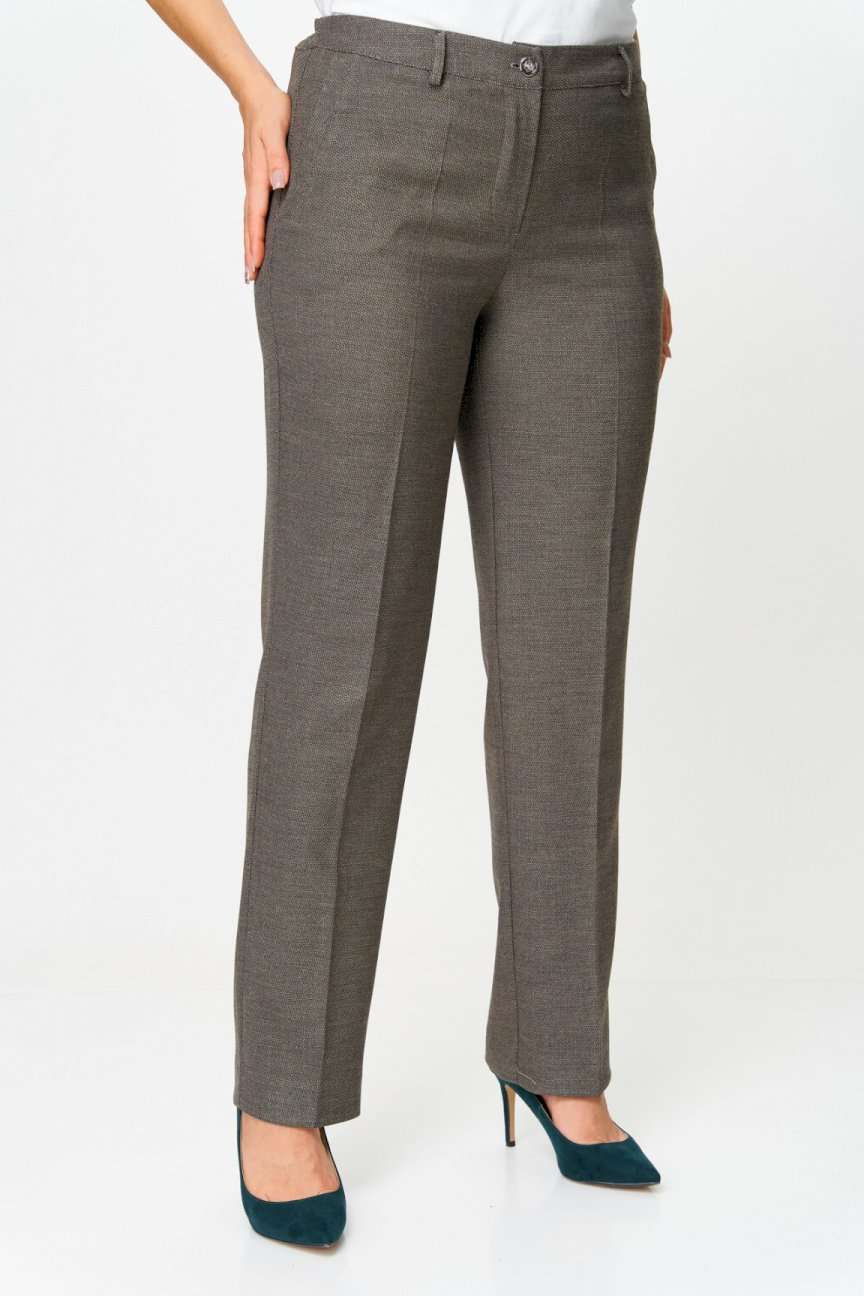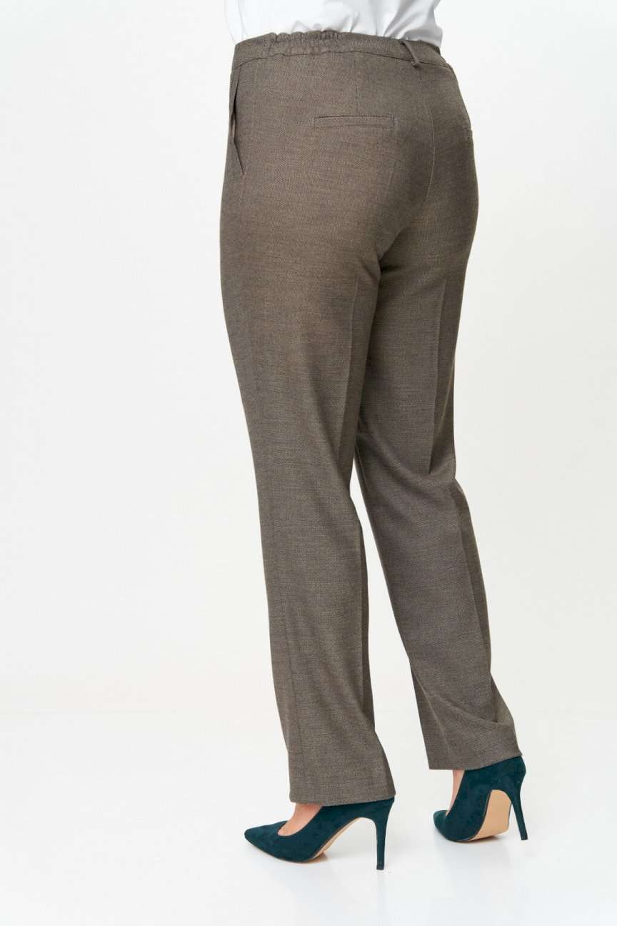 Брюки прямые, классические, с заутюженными стрелками, по переду обработаны карманы с отрезным бочком, застежка на тесьму-молнию и 1 пуговицу. На задних половинках обработаны вытачки и имитация карманов с листочкой, пояс в брюках притачной, по боковым швам резинка. Длина брюк от талии по боковому шву 103 см.