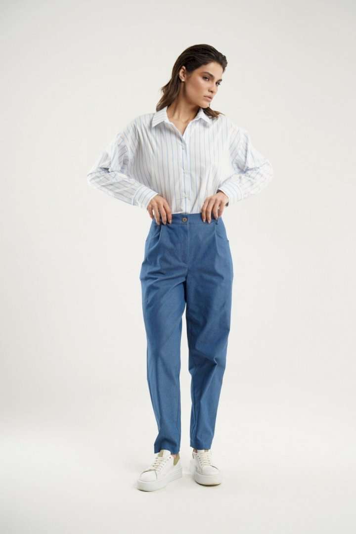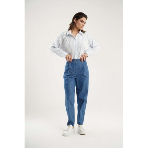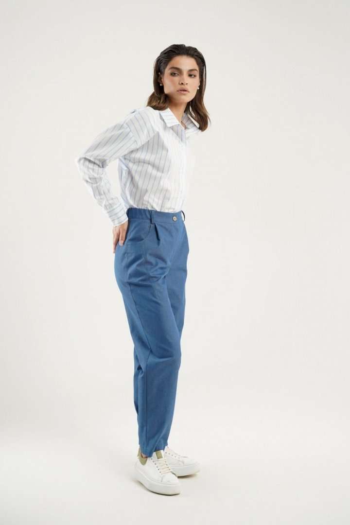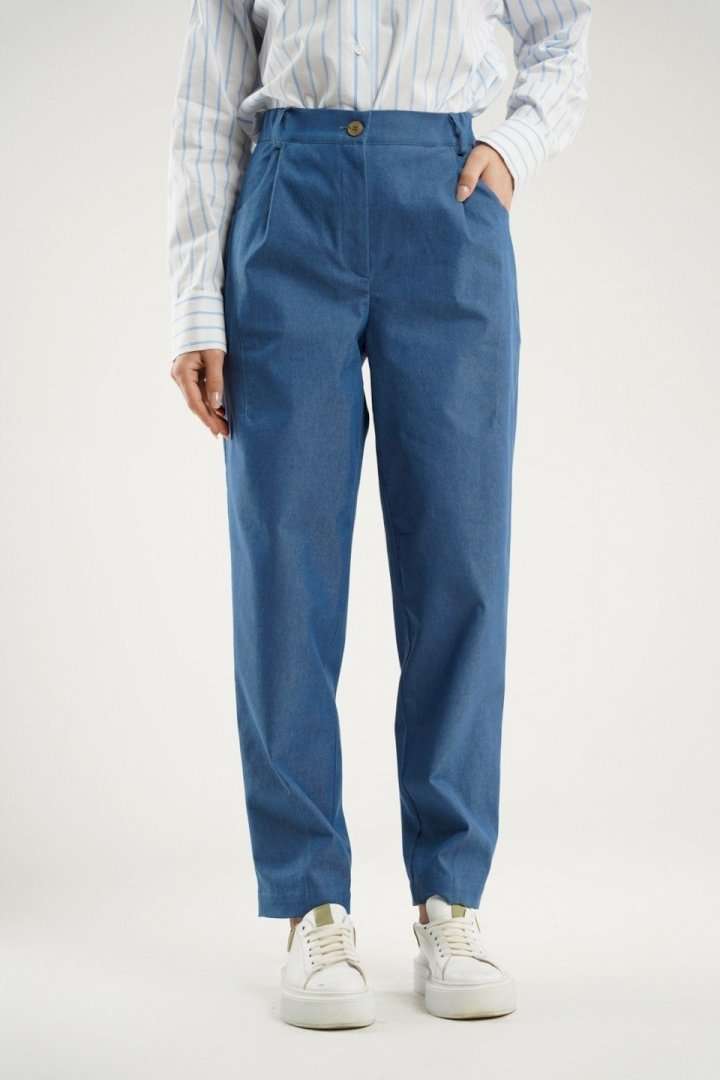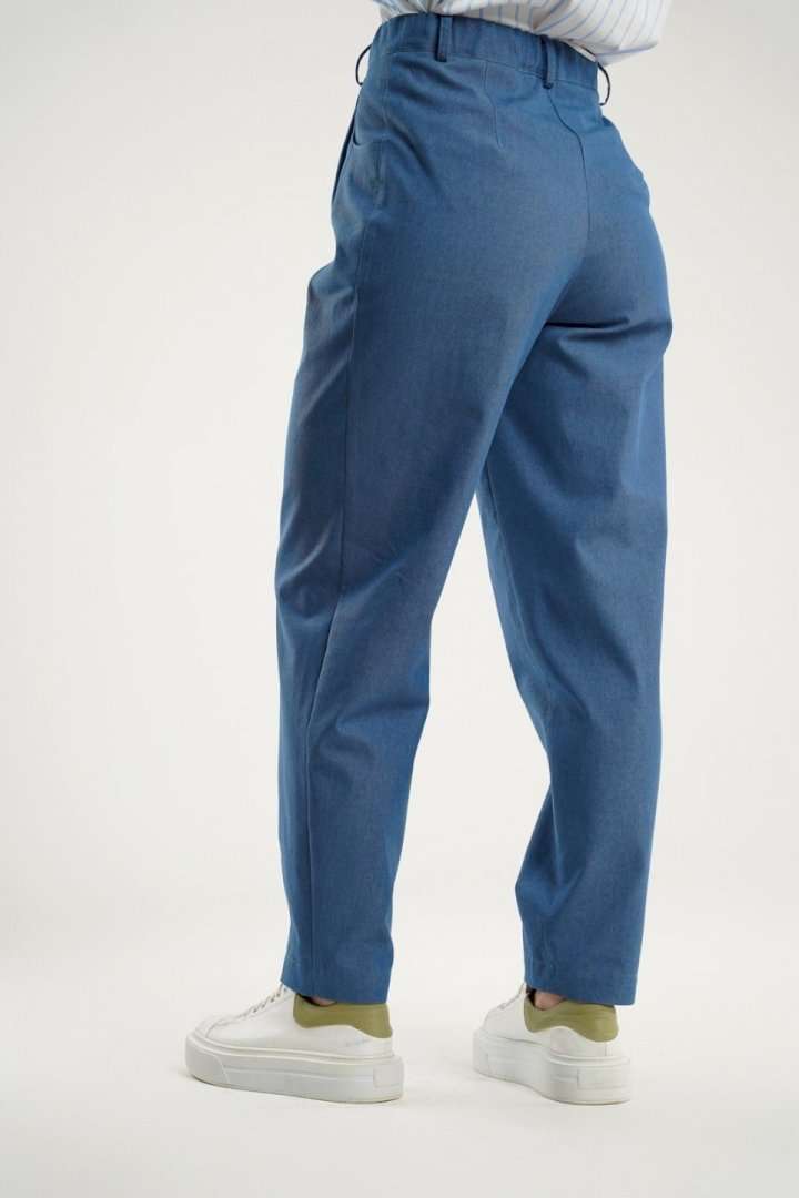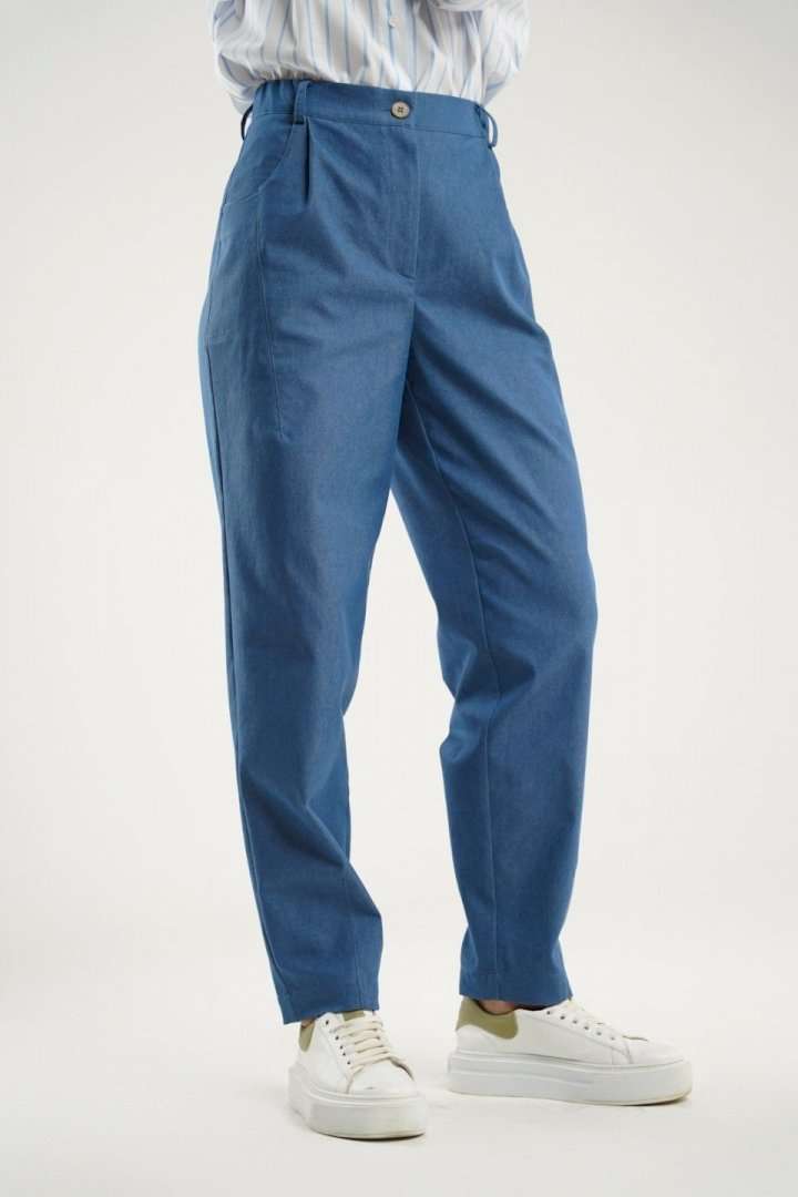 Брюки - бананы заужены к низу и украшены интригующими декоративными выточками на коленях и по низу. Фигурные карманы в боковых швах добавляют удобства, в то время как отрезной пояс с эластичной тесьмой обеспечит идеальную посадку. Модель застегивается на молнию с петлей и пуговицей, обеспечивая легкость при надевании. Эти брюки прекрасно сочетаются как с классическими блузами, так и с более свободными топами, делая их универсальным выбором для вашего гардероба.