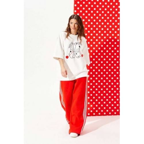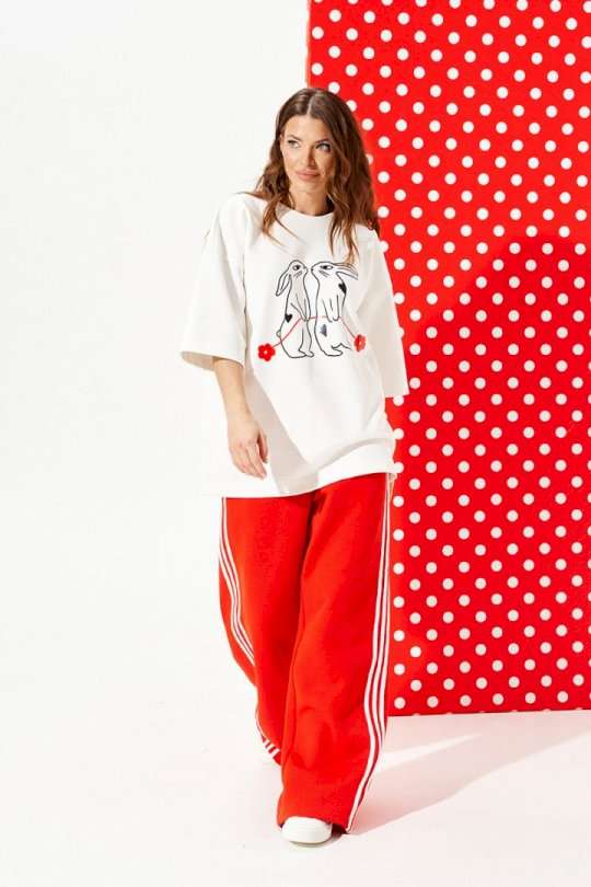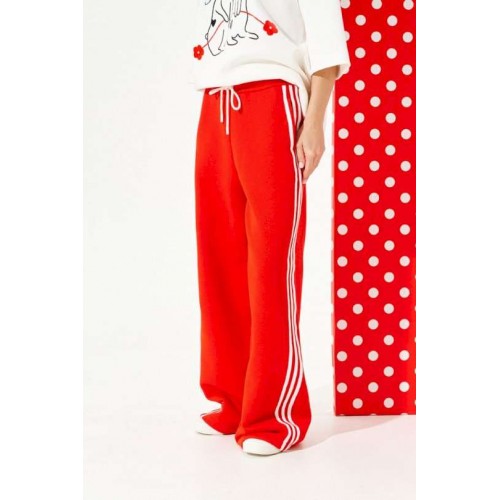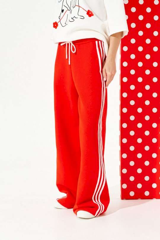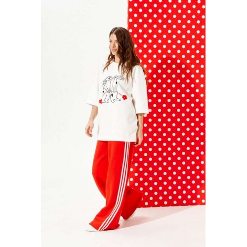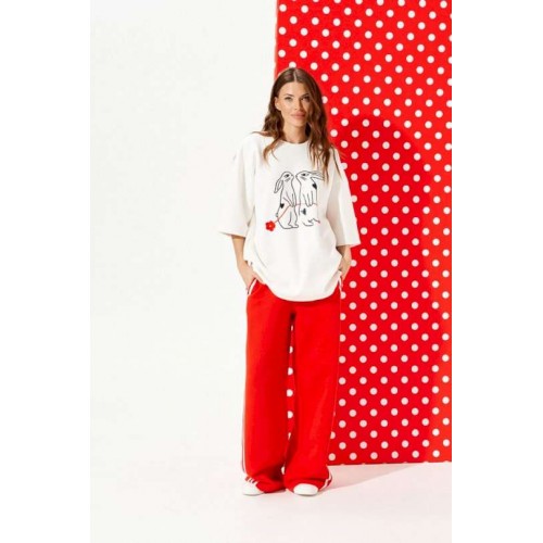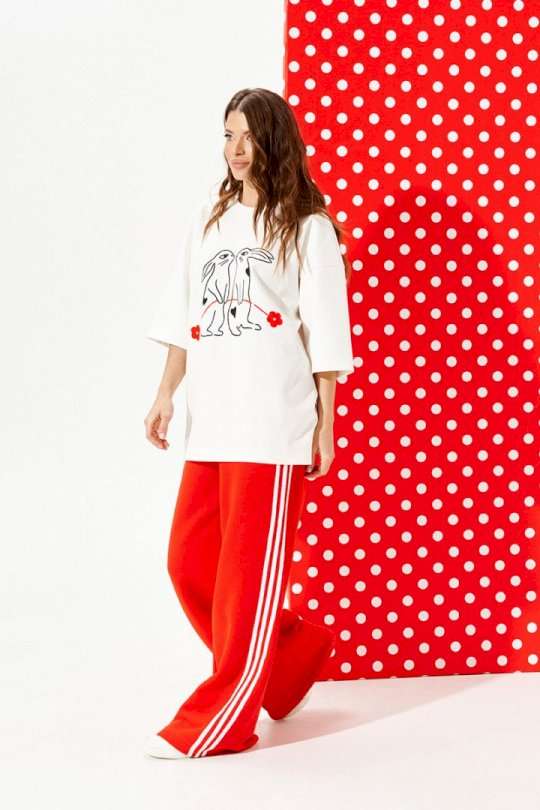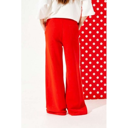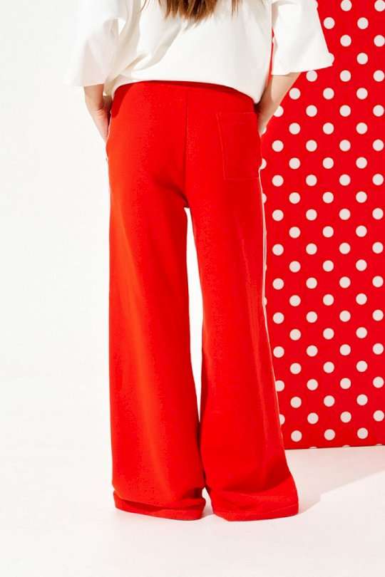 Брюки из трикотажного полотна свободного объема, прямого силуэта. В боковых швах расположены карманы. Пояс притачной на резинке. По поясу проложены отделочные строчки, образующие кулиску, в которую продет шнур-завязка с наконечниками. На правой задней половинке брюк накладной карман. Боковые швы, детали переда и спинки декорированы декоративной тесьмой.