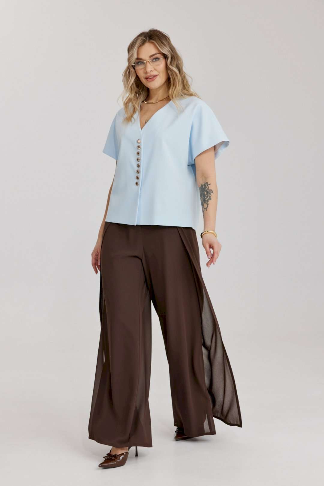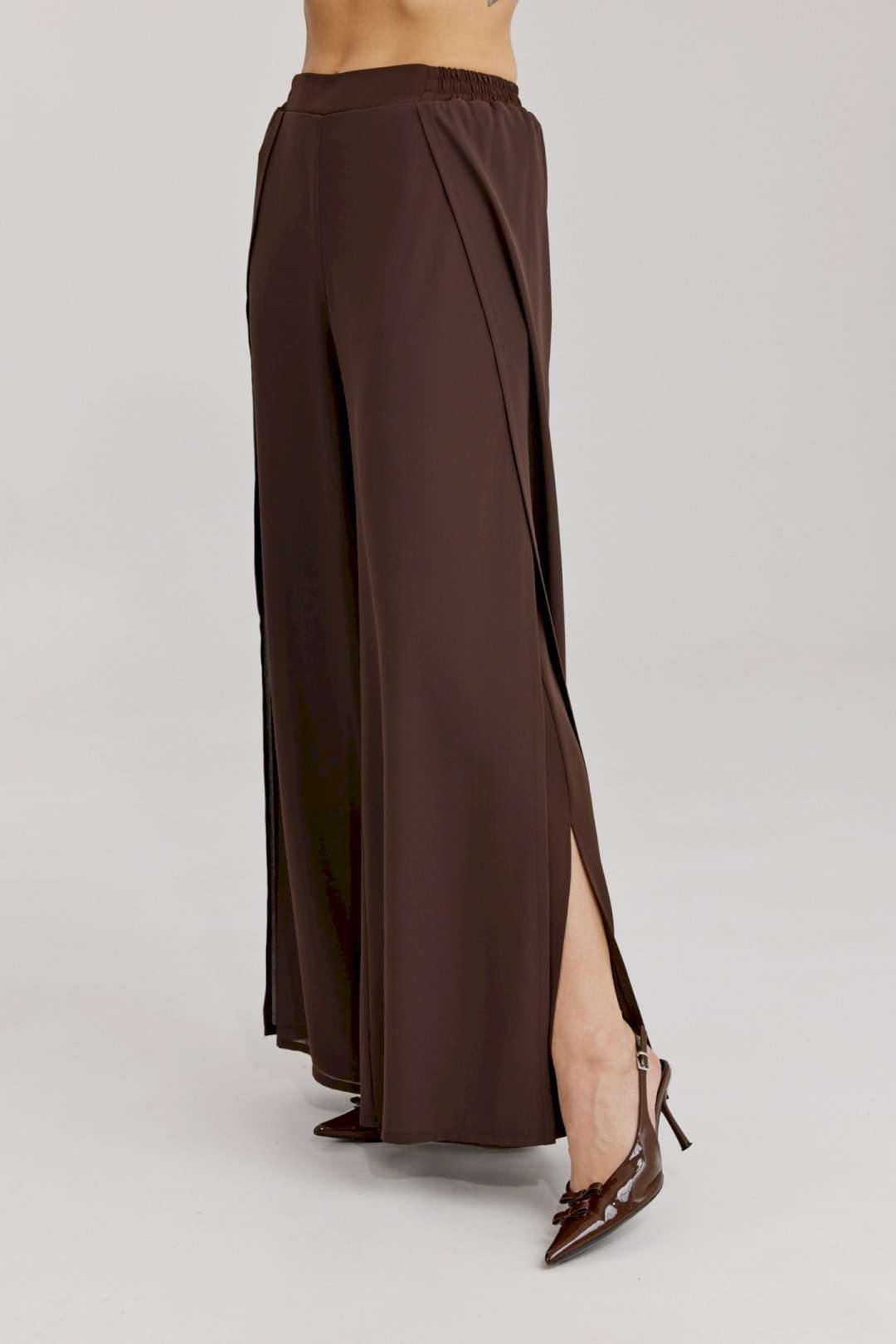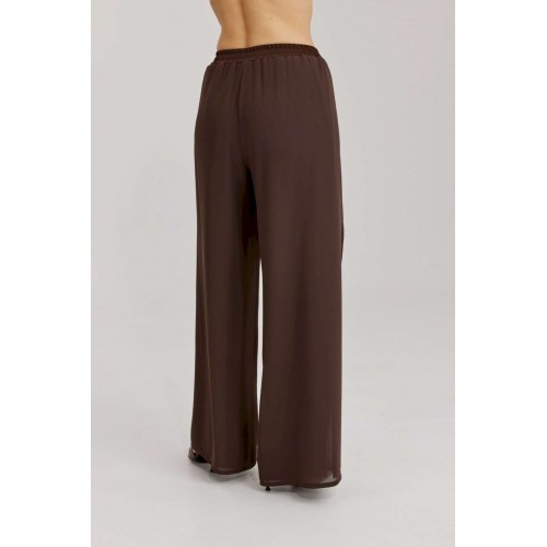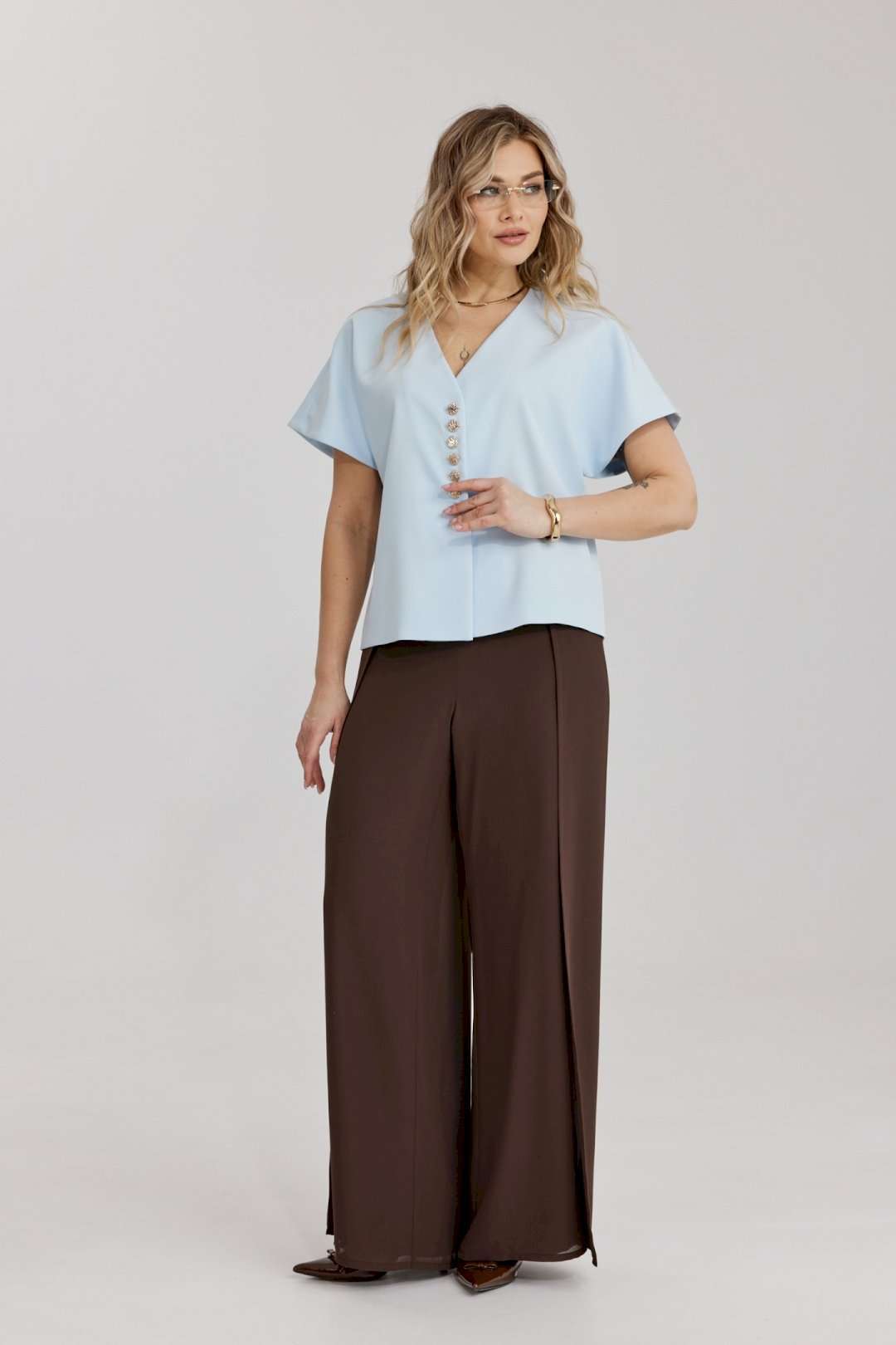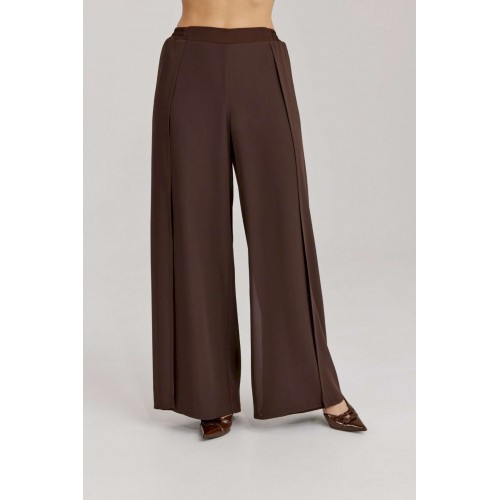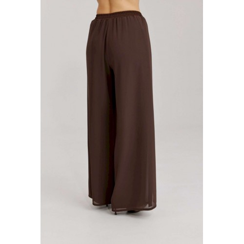 Брюки прямого силуэта, выполнены из шифоновой ткани на подкладке полной длинны. Боковой шов брюк открыт. Синка брюк заходит на перед по верхней части. Подкладка из не просвещающейся креповой ткани. Верх брюк обработан отрезным поясом. Центральная часть пояса без резинки, остальной пояс на резинке. Низ брюк обработан швом « в подгибку».