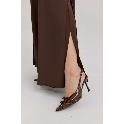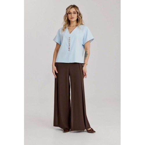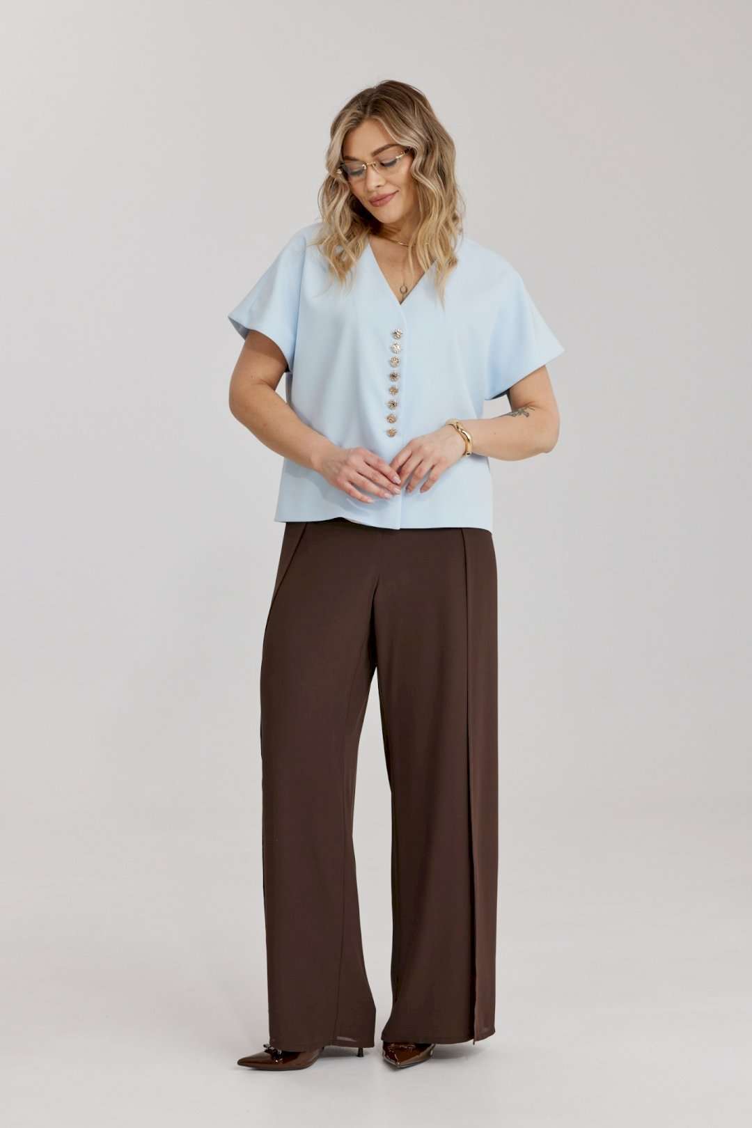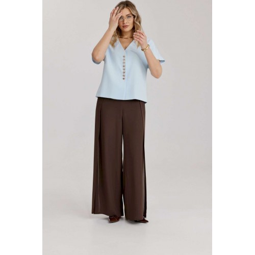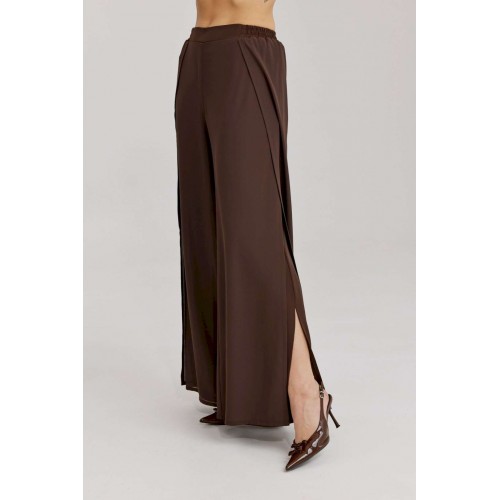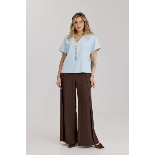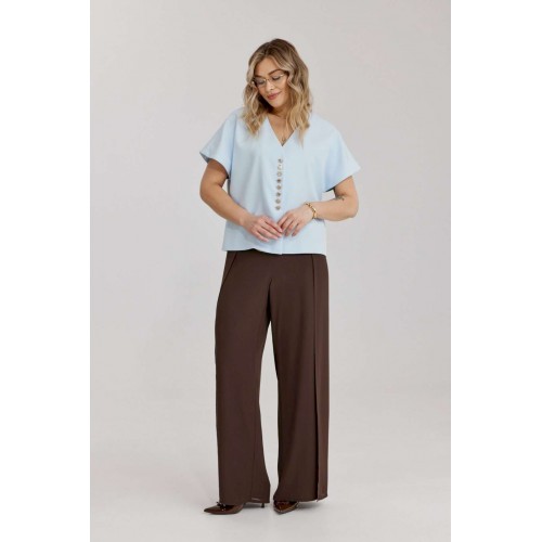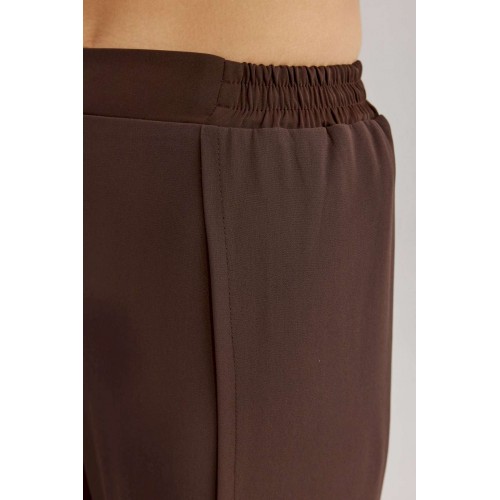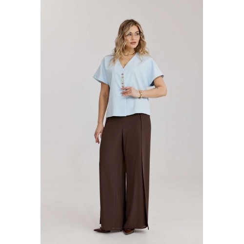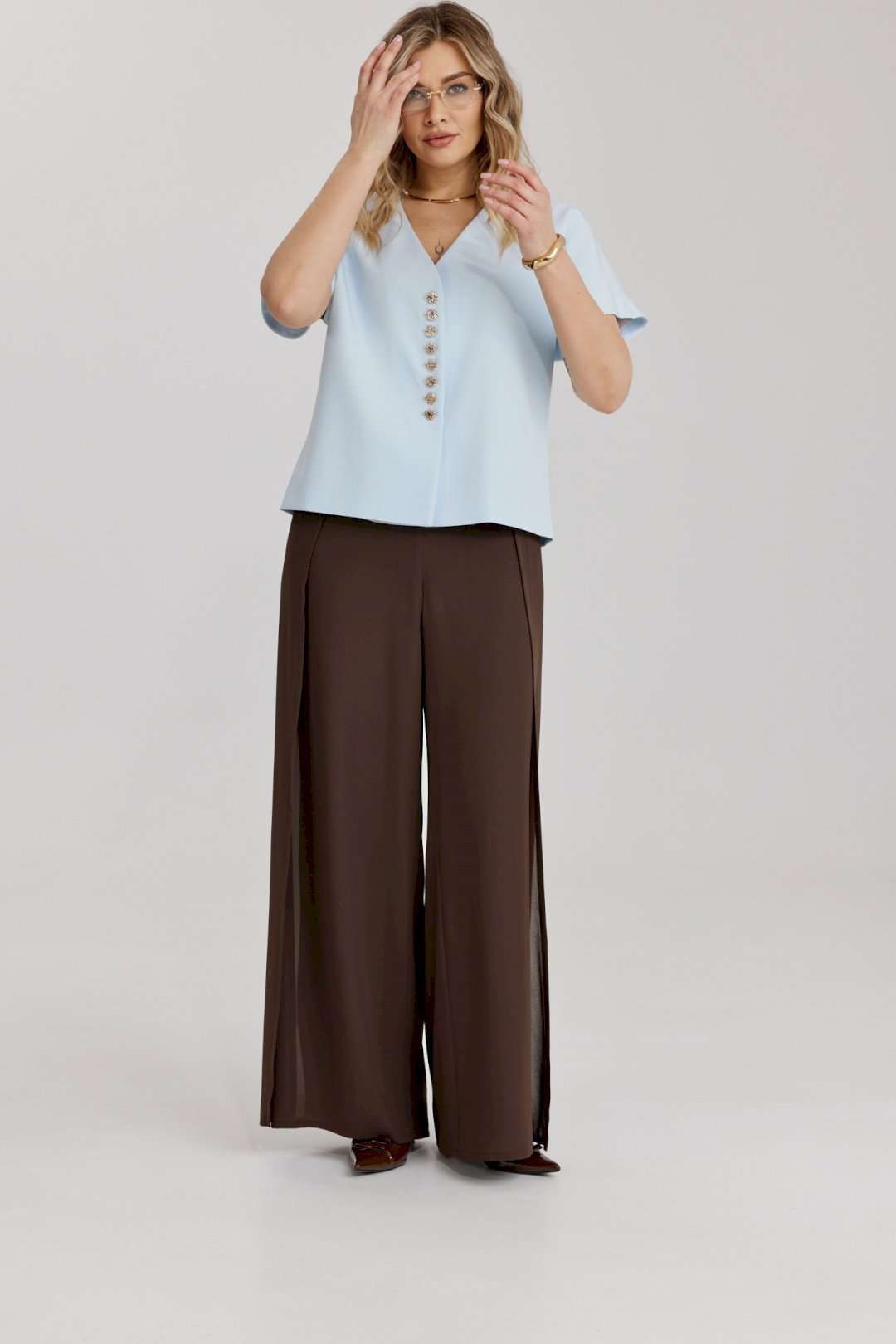 Брюки прямого силуэта, выполнены из шифоновой ткани на подкладке полной длинны. Боковой шов брюк открыт. Синка брюк заходит на перед по верхней части. Подкладка из не просвещающейся креповой ткани. Верх брюк обработан отрезным поясом. Центральная часть пояса без резинки, остальной пояс на резинке. Низ брюк обработан швом « в подгибку».