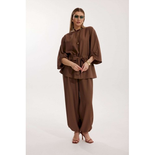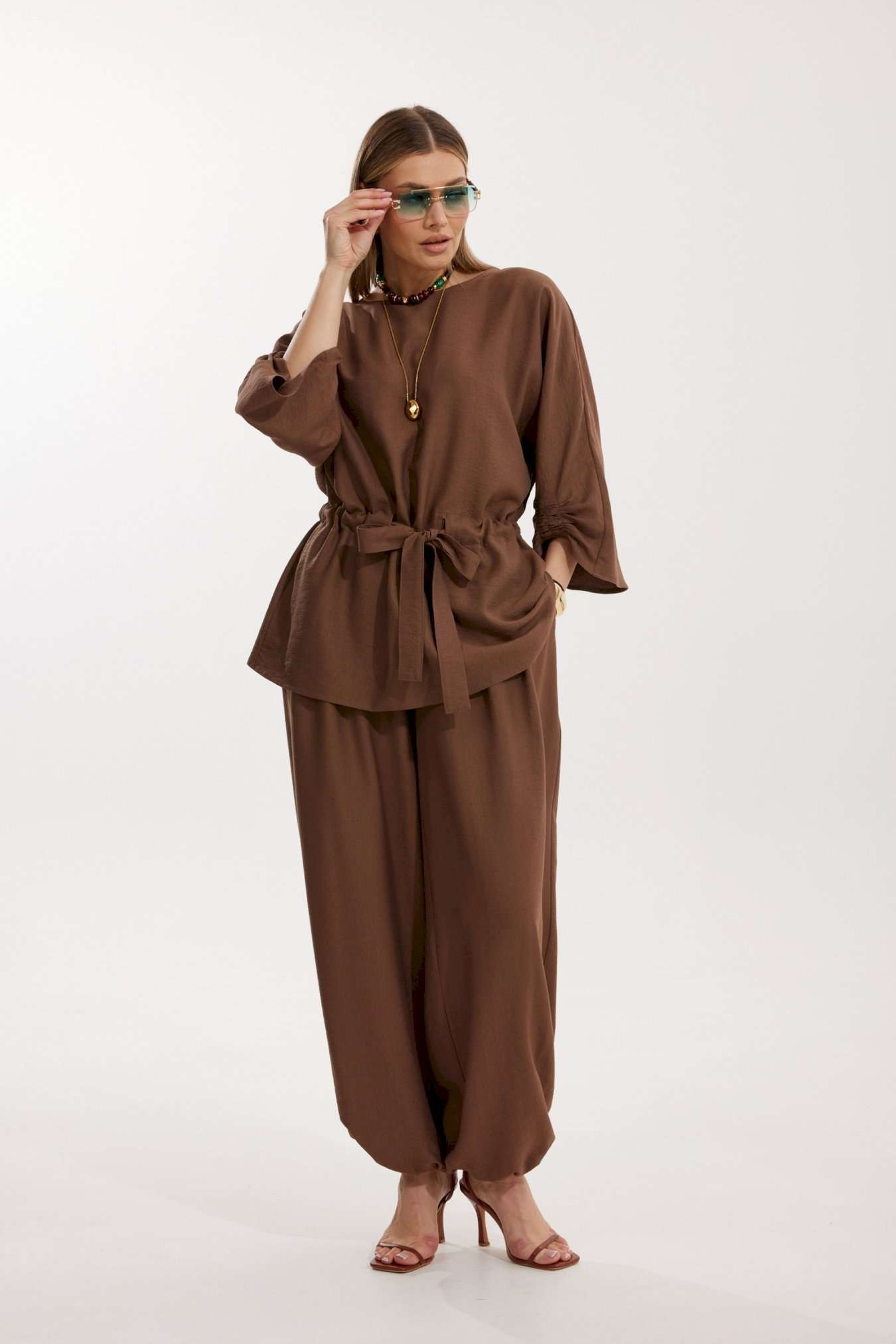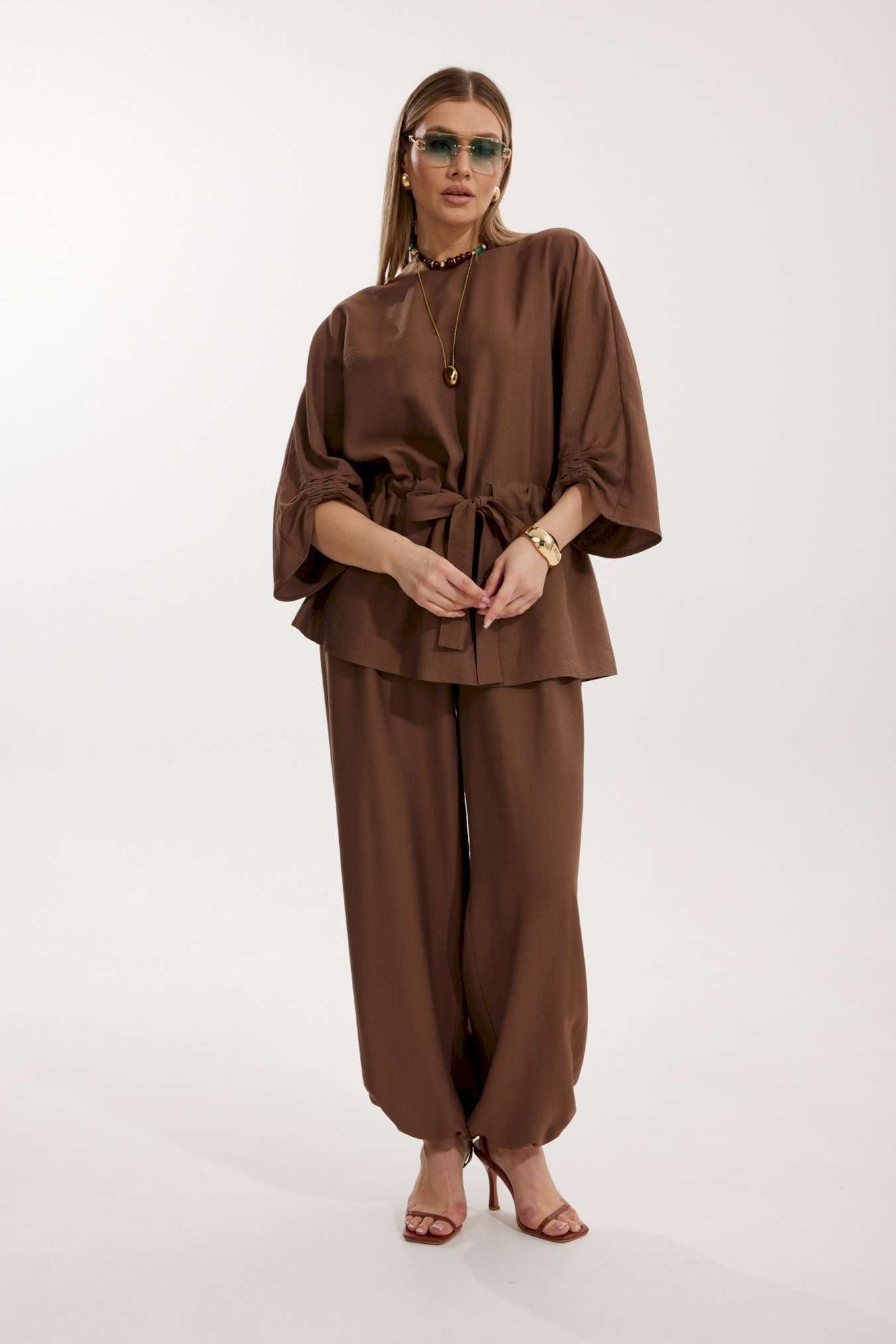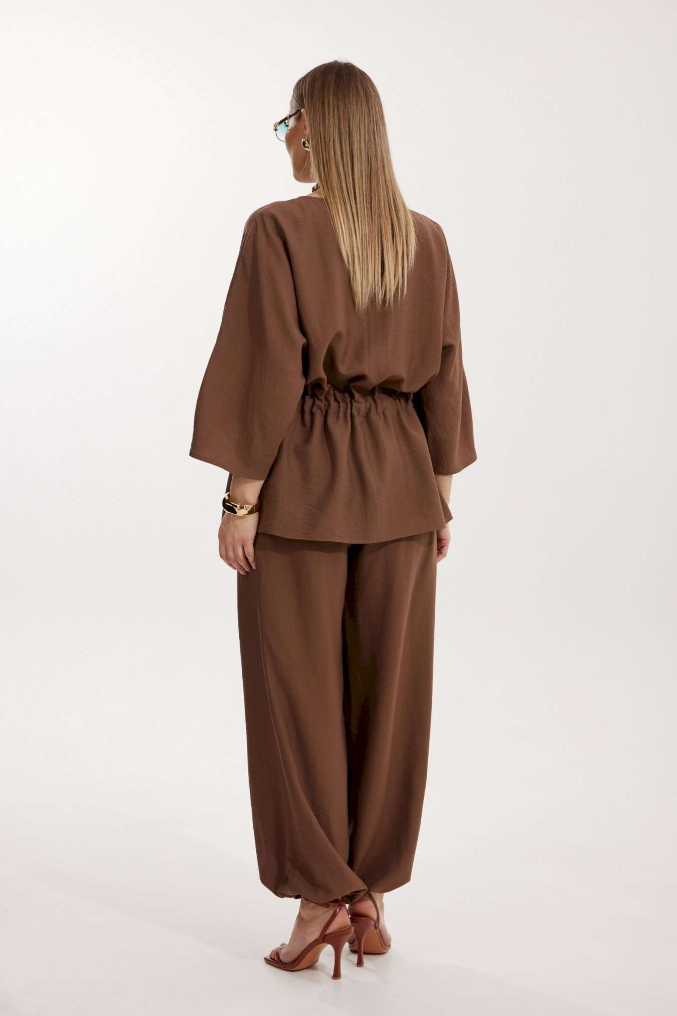 Брюки прямого силуэта с карманами в боковом шве и имитацией гульфика. Пояс притачной на резинке со шнуром в цвет отделочного канта. На задних половинках брюк застрочены вытачки. По низу брюки собраны на резинку.