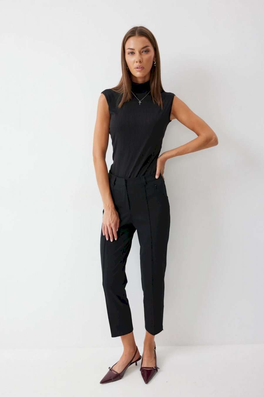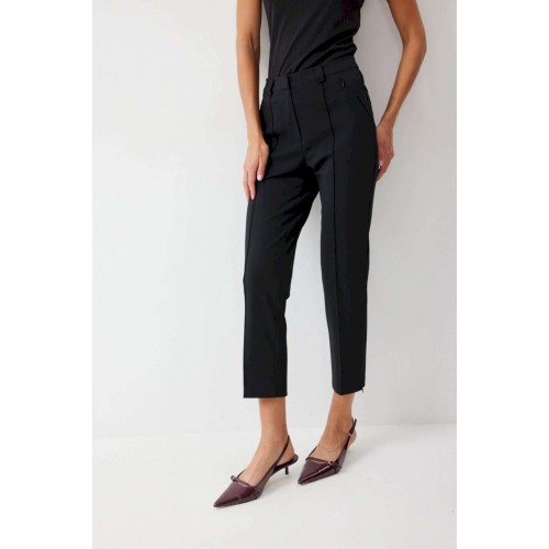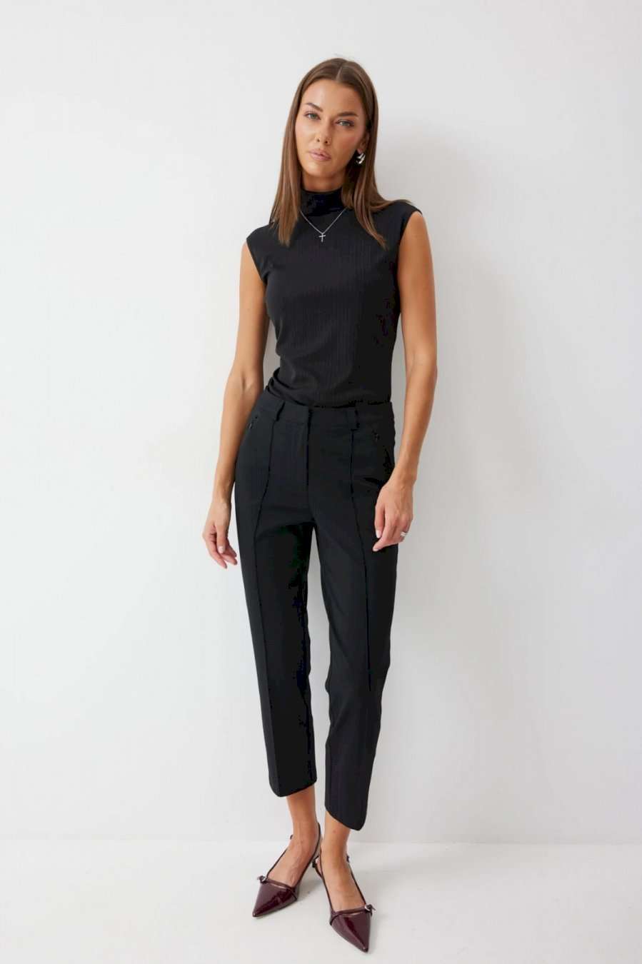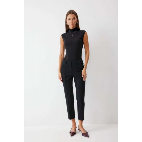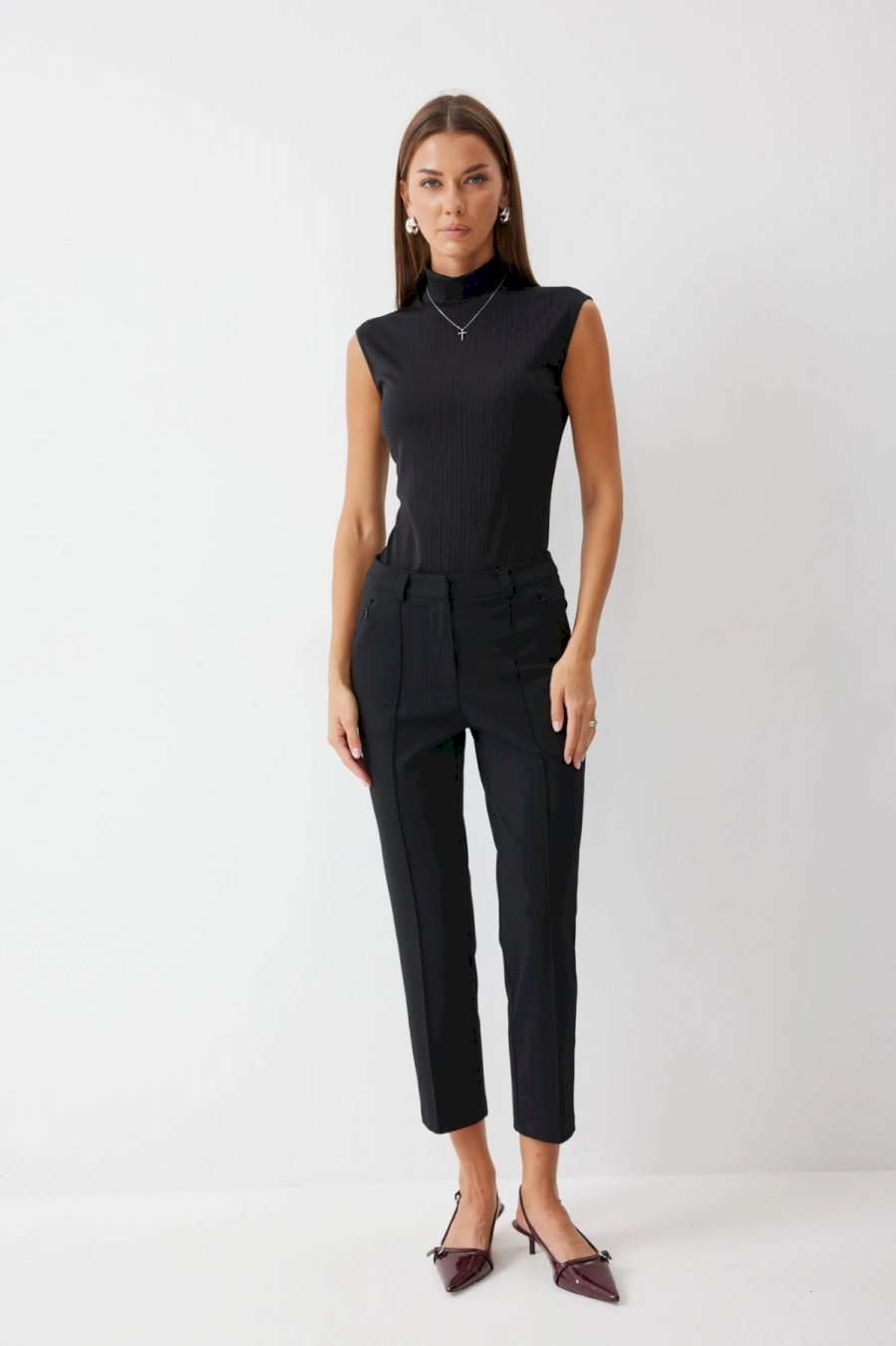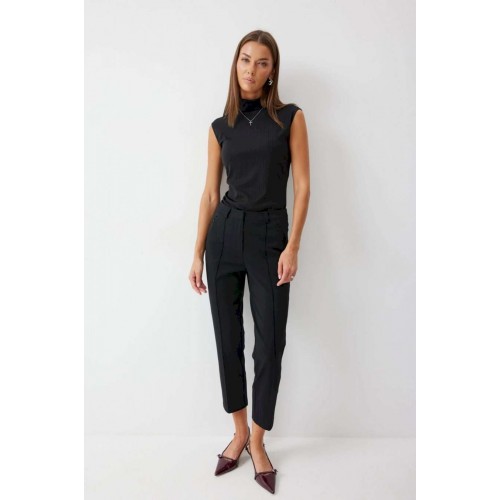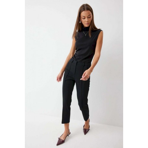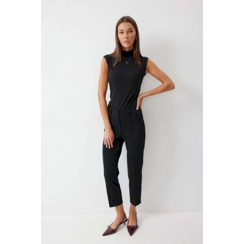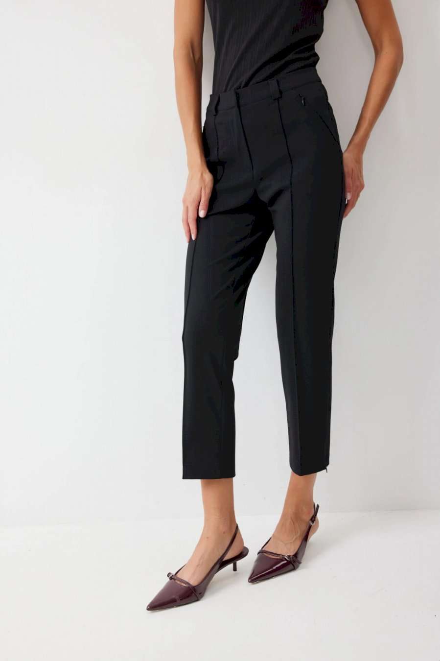 Укороченные брюки прилегающего силуэта из трикотажного полотна. По верху притачной пояс с застежкой и шлевками для ремня. На передних половинках обработаны карманы, защипы и застежка молния в среднем шве. На задних половинках кокетка и защипы. По низу в боковых швах потайные молнии. Обращаем ваше внимание, что фурнитура может отличаться от фото. Подробное описание Длина брюк (44-48р – 90см+3,5см),(50-54р - 91см+3,5см)