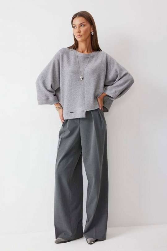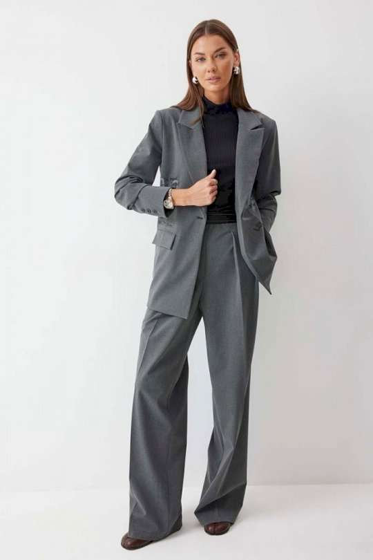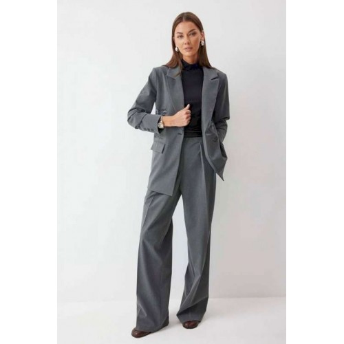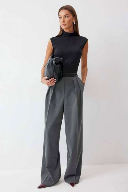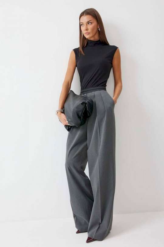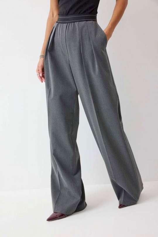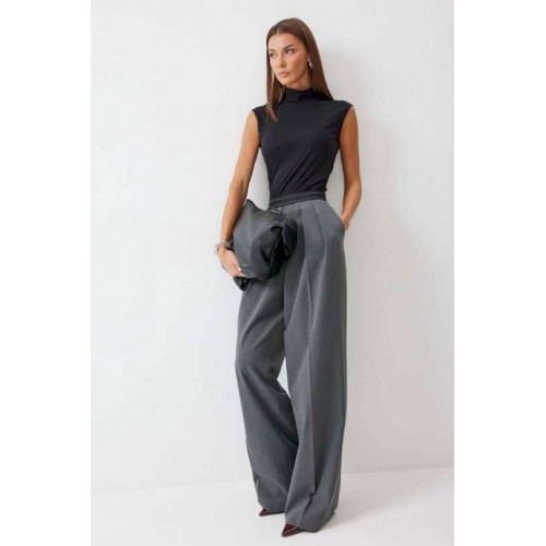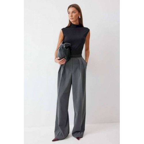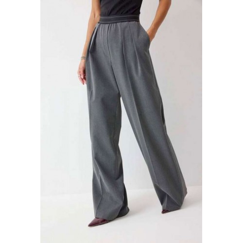 Брюки прямого силуэта из костюмной ткани. По верху брюк декоративная резинка. На передних половинках карманы и декоративные складки. На задних половинках вытачки. Обращаем ваше внимание, что фурнитура может отличаться от фото. Подходит на рост 164-170 см. Длина брюк (44-48р - 114см+4см пояс-резинка),(50-54р - 115+4см пояс-резинка).