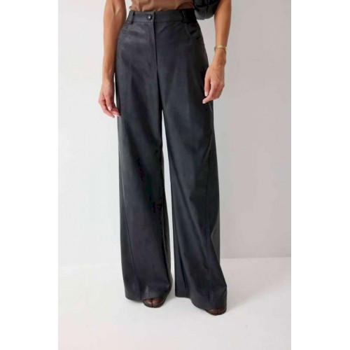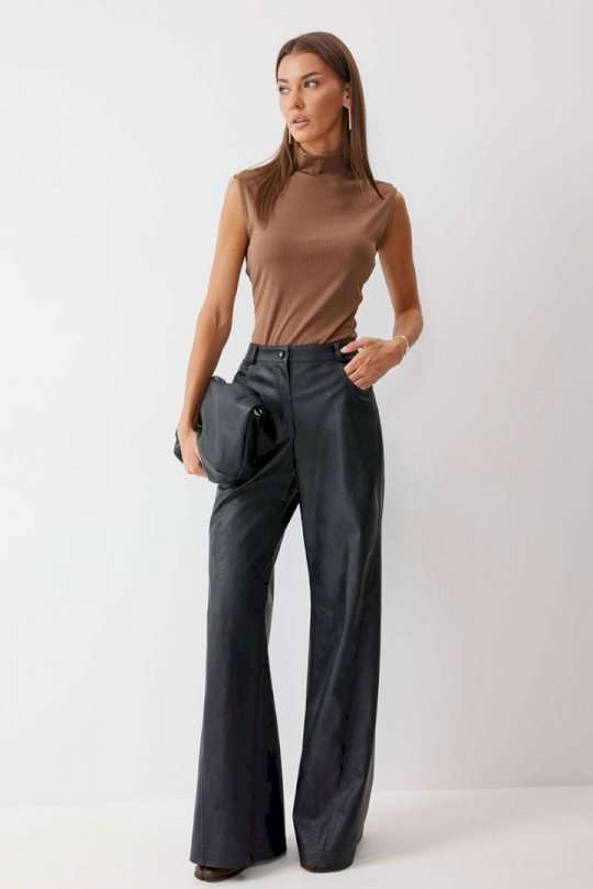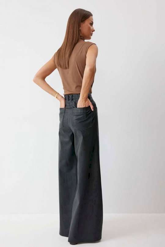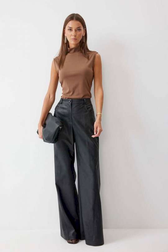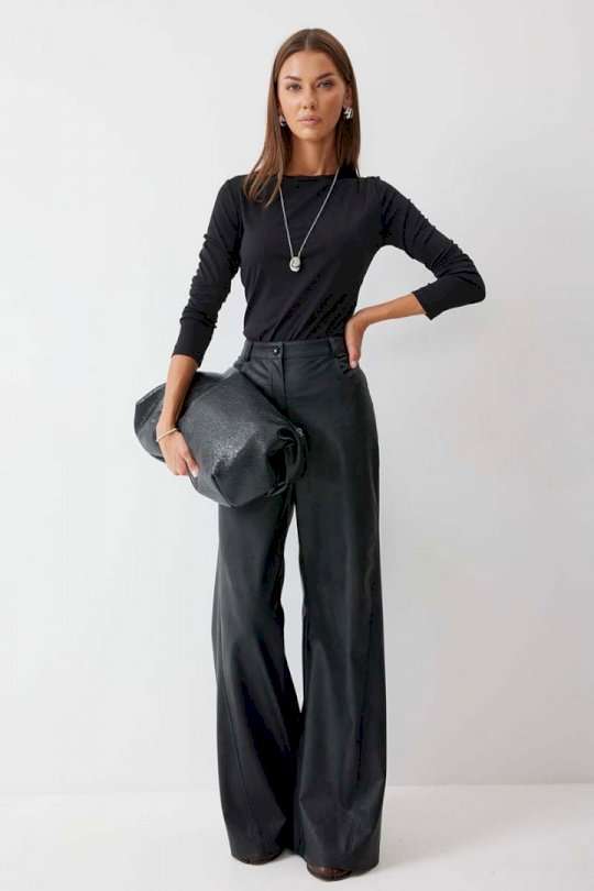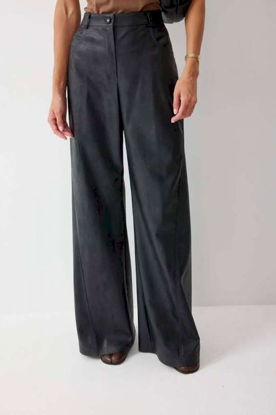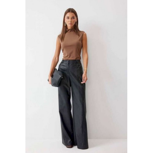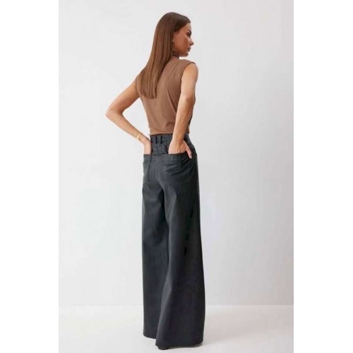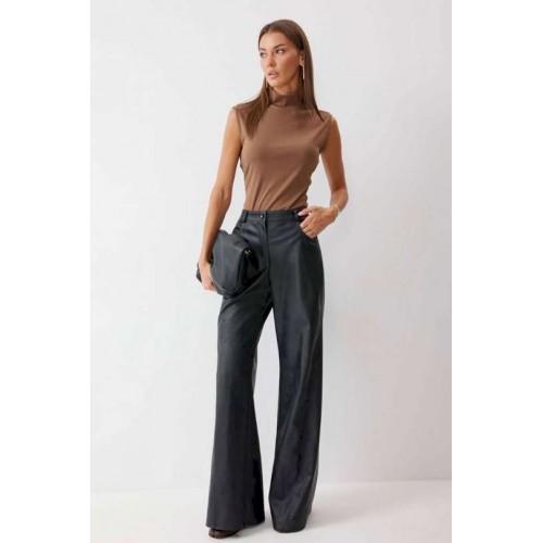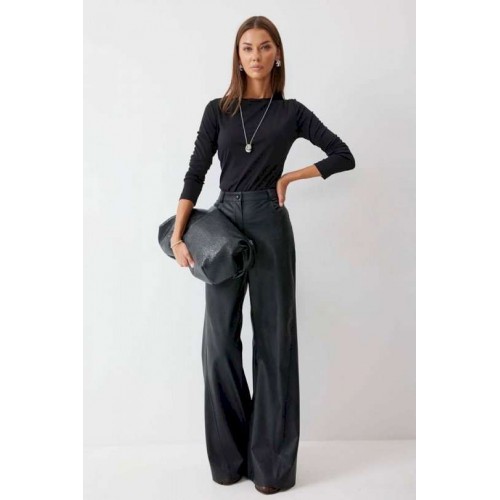 Брюки прямого силуэта расширенные книзу из экокожи. По верху притачной пояс с застежкой на петлю и пуговицу и шлевками для ремня. На передних половинках обработаны карманы и застежка молния в среднем шве. На задних половинках кокетка и накладные карманы. На кармане дизайнерская вышивка. По поясу задних половинок брюк резинка. Обращаем ваше внимание, что фурнитура может отличаться от фото. Подходит на рост 164-170 см. Длина брюк (110+3,5см пояс).