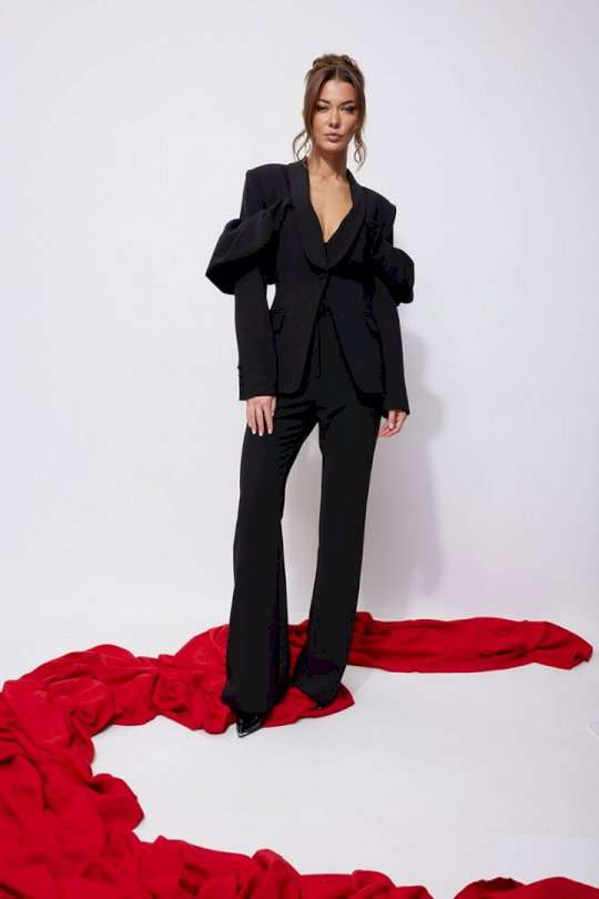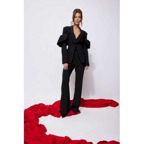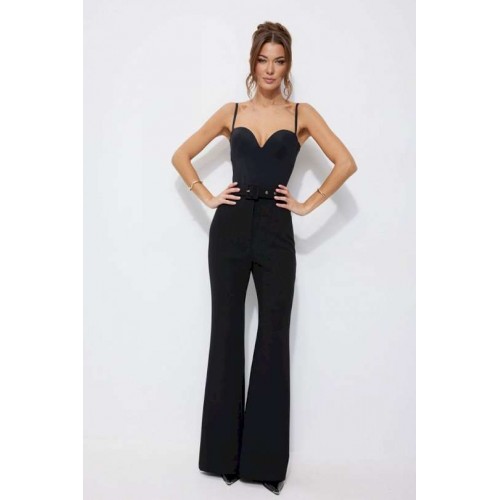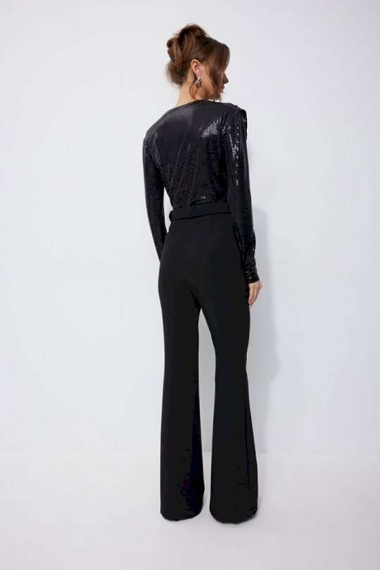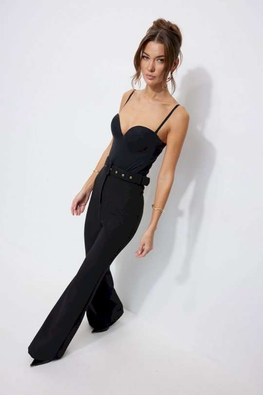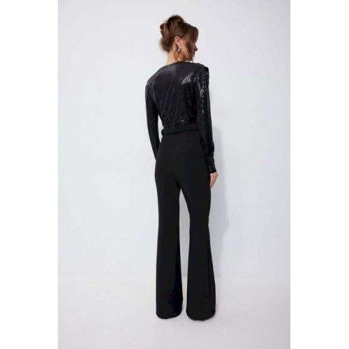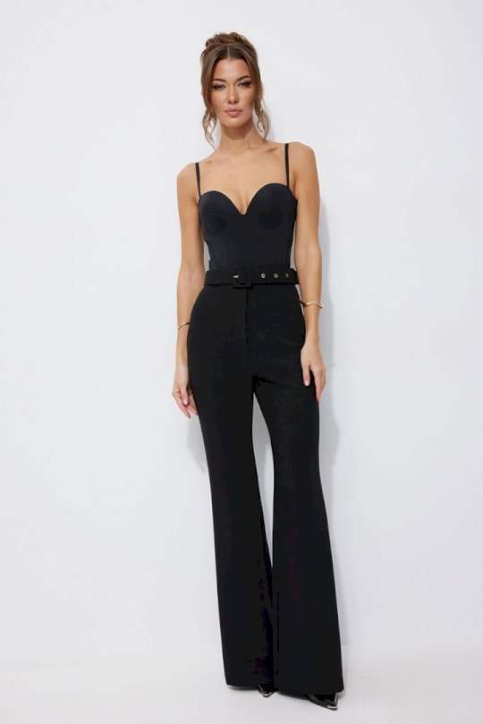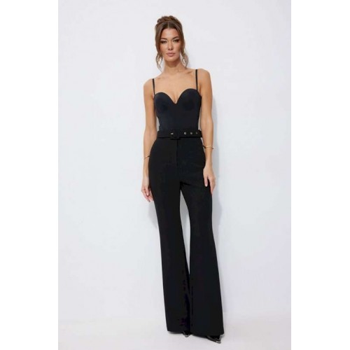 Брюки прилегающего силуэта расширенные книзу из костюмной ткани. По верху притачной пояс с застежкой на петлю и пуговицу и шлевками для ремня. На передних половинках обработана застежка молния в среднем шве. В комплект входит съемный ремень. Обращаем ваше внимание, что фурнитура может отличаться от фото. Длина брюк в 44-48р 114+4 см пояс, в 50-54р 115+4 см пояс.