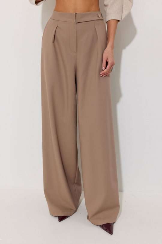 Брюки из поливискозной ткани, прямого, расширенного силуэта. На передних половинах брюк по одной складке, выходящих из-под пояса. По переду застежка на молнию по типу гульфик. Брюки по переду с карманами в отрезных бочках. Пояс по переду с застежкой на хлястик, продевается через металлическую рамку и застегивается на две металлические пуговицы на ножке. Обращаем Ваше внимание, что фурнитура может незначительно отличаться от фото. По спинке в пояс вставлена резинка. На задних половинах брюк вытачки. Подходит на рост 164-170 см. Длина брюк (44-48р 109 см, пояс 4 см) (50-54р 110 см, пояс 4 см).