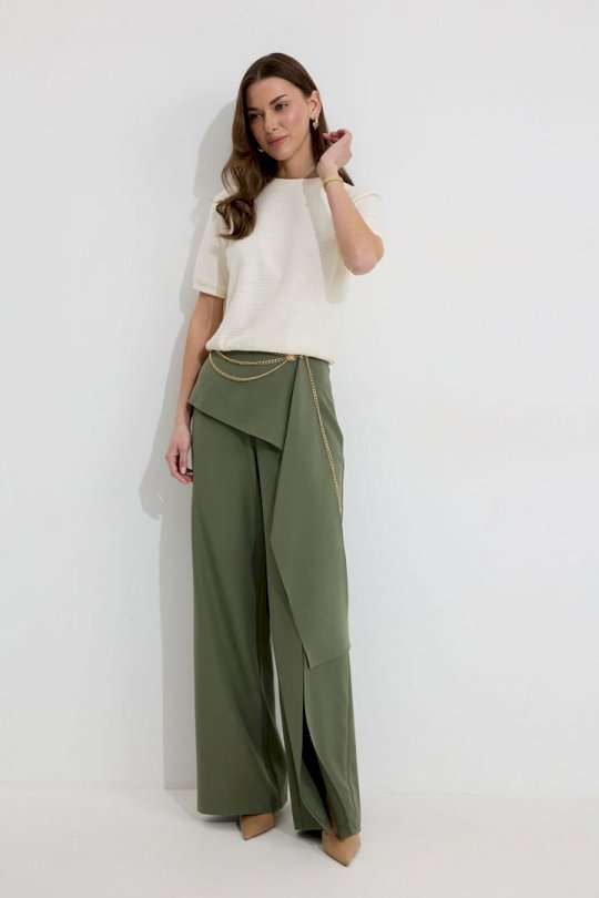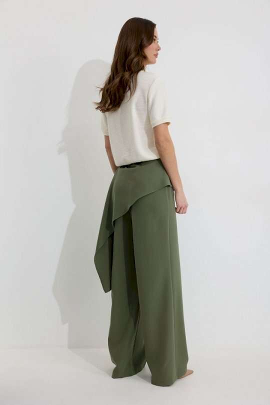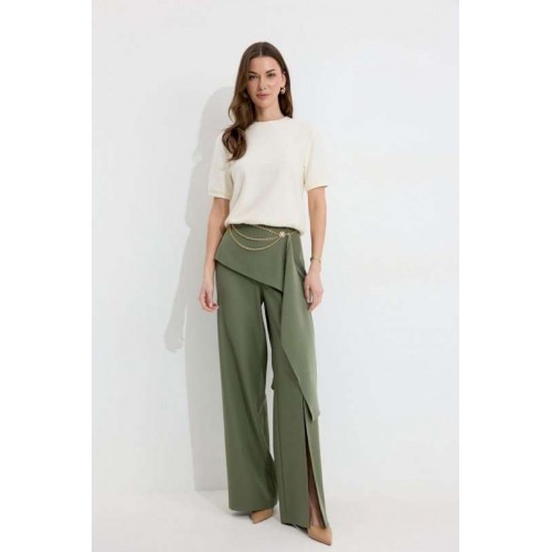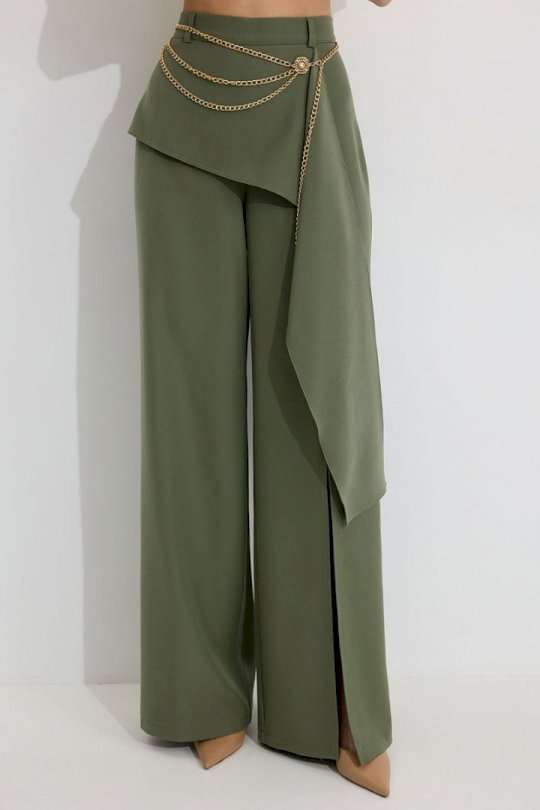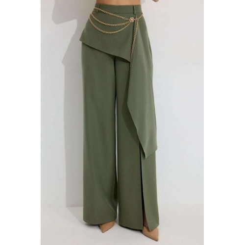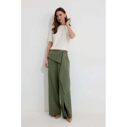 Брюки прямого силуэта из костюмной ткани. По верху брюк притачной пояс со шлевками для ремня. По переду и спинке декоративная отлетная деталь. На левой передней половинке брюк разрез . В левом боковом шве потайная молния. По задним половинкам брюк на поясе резинка от вытачки до вытачки. Обращаем ваше внимание, что фурнитура может отличаться от фото. !Декоративный пояс в комплект не входит ! Подходит на рост 164-170 см. Длина брюк (44-48р – 112+4см пояс)(50-54р - 113+4см пояс).
