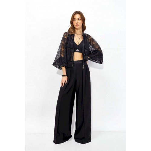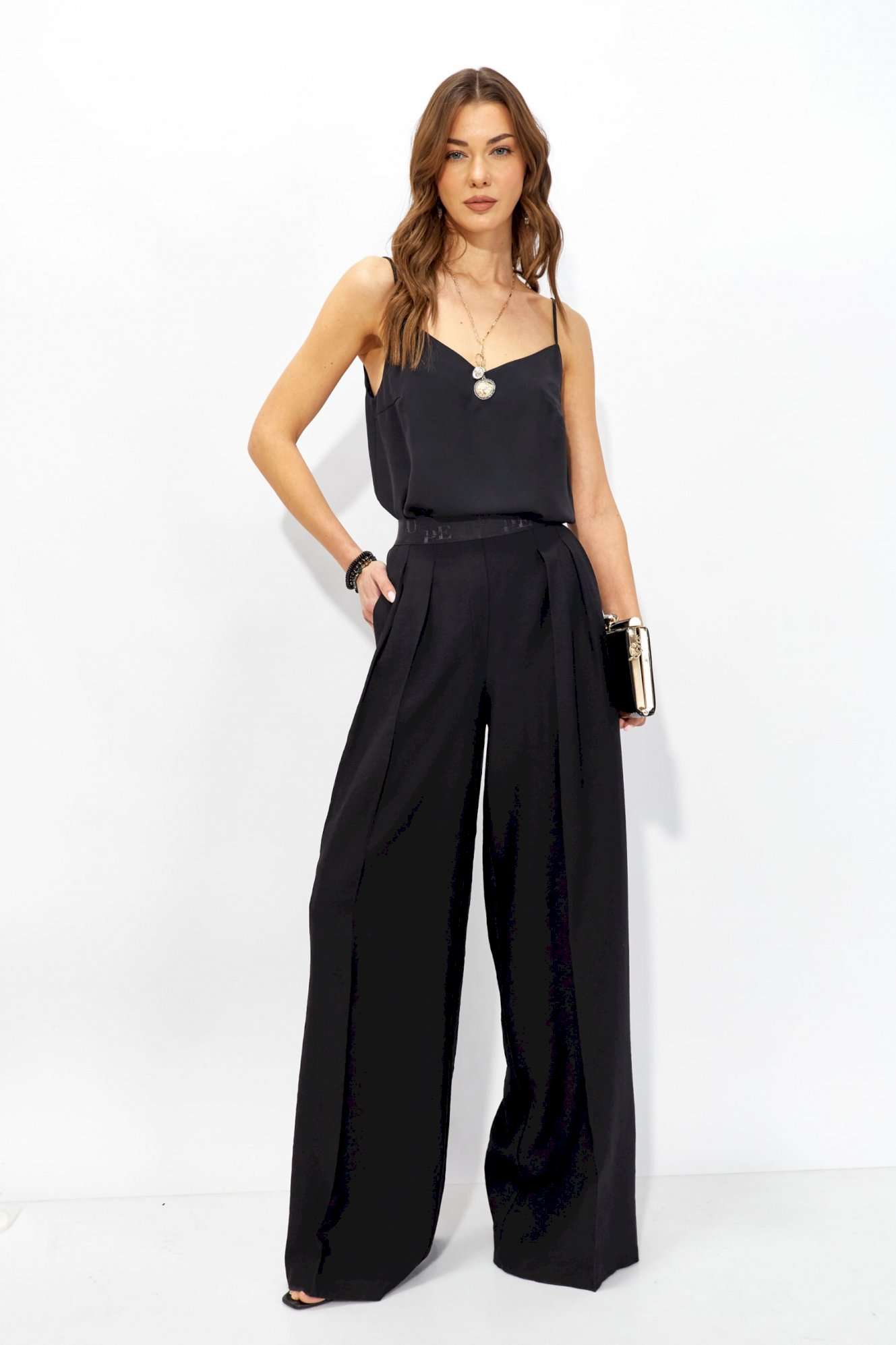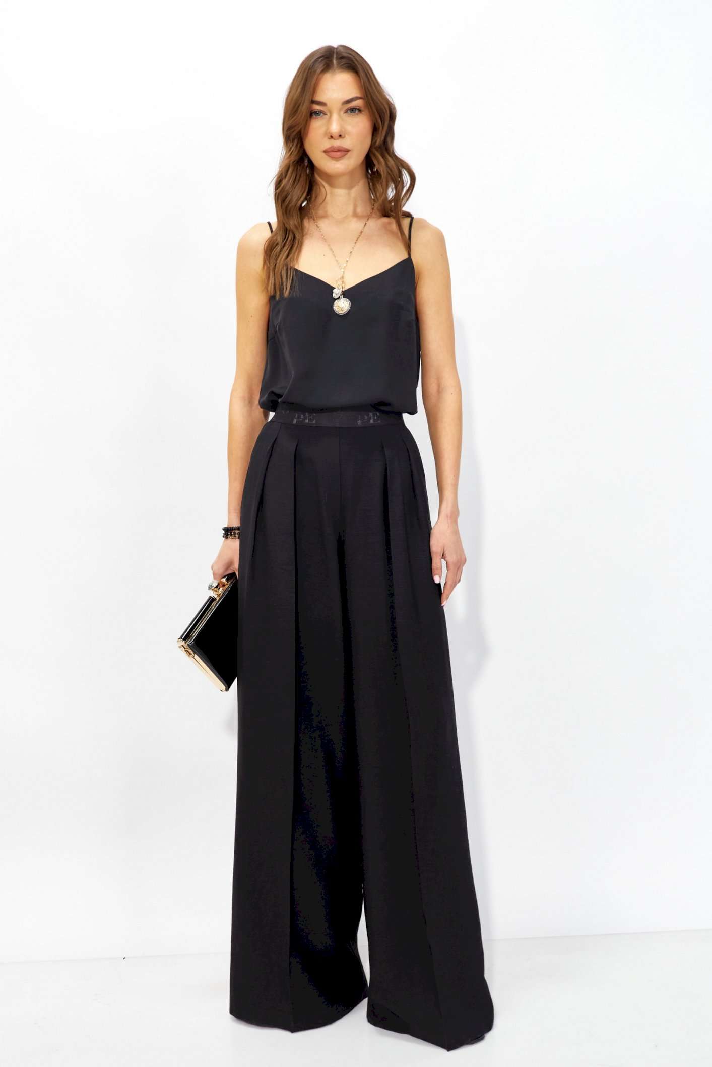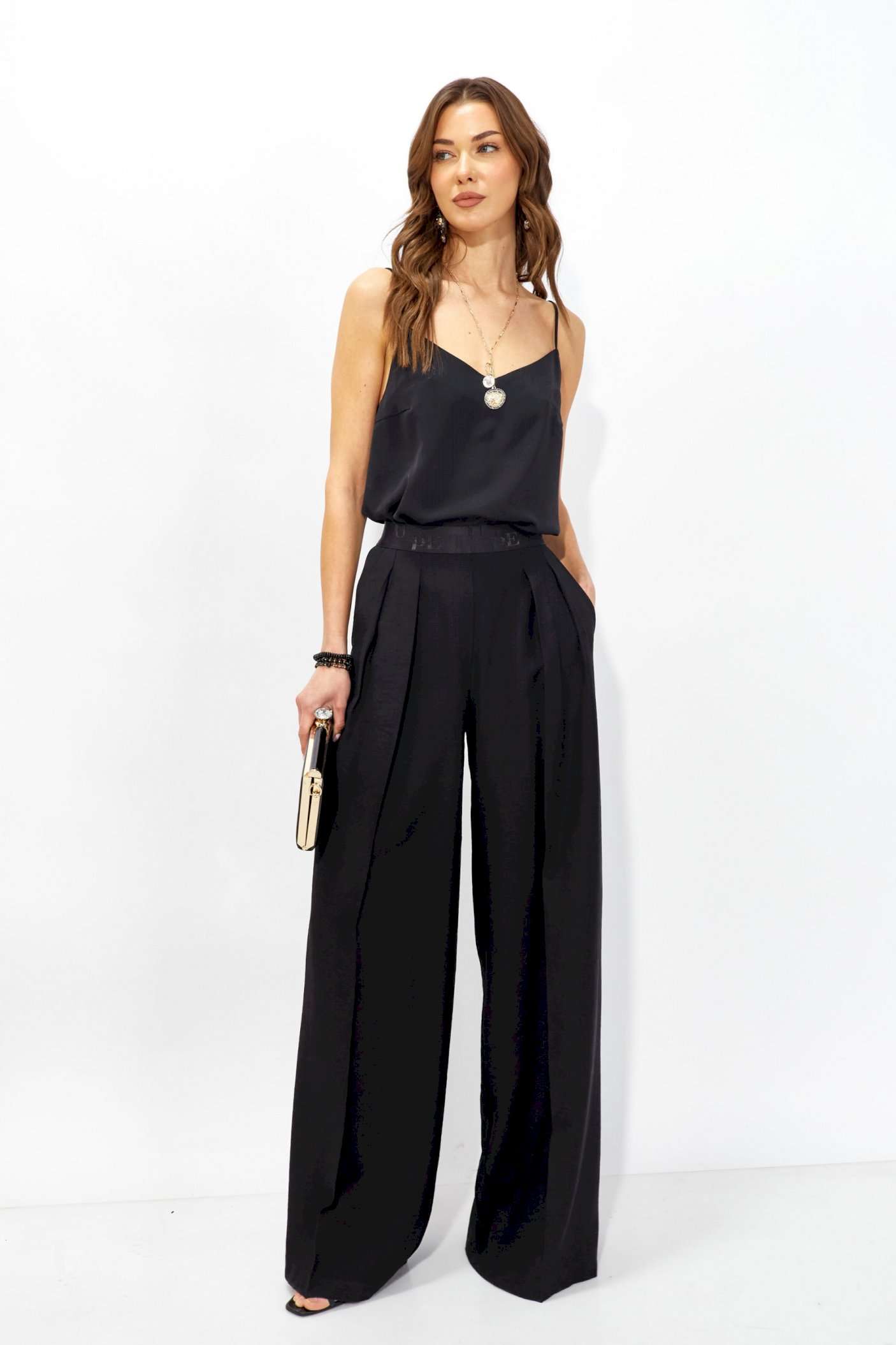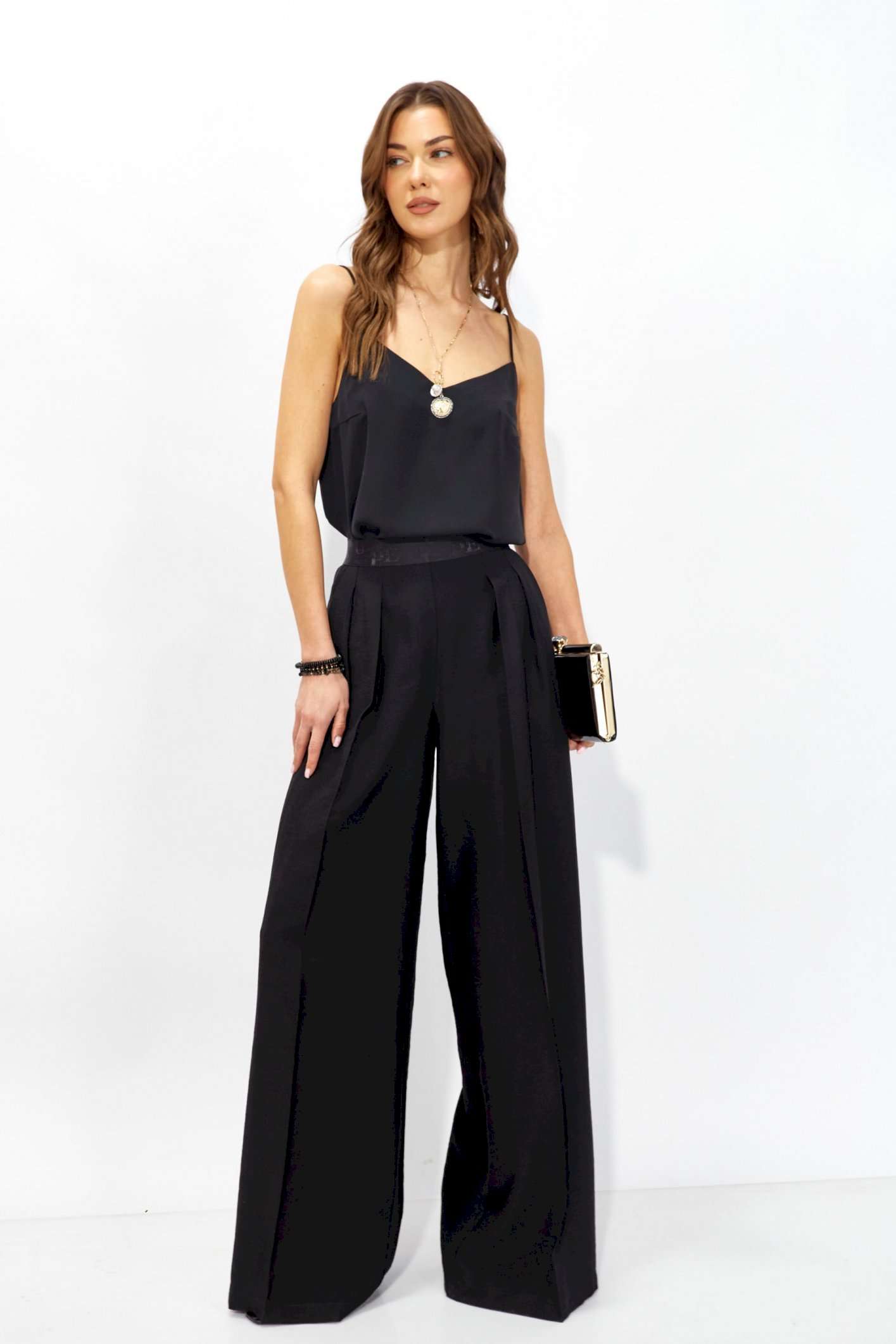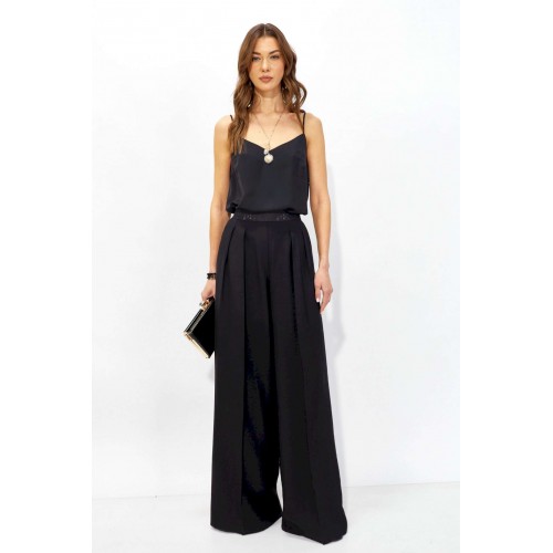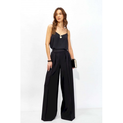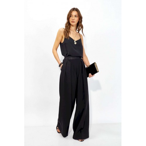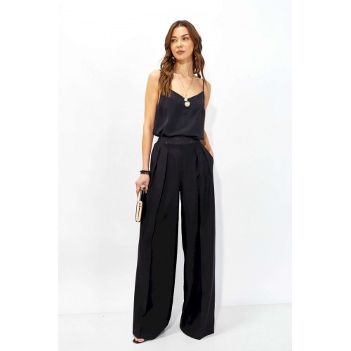 Брюки прямого силуэта из струящейся ткани. По верху брюк притачная декоративная резинка. По переду обработаны карманы в боковых швах и декоративные складки. На задних половинках брюк листочки. Обращаем ваше внимание, что фурнитура может отличаться от фото. Длина брюк (44-48р - 110 +4см пояс)(50-54р – 111 +4см пояс)