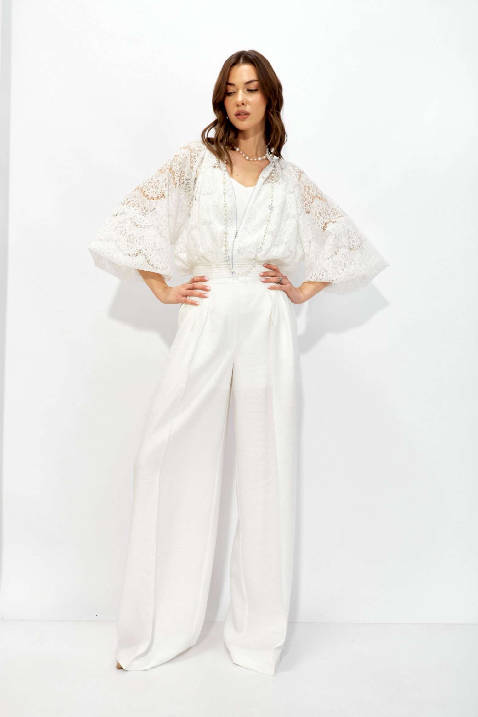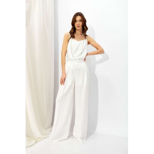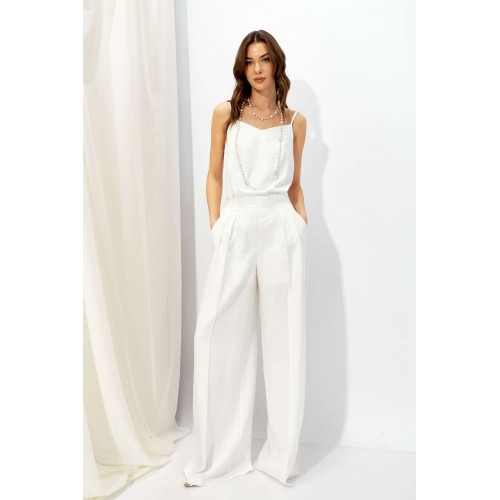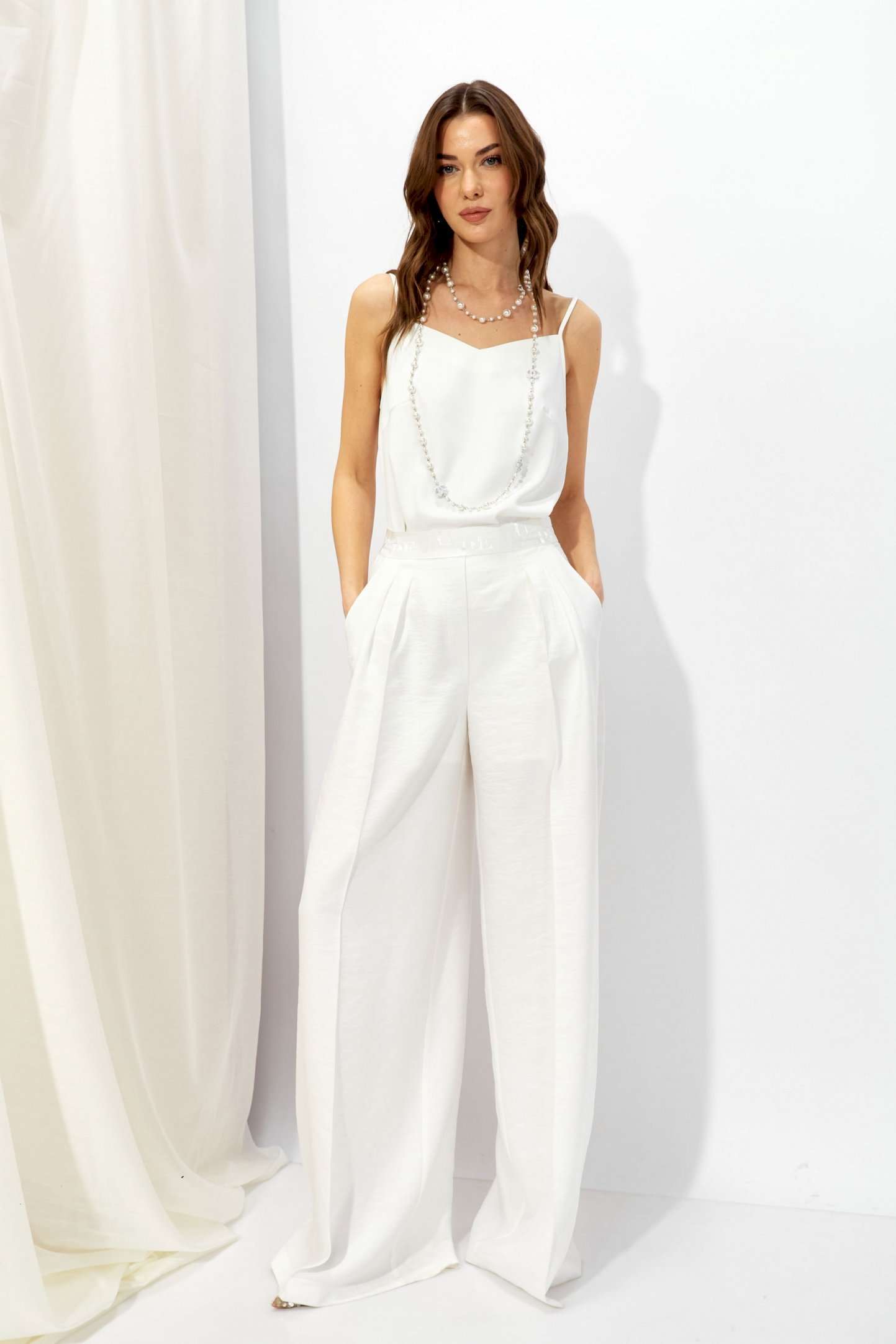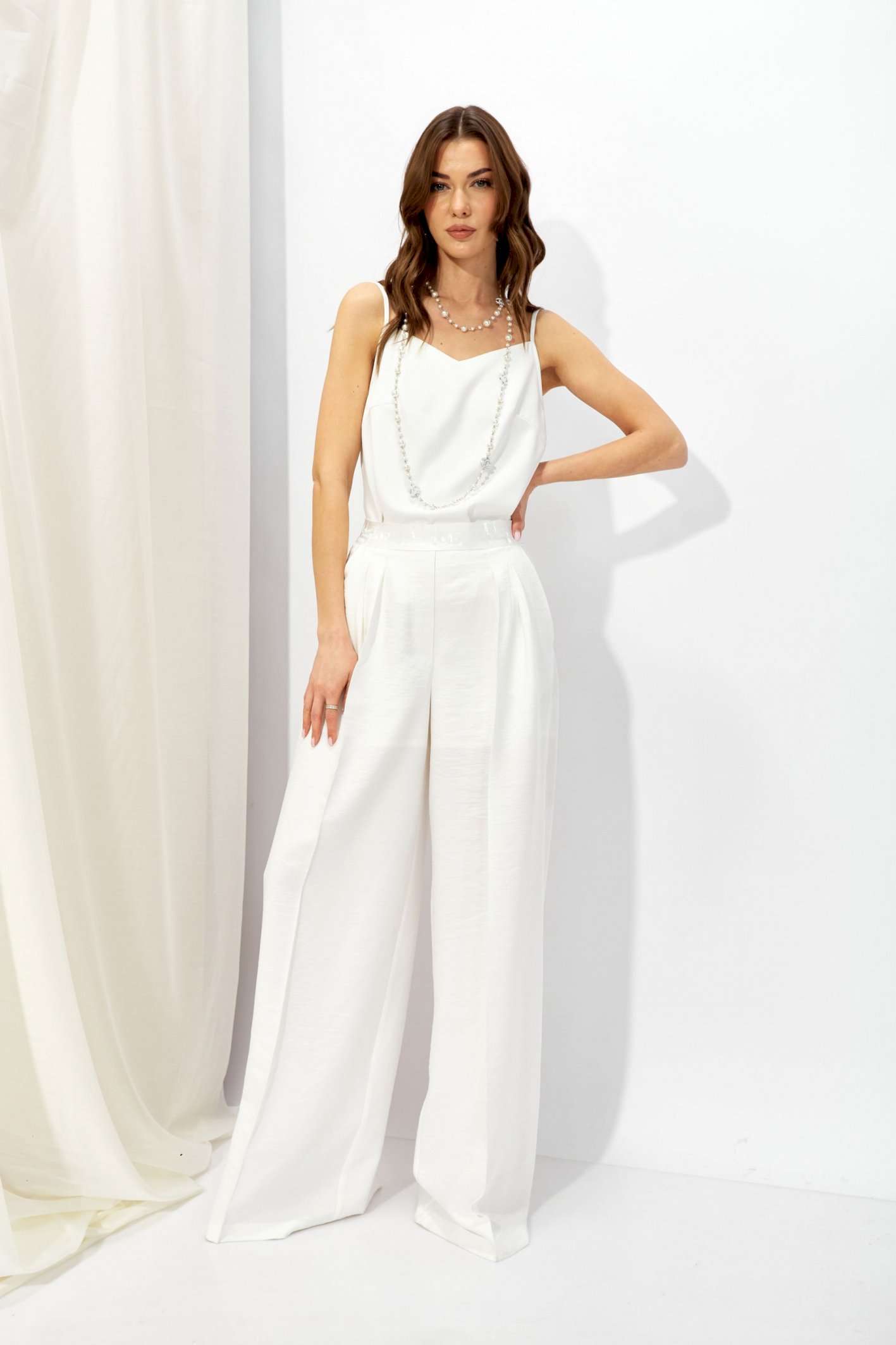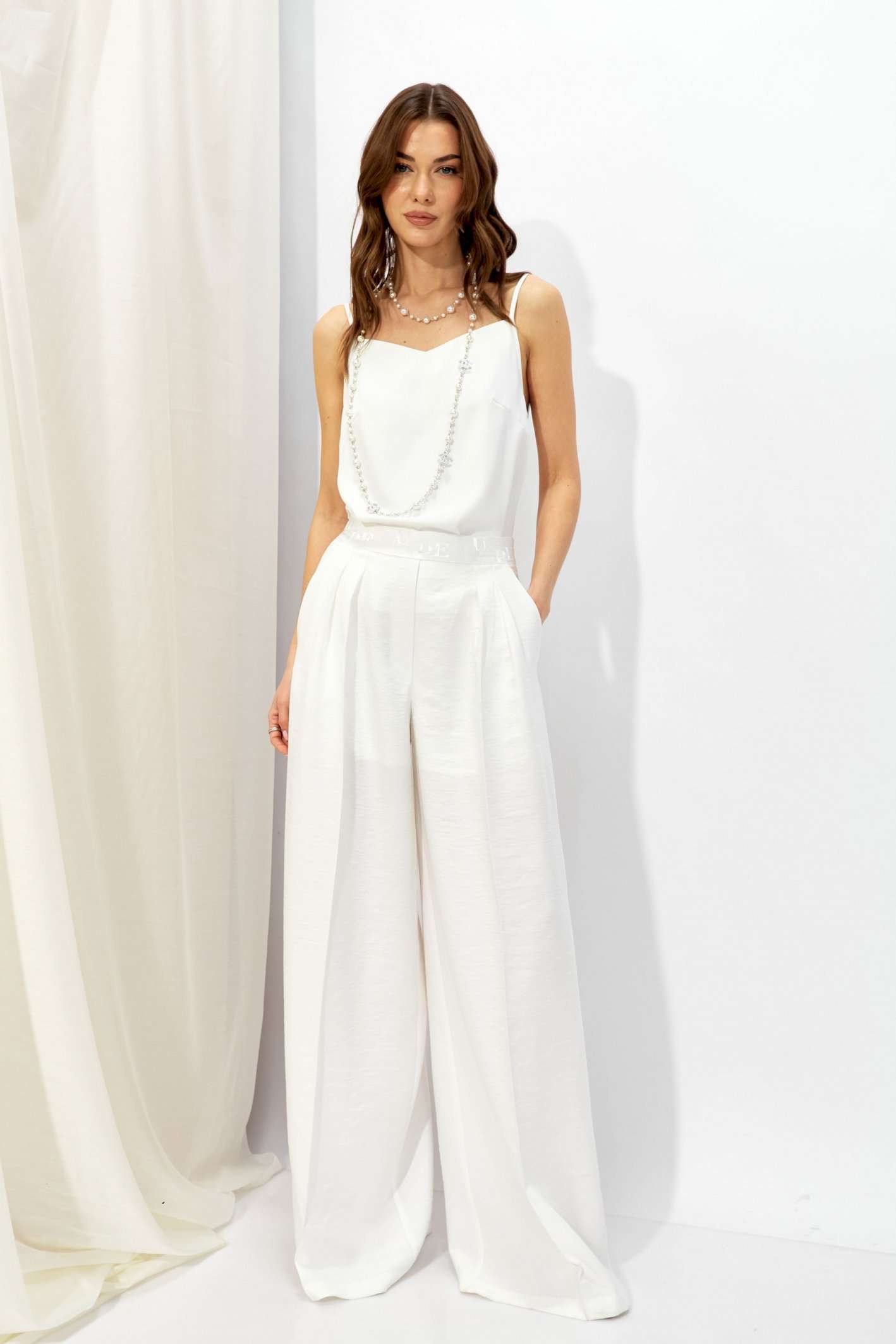 Брюки прямого силуэта из струящейся ткани. По верху брюк притачная декоративная резинка. По переду обработаны карманы в боковых швах и декоративные складки. На задних половинках брюк листочки. Брюки на подкладке! Обращаем ваше внимание, что фурнитура может отличаться от фото. Длина брюк (44-48р - 110 +4см пояс)(50-54р – 111 +4см пояс)