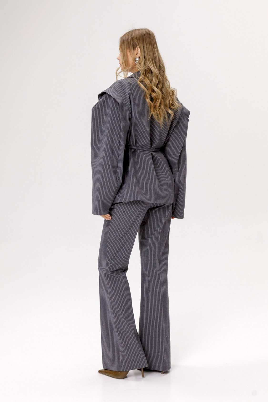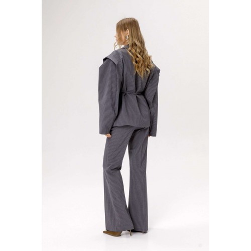 Облегающие брюки-клёш со стрелками из костюмной ткани в тонкую полоску со стразами (приобрести жакет с фото можно по арт. 6516). Детали: брюки с притачным поясом со шлёвками, передние половинки с заутюженными стрелками, наклонные карманы, задние половинки с вытачками и заутюженными стрелками, застёжка на молнию и пуговицу с потайным крючком, пояс брюк прямой без резинки. Длина брюк по боковому шву с поясом около 112 см в размерах 40-46 и около 115,5 см в размерах 48-52. Длина по внутреннему шву около 82 см
