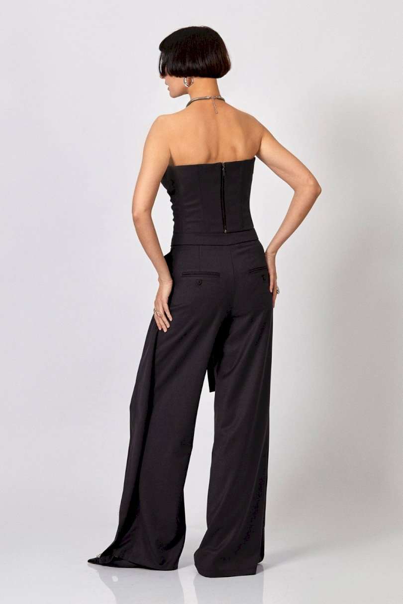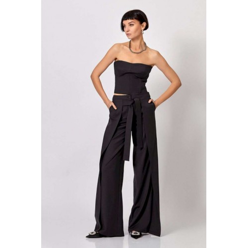 Брюки: - прямой силуэт - верх брюк на притачном поясе - по переду декоративные детали, направленные к центру - боковые детали брюк вверху соединены с декоративным поясом
