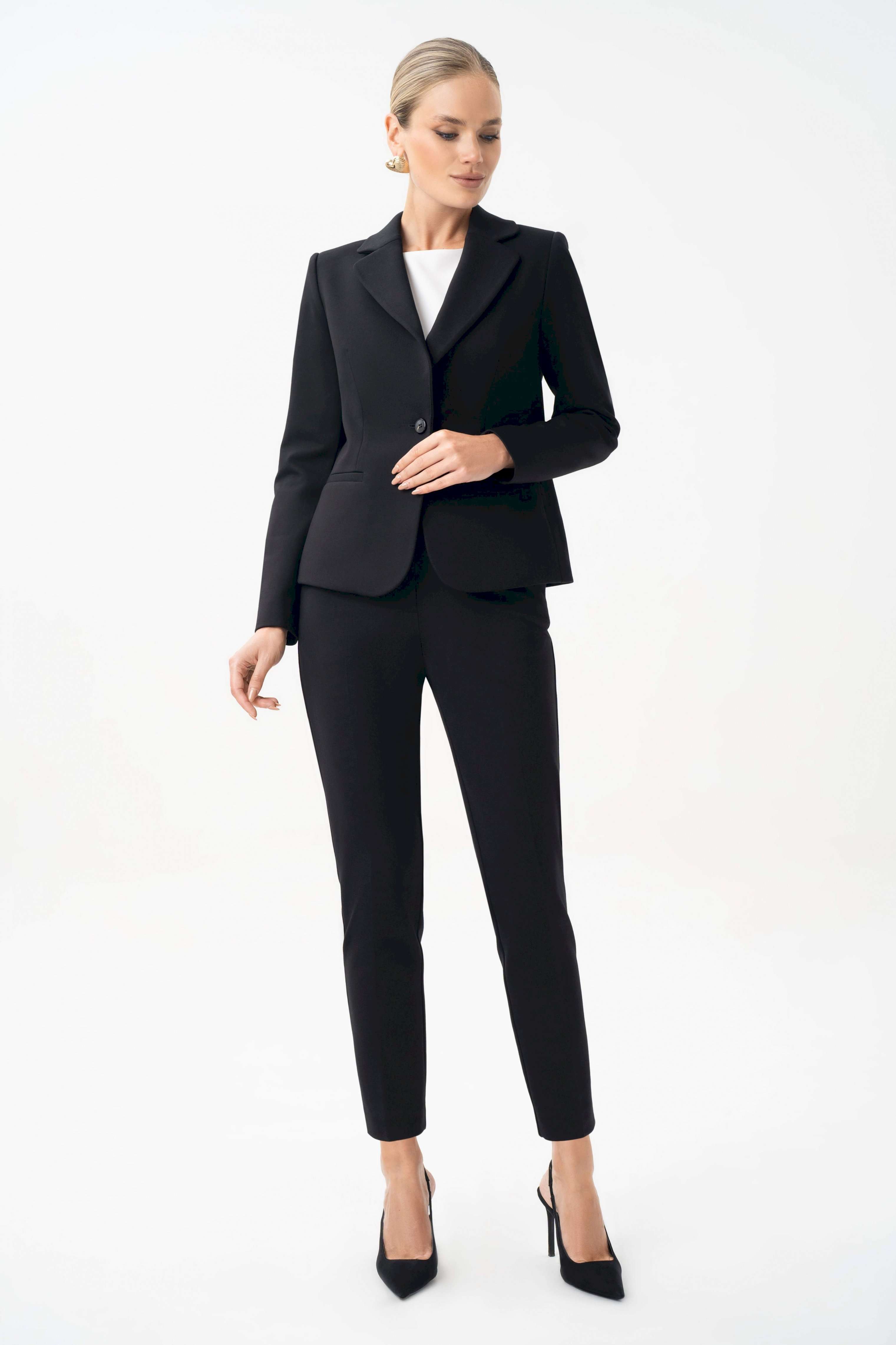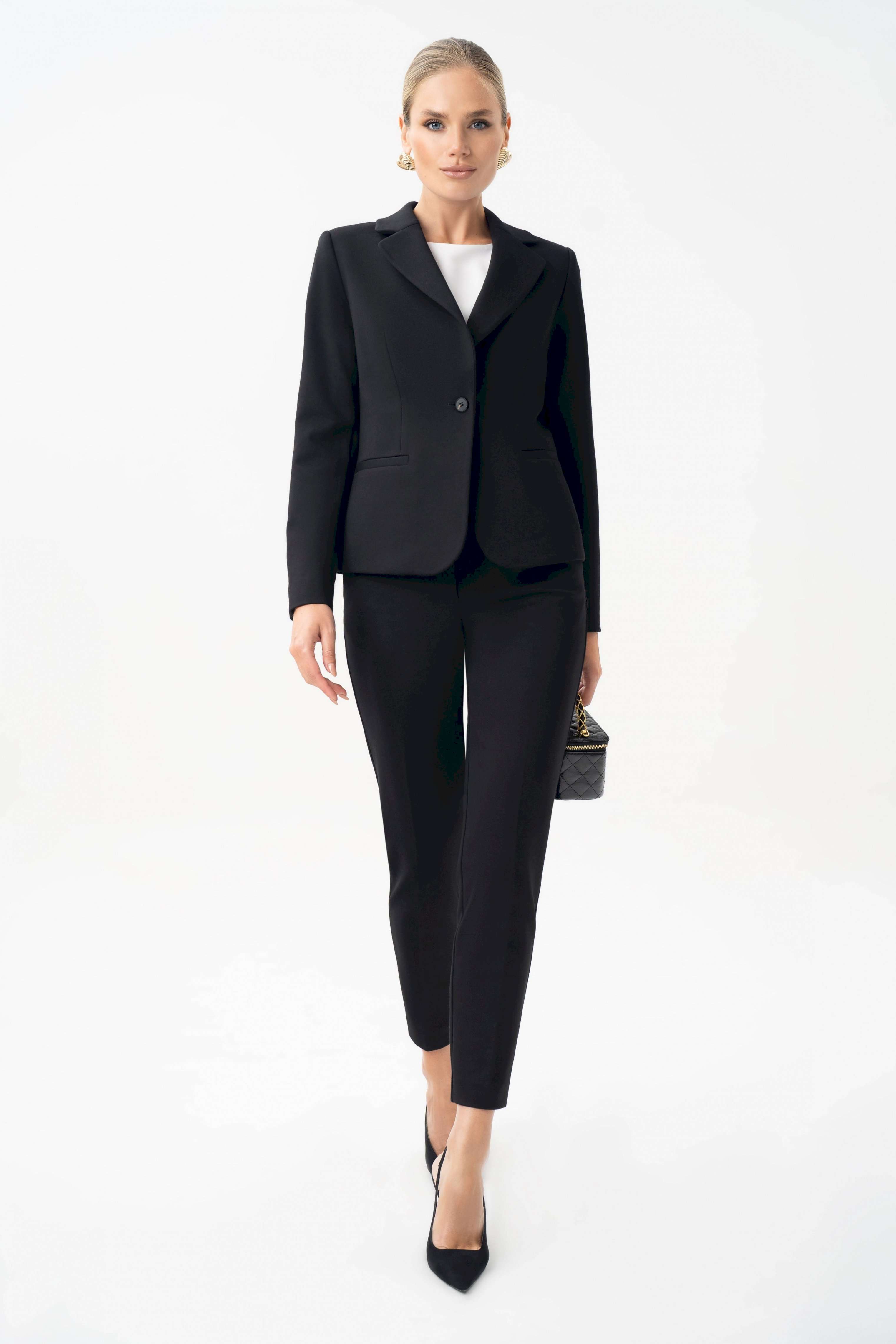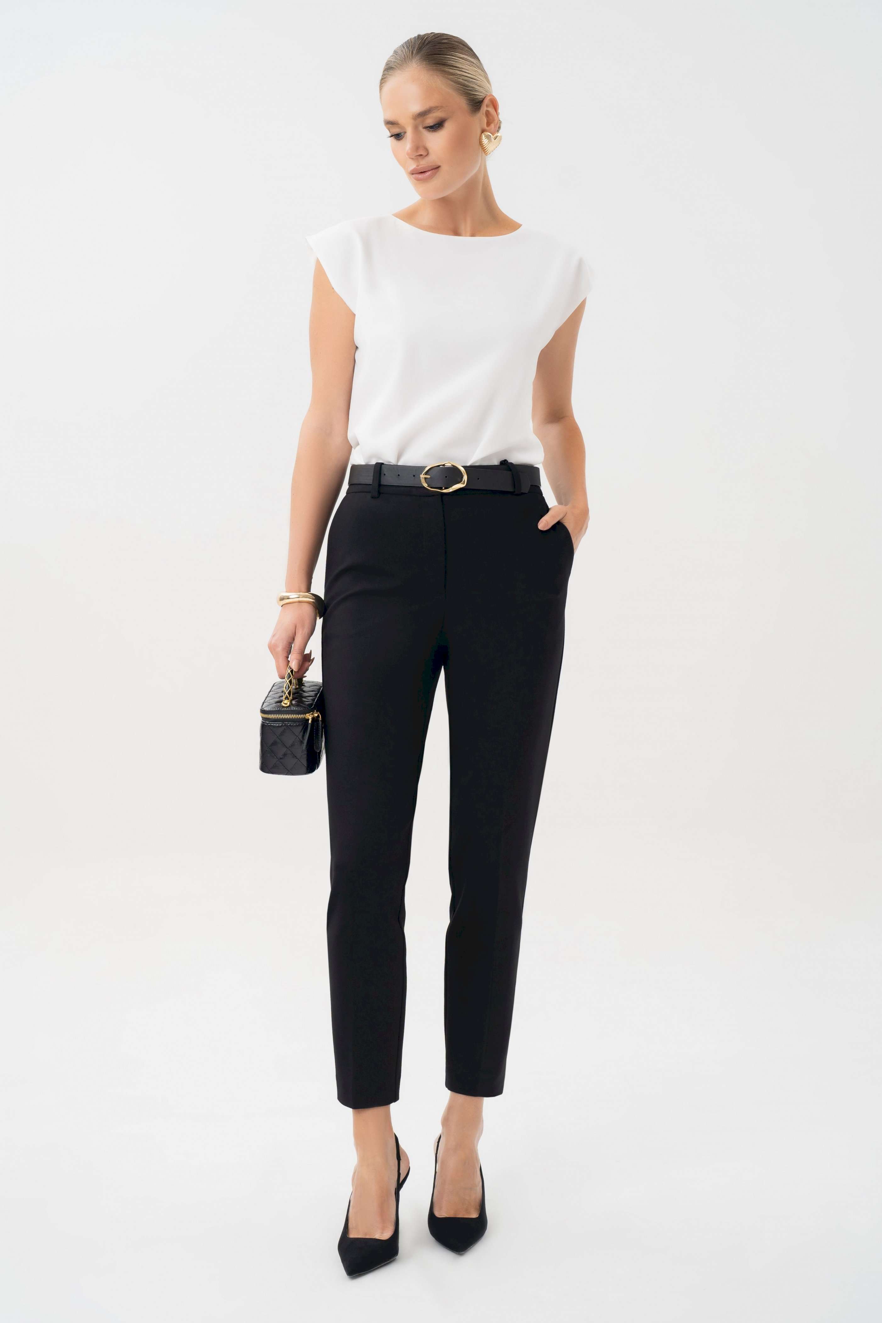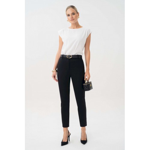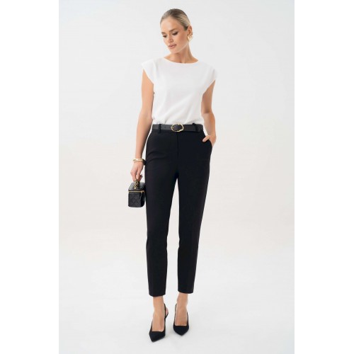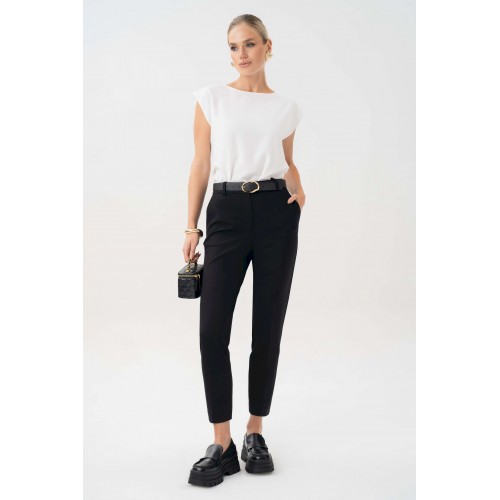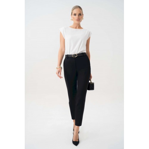 Брюки женские классические всегда остаются актуальными вне зависимости от модных тенденций. Брюки прекрасно комбинируется с блузой 24-425-1 и являются комплектом к жакету 25-641-1. Брюки женские, выполнены из трикотажного полотна, зауженные к низу, на обтачном поясе, с 5-ю шлевками, с застежкой на тесьму - «молнию», расположенную в среднем шве передних половинок. Пояс застегивается спереди на пришивной крючок, 1 петлю и потайную пуговицу. Передние половинки брюк с боковыми наклонными карманами, с заутюженными стрелками. Задние половинки с вытачками, с заутюженными стрелками. Левая задняя половинка с функциональным прорезным карманом с листочкой. Брюки предназначены для повседневной носки. Средняя длина брюк по боковому шву с поясом 99,0см (±3,0 см).