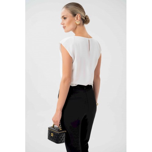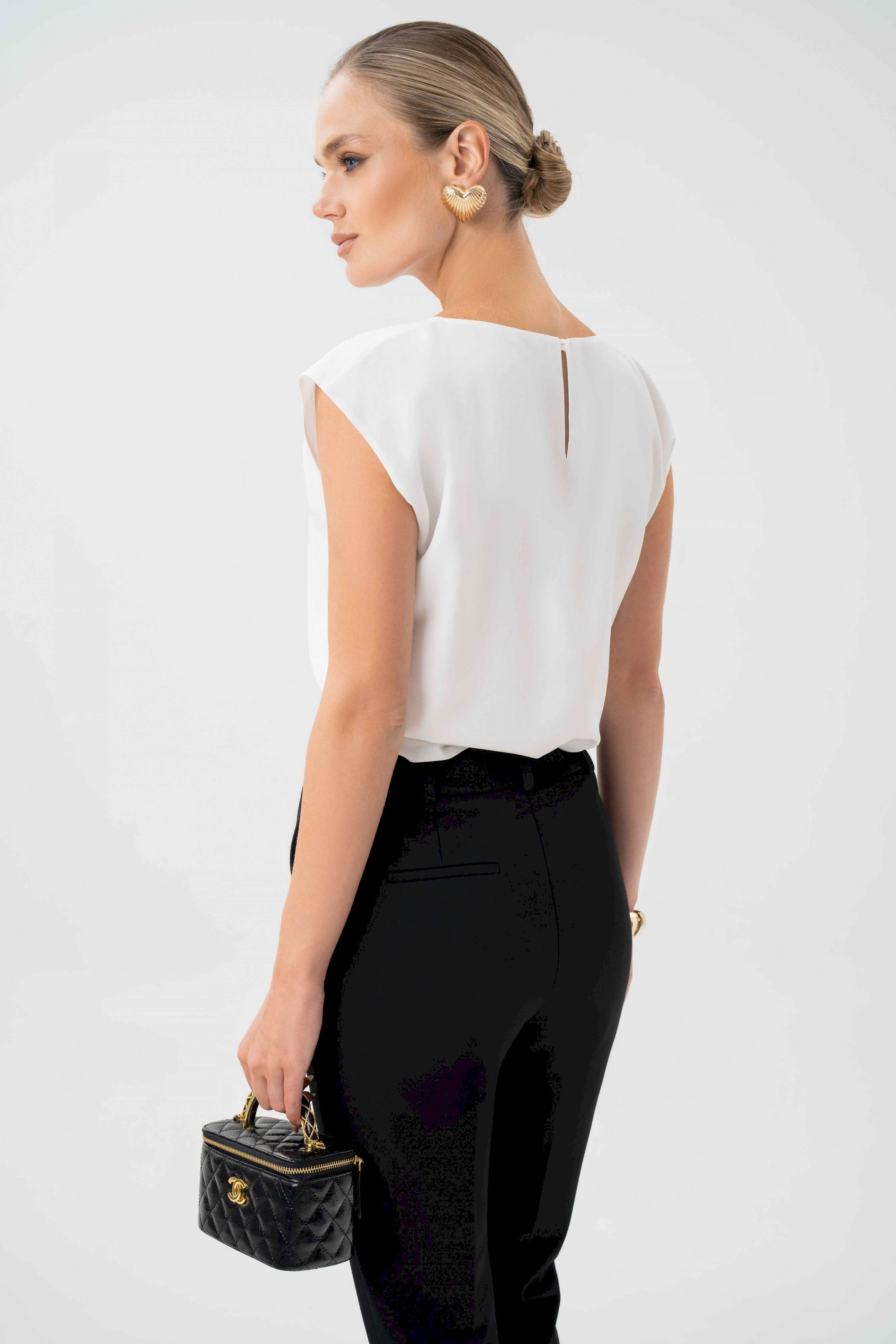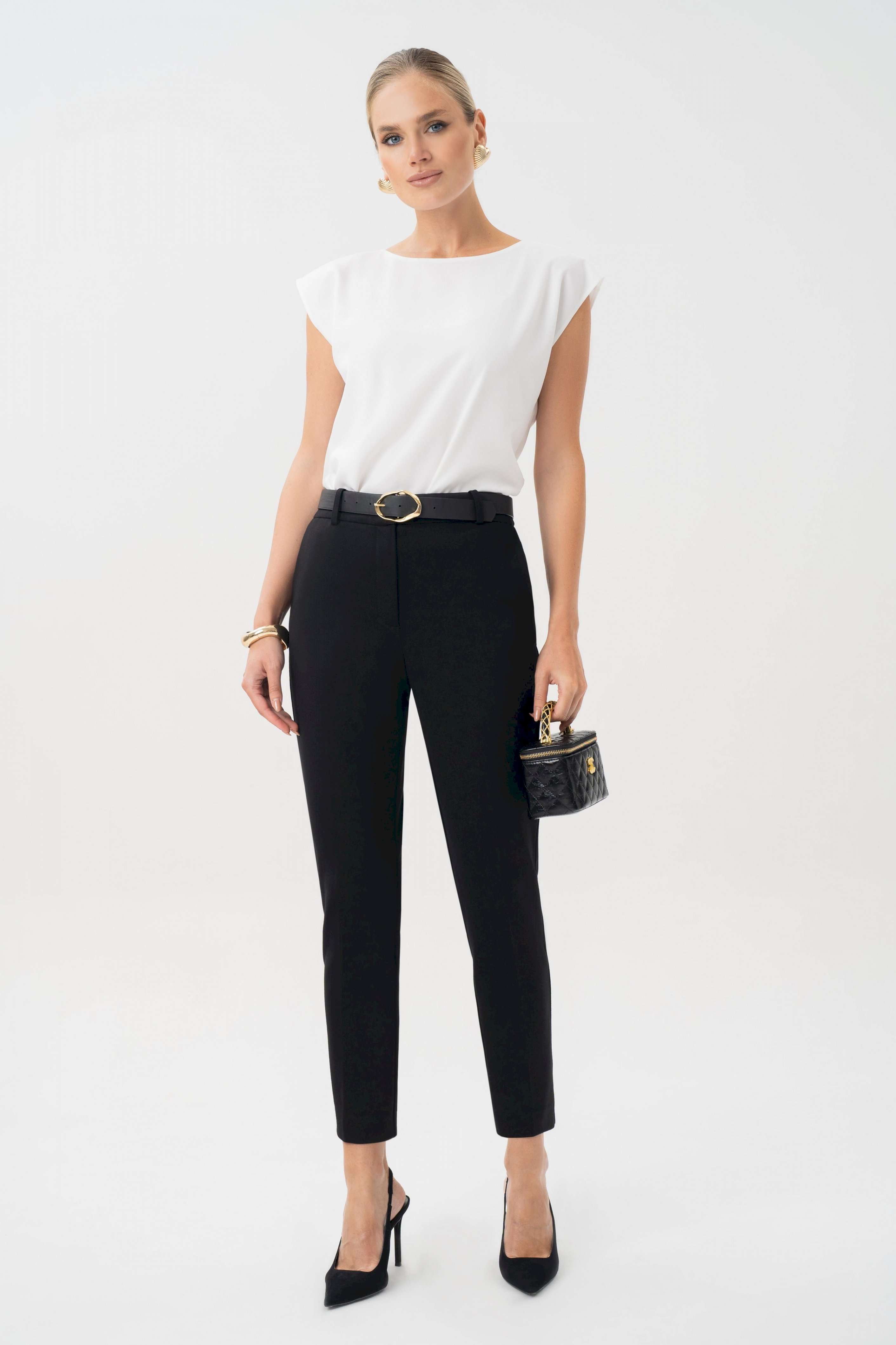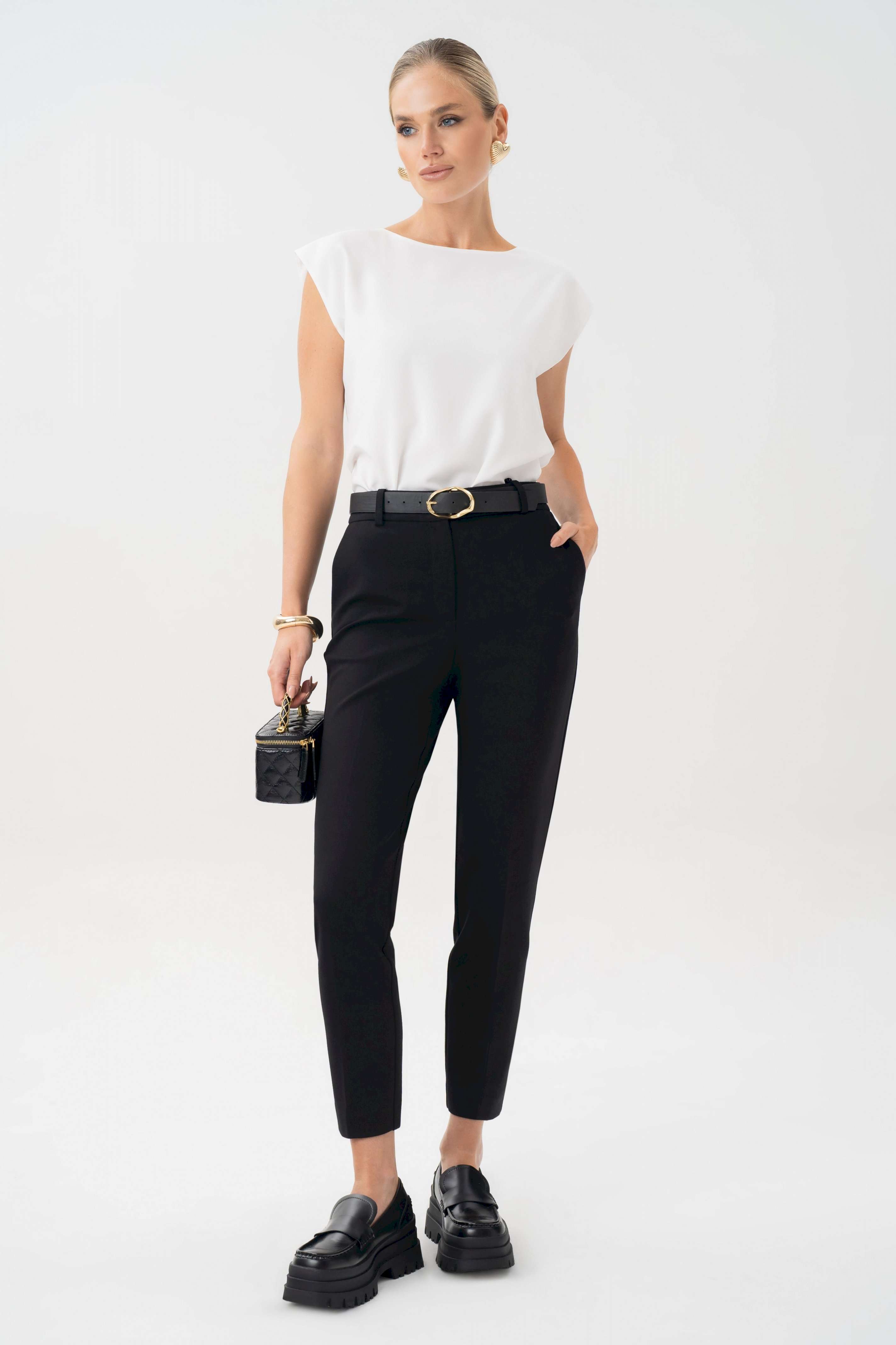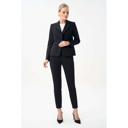 Брюки женские классические всегда остаются актуальными вне зависимости от модных тенденций. Брюки прекрасно комбинируется с блузой 24-425-1 и являются комплектом к жакету 25-641-1. Брюки женские, выполнены из трикотажного полотна, зауженные к низу, на обтачном поясе, с 5-ю шлевками, с застежкой на тесьму - «молнию», расположенную в среднем шве передних половинок. Пояс застегивается спереди на пришивной крючок, 1 петлю и потайную пуговицу. Передние половинки брюк с боковыми наклонными карманами, с заутюженными стрелками. Задние половинки с вытачками, с заутюженными стрелками. Левая задняя половинка с функциональным прорезным карманом с листочкой. Брюки предназначены для повседневной носки. Средняя длина брюк по боковому шву с поясом 99,0см (±3,0 см).