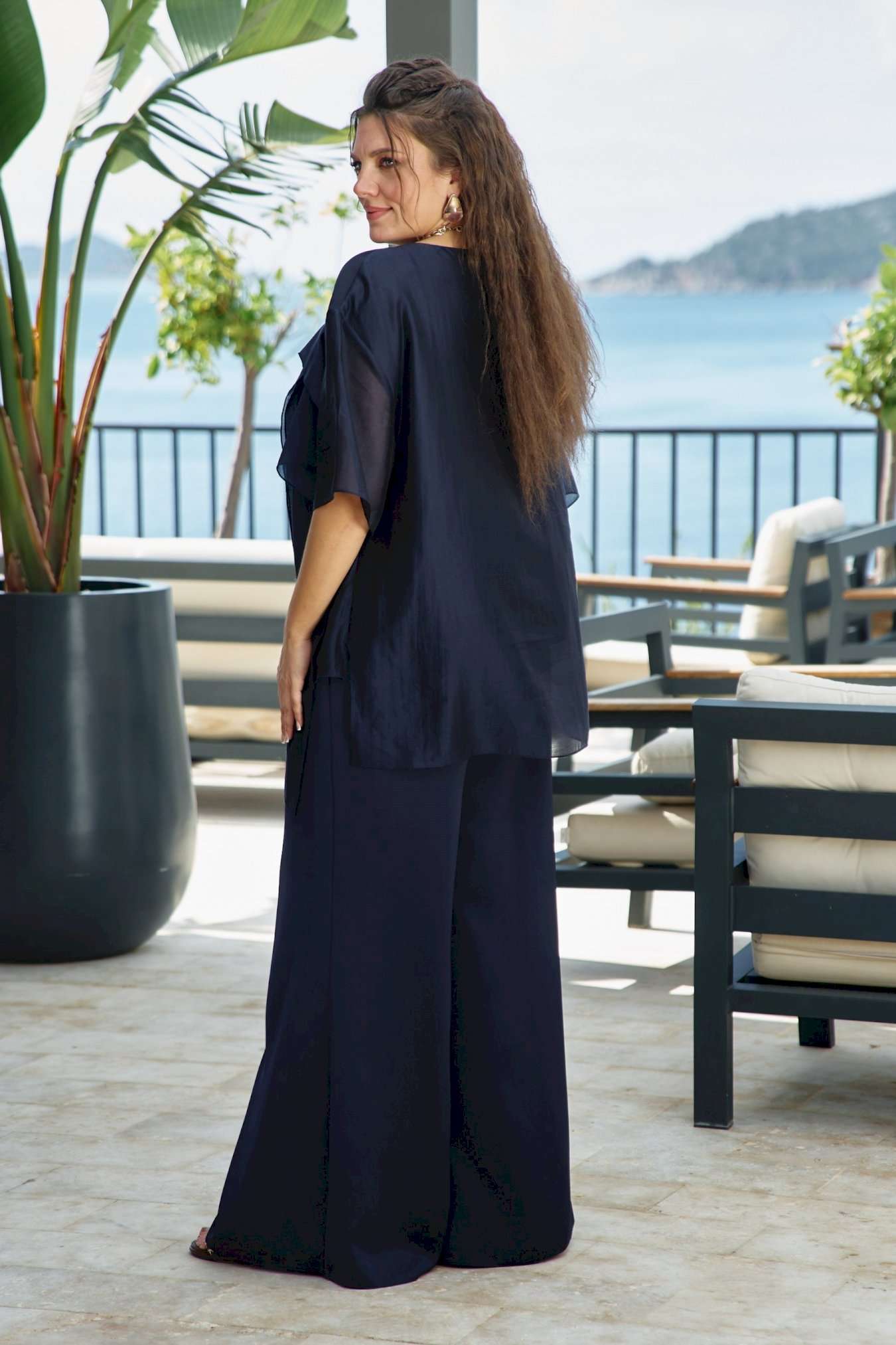 Широкие брюки глубокого синего оттенка, свободно свисают, создавая плавные линии и элегантную силуэтность. Ткань, из которой они выполнены, обладает текстурой, придавая образу нотку роскоши и комфорта. Брюки идеально подчеркивают фигуру, создавая стильный и уверенный вид. Брюки свободного силуэта, расширяются к низу. Пояс притачной на резинке, что обеспечивает максимально удобную посадку на любой тип фигуры, в боковых швах карманы. Длина брюк 108 см.
