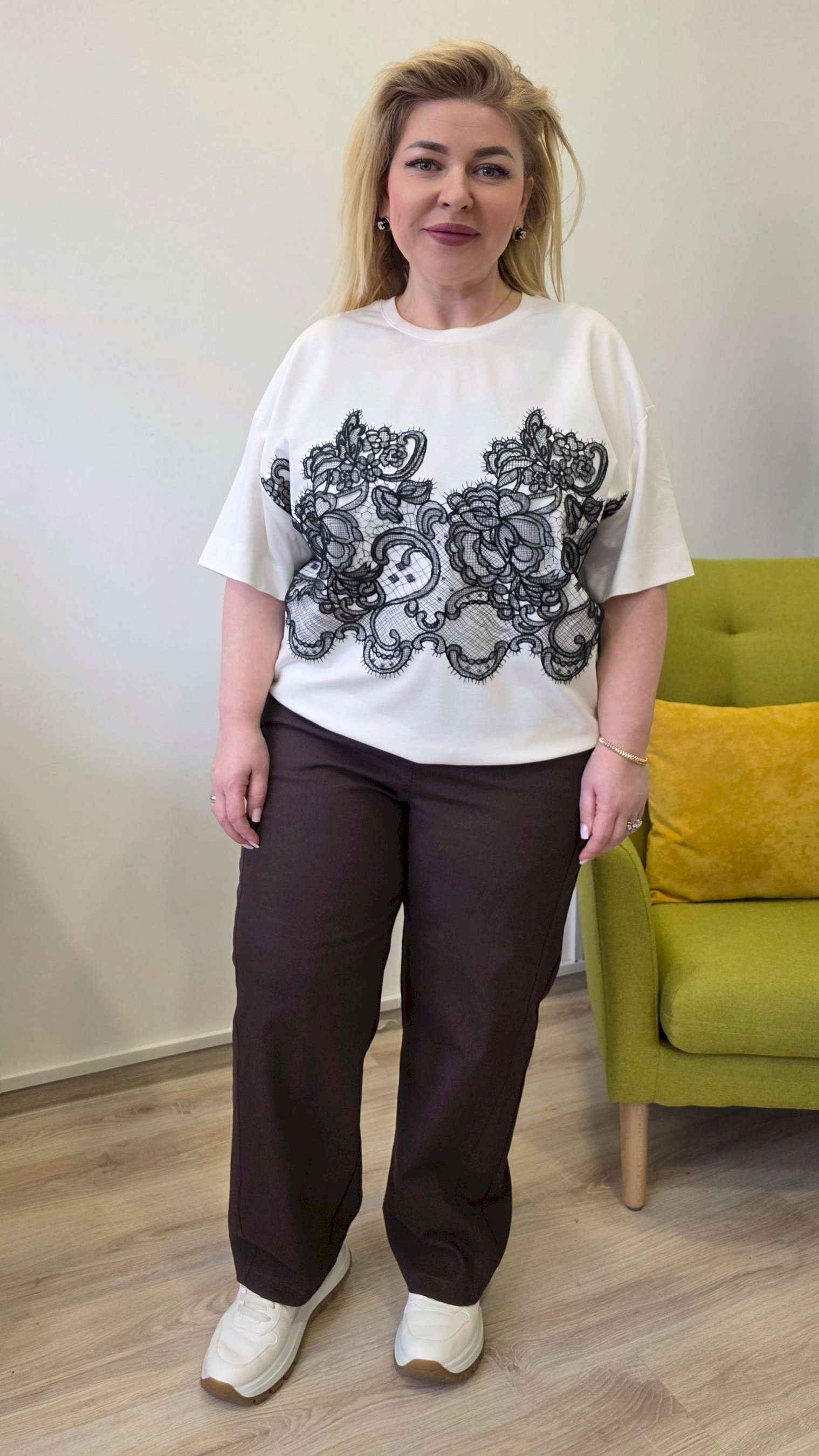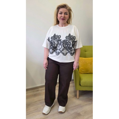 Брюки женские, прямого силуэта идеально сидят на фигуре. Это вещь для тех, кто ценит уютную элегантность и хочет выглядеть продуманно, но непринуждённо. Служат основой для минималистичных ансамблей и для более смелых цветовых сочетаний, универсальны — выглядят органично и летом, и в межсезонье. Брюки прямого силуэта, немного заужаются к низу, застежкой на тесьму молнию в гульфике и пуговицу в поясе. В поясе брюк вставка эластичной тесьмы резинки резинки «в бочках», а так же декоративные рельефы по переду. По переду брюк наклонные карманы. В задних половинках брюк вставка декоративной кокетки и накладные карманы. Длина брюк 97 см.