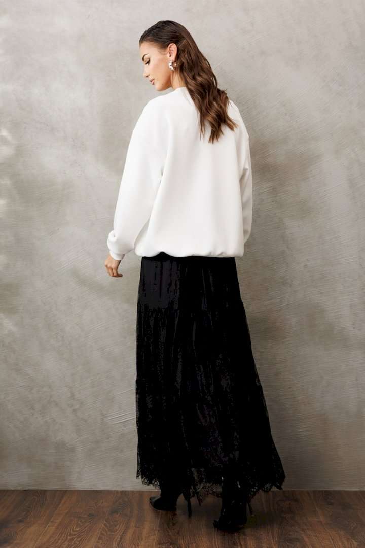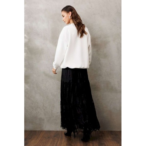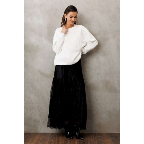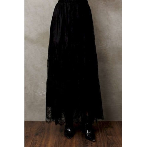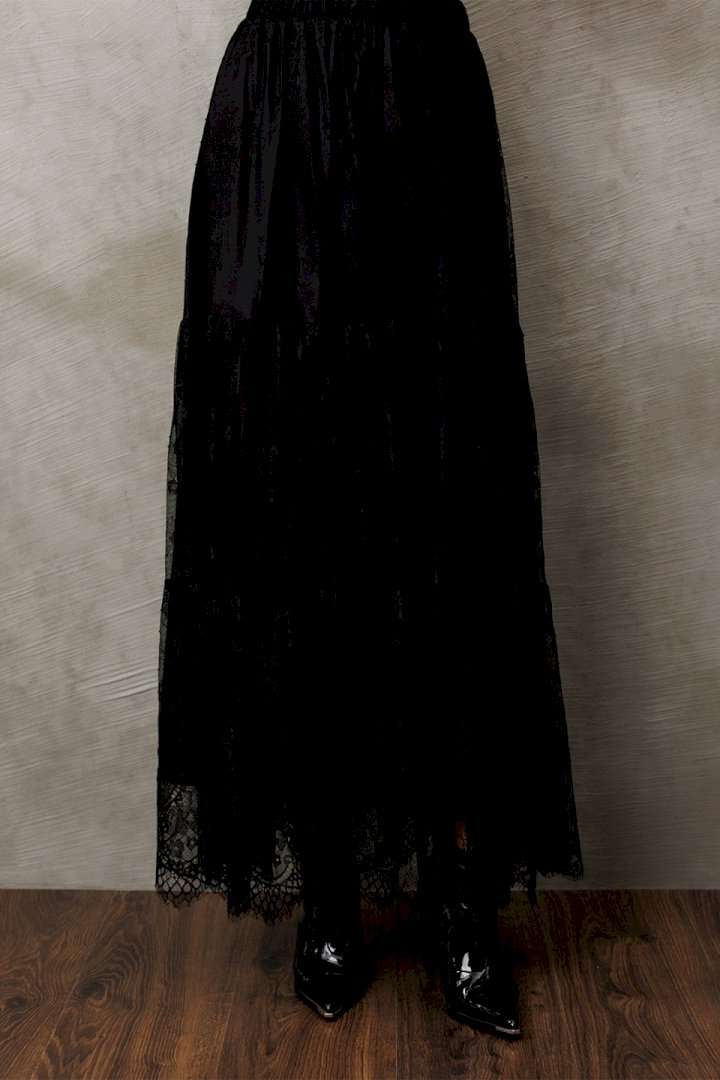 Юбка из кружева длинная на притачном поясе из кружева со вставленной в него резинкой. Юбка с 2-мя притачными слегка присборенными воланами. Юбка на подкладке.