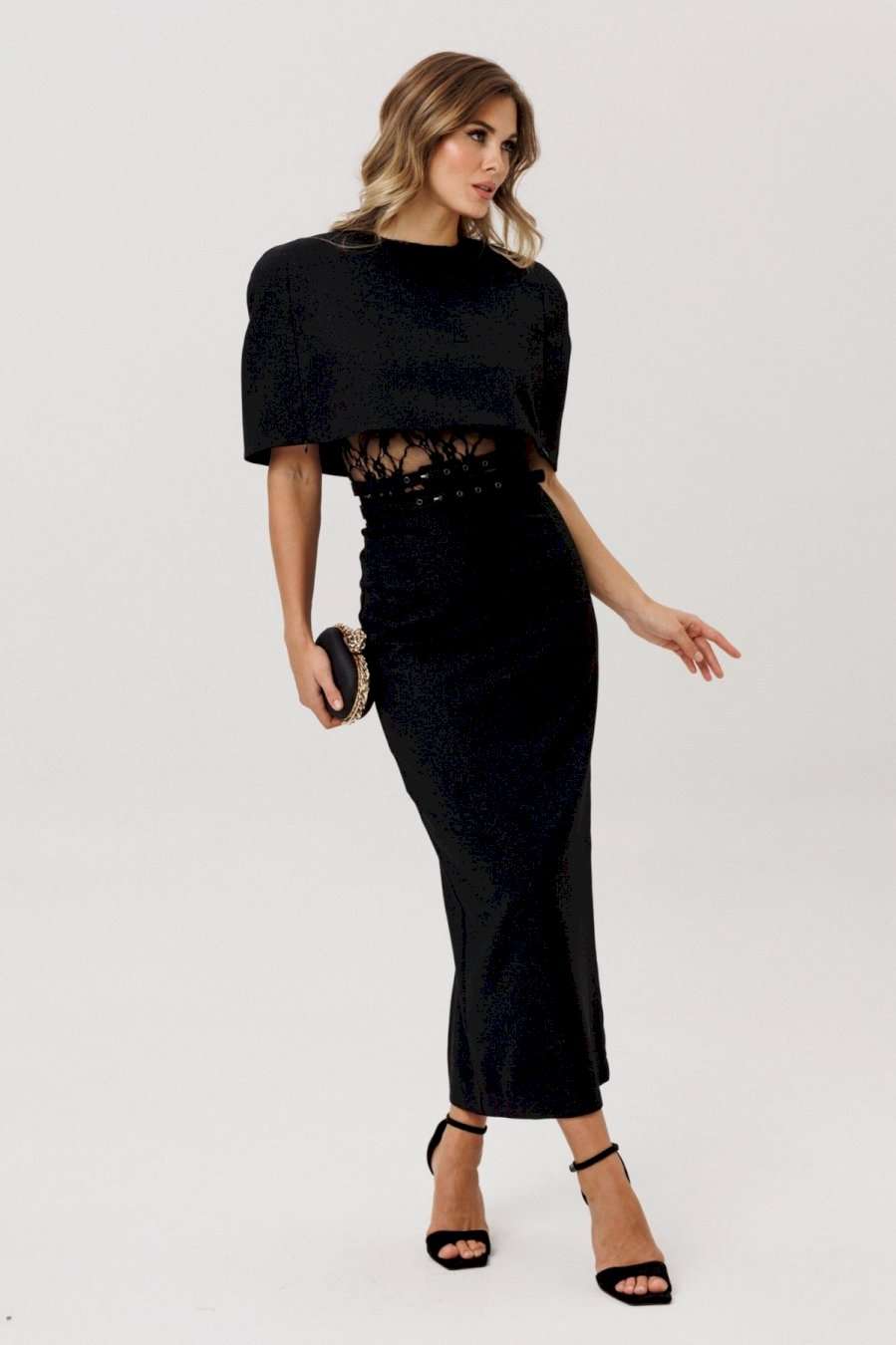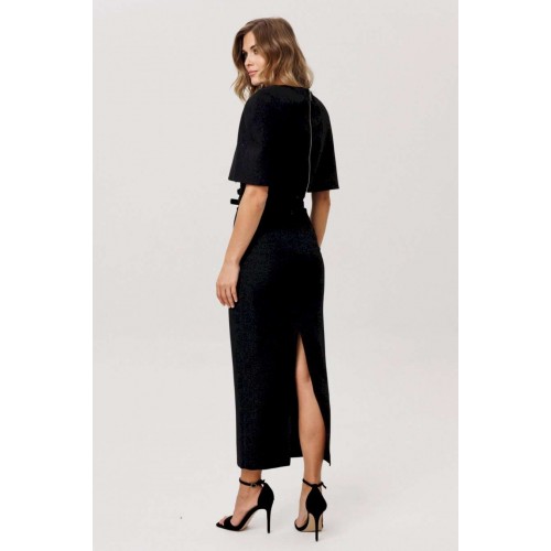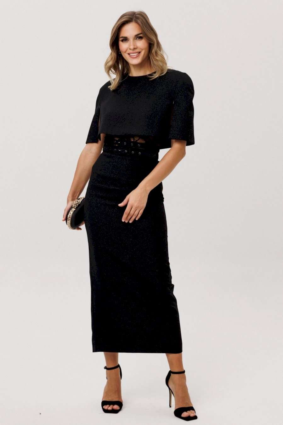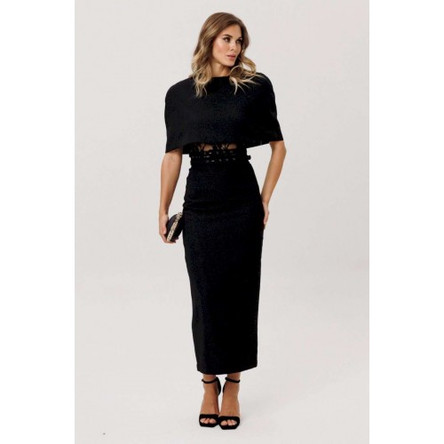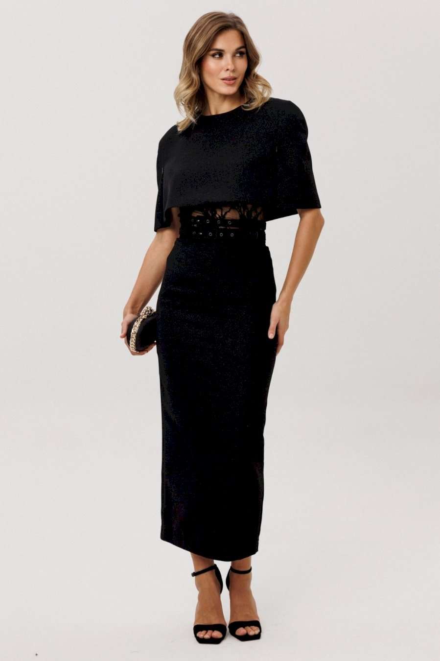 Юбка выполнена из костюмно-плательной ткани с блеском. Юбка прямого силуэта, зауженная к низу, длиной миди. Юбка на поясе, застегивающимя на петлю и пуговицу и на потайную молнию сзади в среднем шве. Юбка на отлетной по низу подкладке. В комплект входит два съемных ремня из основной ткани с обтяжной пряжкой и блочками. Длина юбки - 92,5 см.