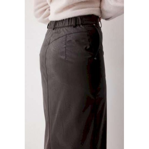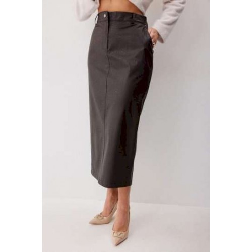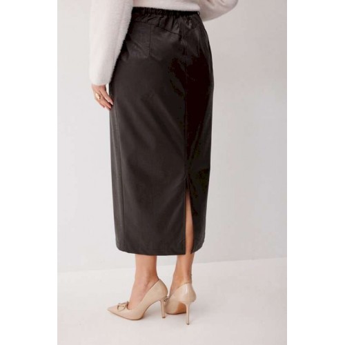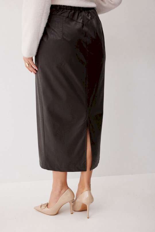 Юбка-карандаш женская из искусственной кожи. Длина юбки до середины икры. По переду в юбке обработаны карманы с отрезным бочком, по концам кармана установлены хольнитены. Перед юбки с центральным швом, в котором обработан гульфик с застежкой – молнией. Спинка юбки со средним швом в котором располагается разрез. Верх спинки юбки с отрезной фигурной кокеткой и вытачками. Верхний срез юбки обработан отрезным поясом, с резинкой по спинке и шлевками. Пояс застегивается на кнопку. Длина юбки по боковому шву 90 см.