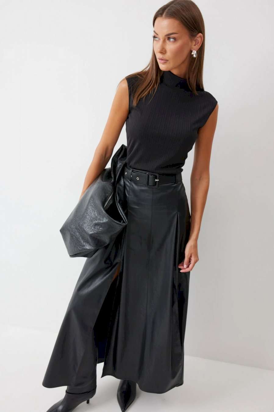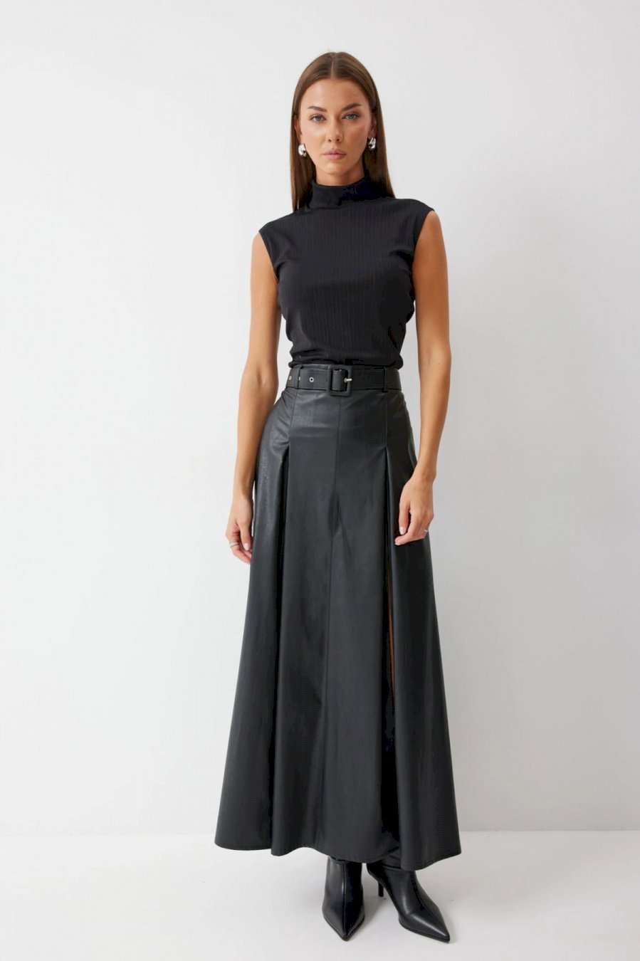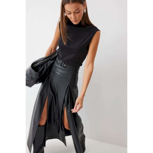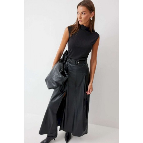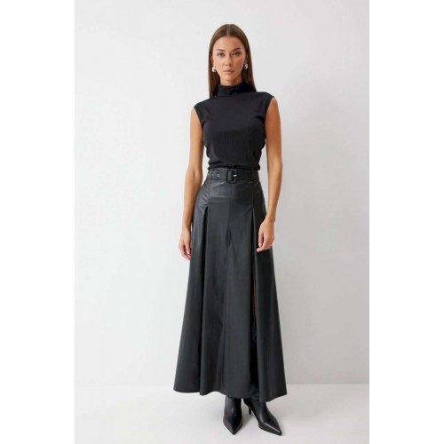 Стильная юбка А-силуэта из экокожи , длины макси. По верху юбки притачной пояс с шлевками для ремня. На передних половинках расположены вытачки со встречной складкой и разрезами по низу. На задних половинках расположены талиевые вытачки. На спинке по центру потайная молния. В комплект входит ремень. Подробное описание Длина юбки: 99 см + 4,5 см пояс