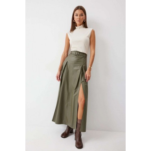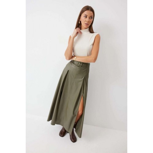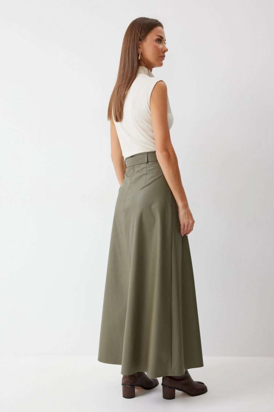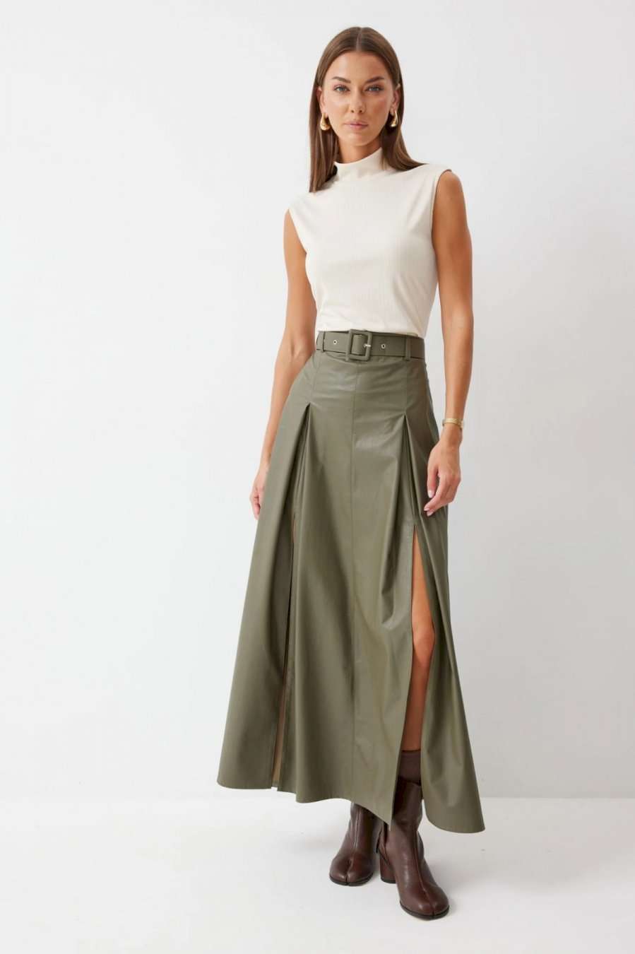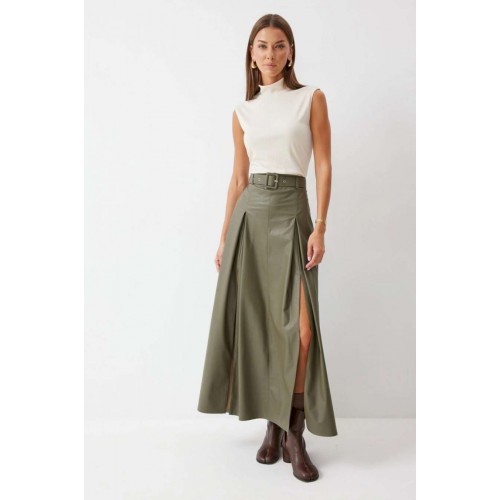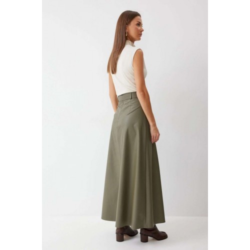 Стильная юбка А-силуэта из экокожи , длины макси. По верху юбки притачной пояс с шлевками для ремня. На передних половинках расположены вытачки со встречной складкой и разрезами по низу. На задних половинках расположены талиевые вытачки. На спинке по центру потайная молния. В комплект входит ремень. Подробное описание Длина юбки: 99 см + 4,5 см пояс