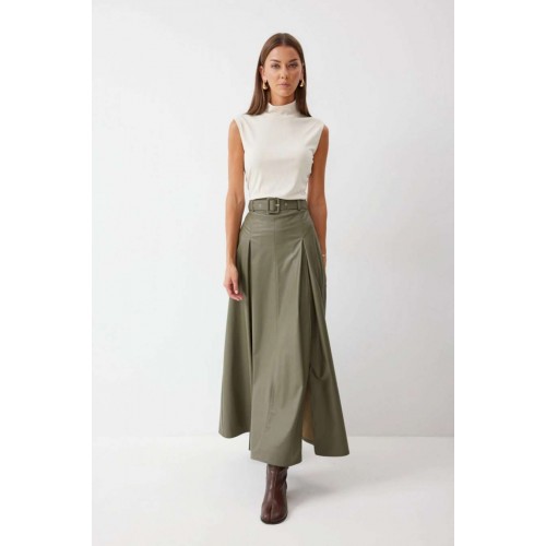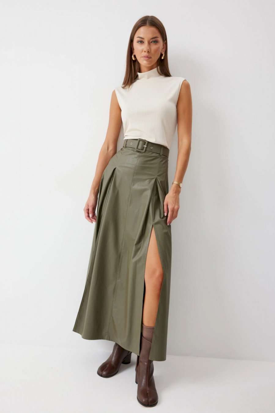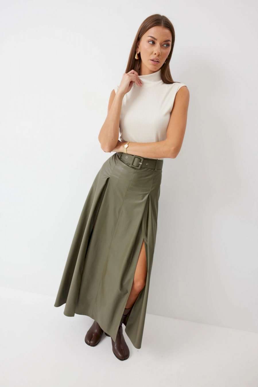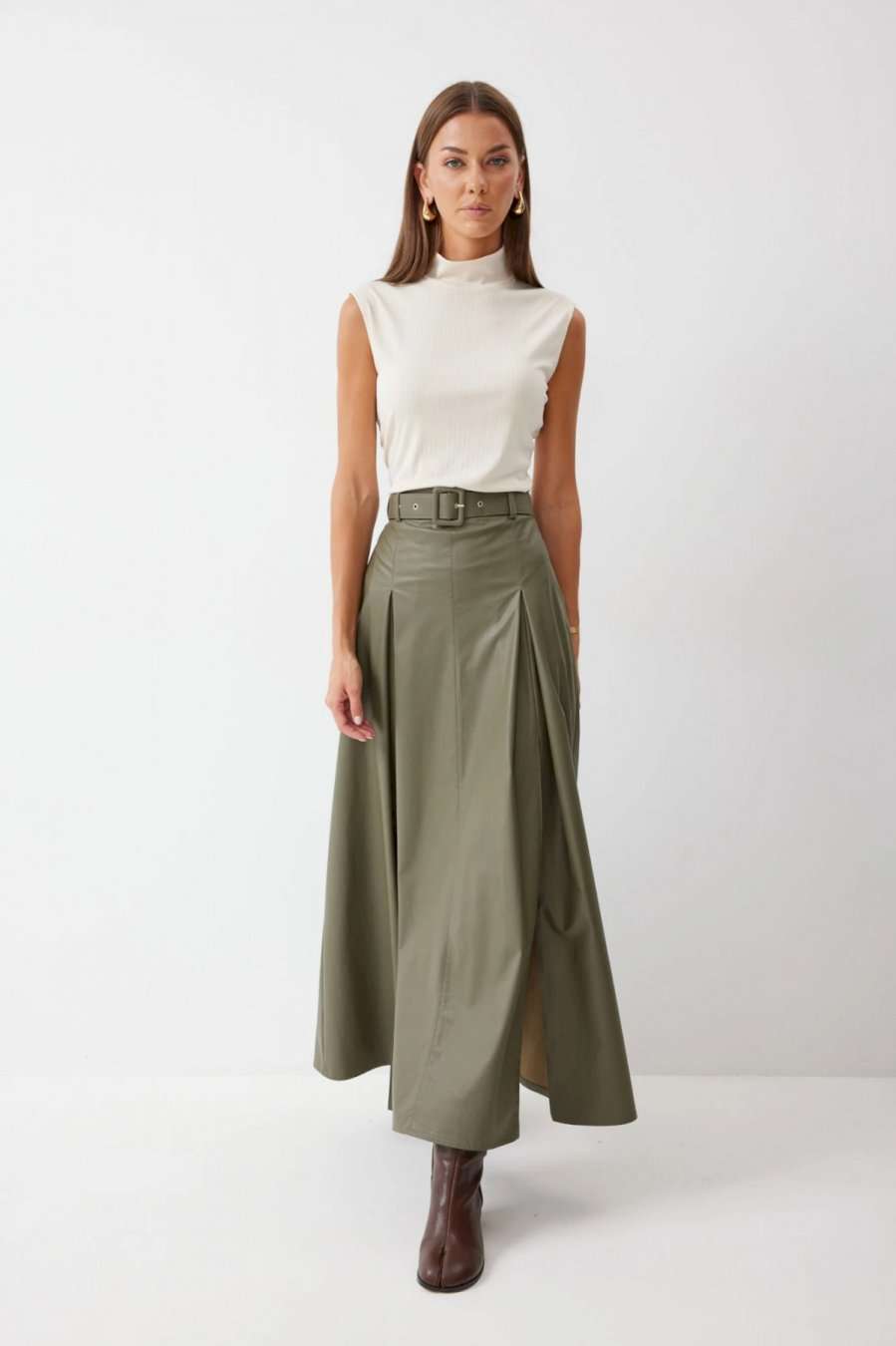 Стильная юбка А-силуэта из экокожи , длины макси. По верху юбки притачной пояс с шлевками для ремня. На передних половинках расположены вытачки со встречной складкой и разрезами по низу. На задних половинках расположены талиевые вытачки. На спинке по центру потайная молния. В комплект входит ремень. Подробное описание Длина юбки: 99 см + 4,5 см пояс