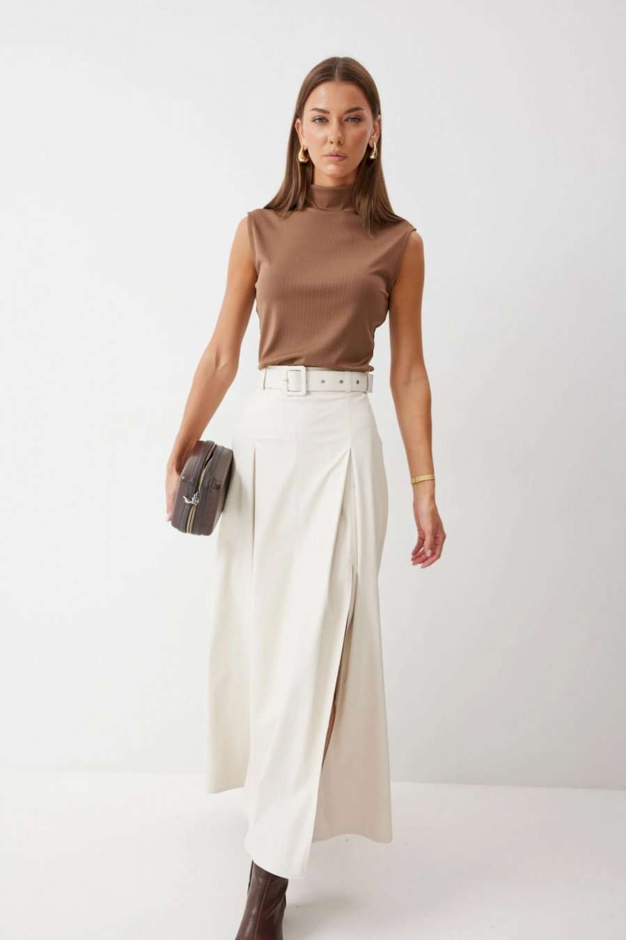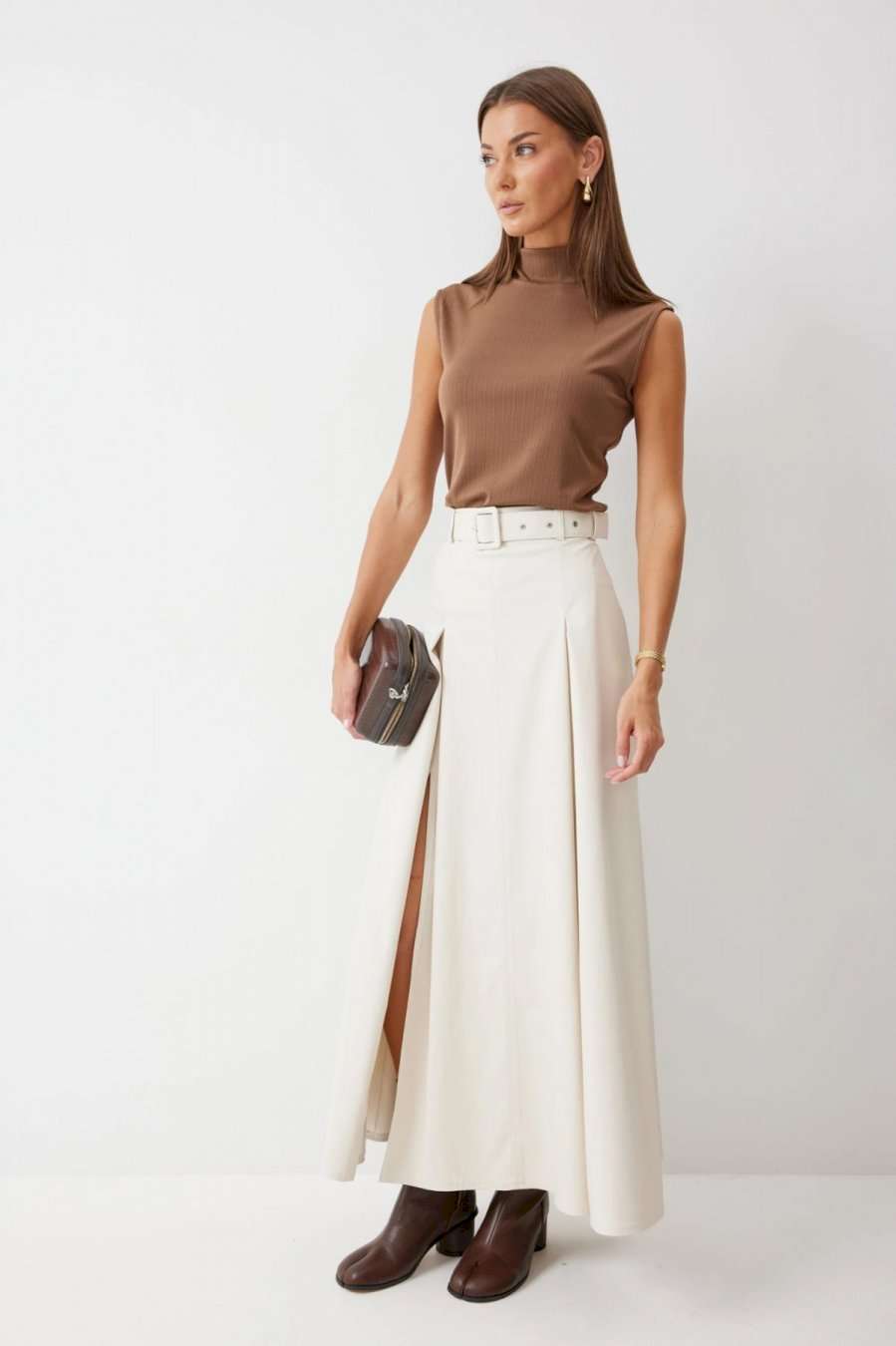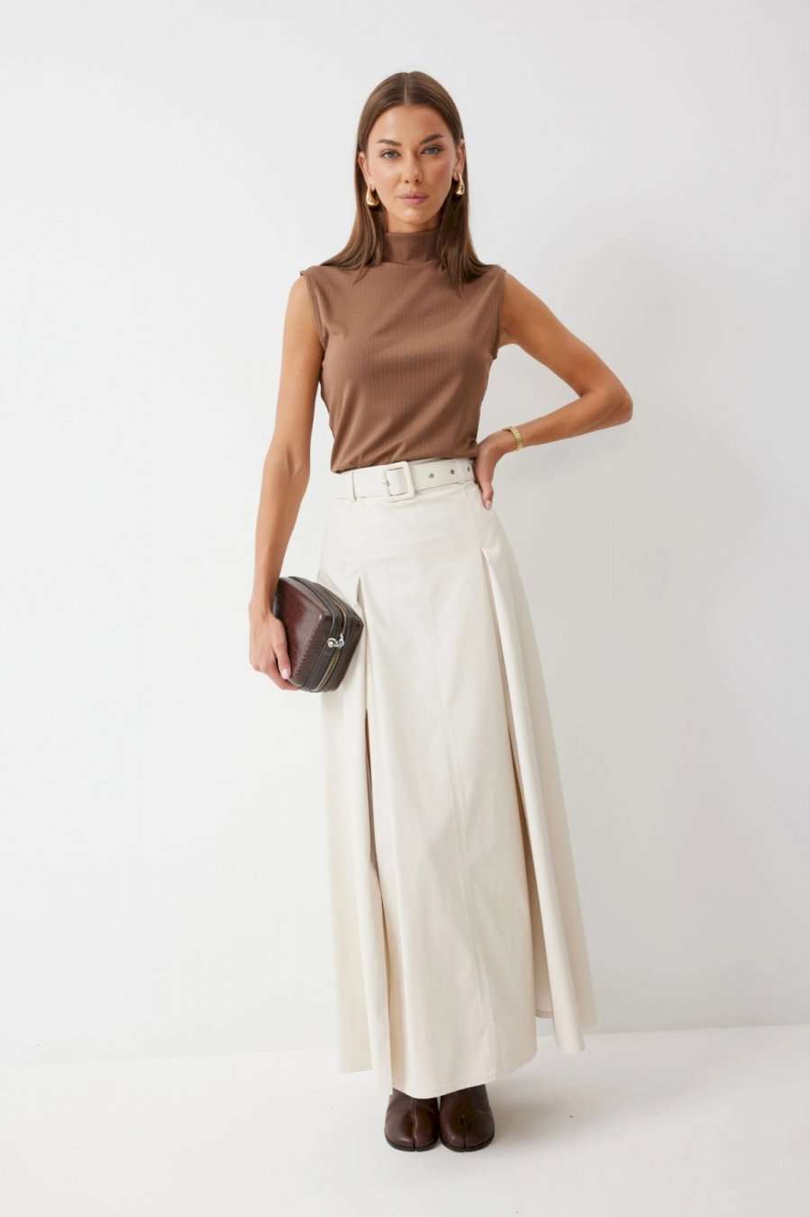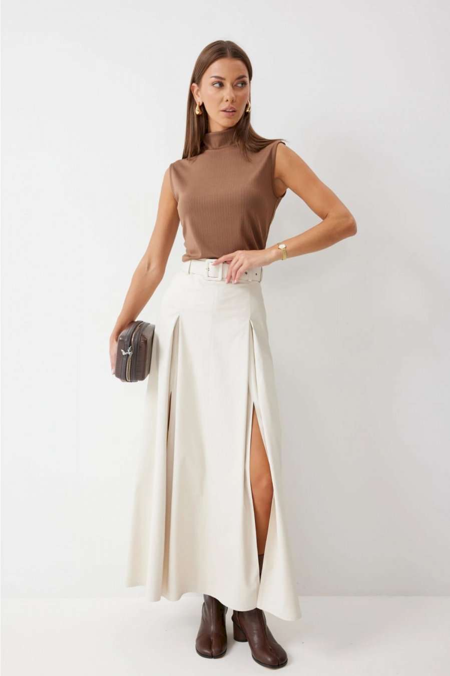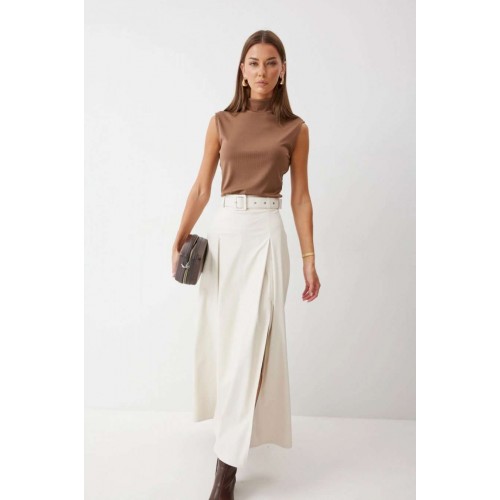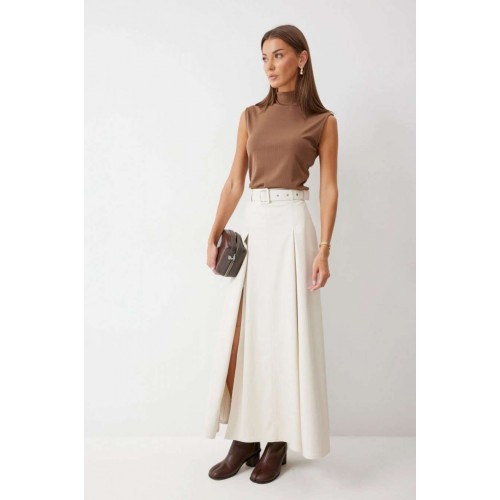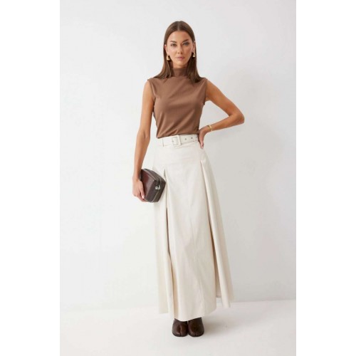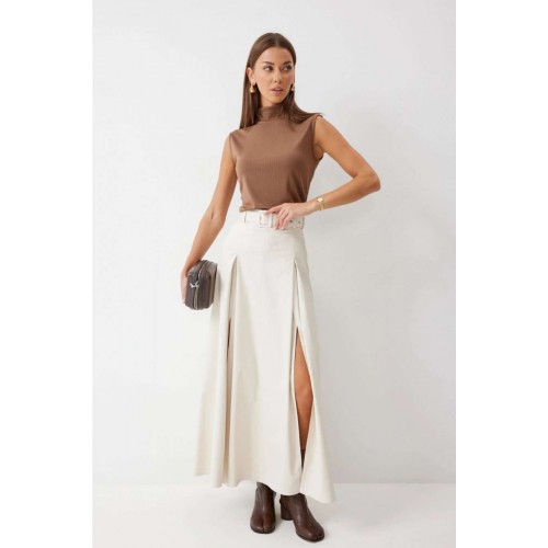 Стильная юбка А-силуэта из экокожи , длины макси. По верху юбки притачной пояс с шлевками для ремня. На передних половинках расположены вытачки со встречной складкой и разрезами по низу. На задних половинках расположены талиевые вытачки. На спинке по центру потайная молния. В комплект входит ремень. Подробное описание Длина юбки: 99 см + 4,5 см пояс
