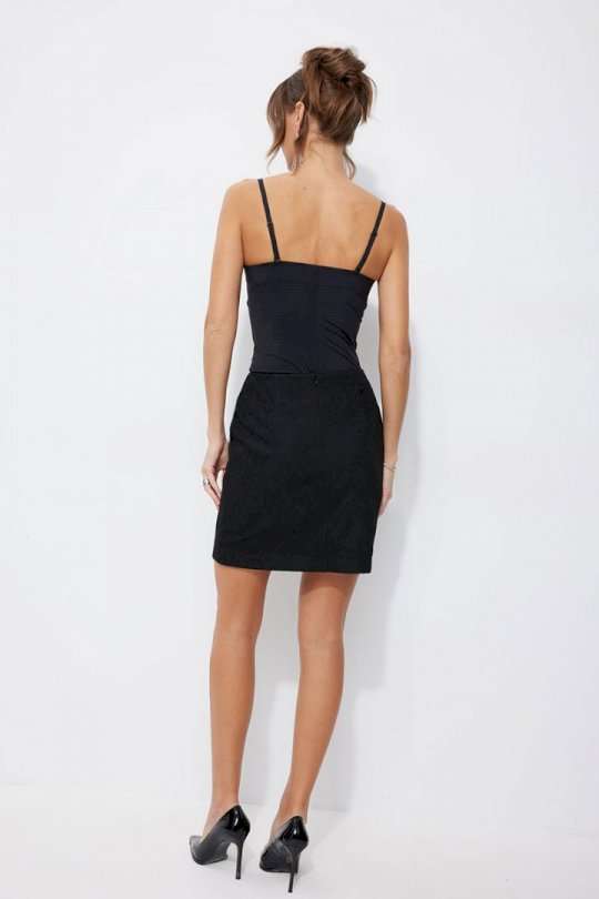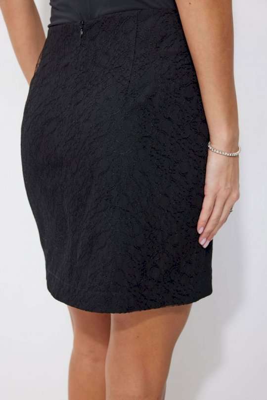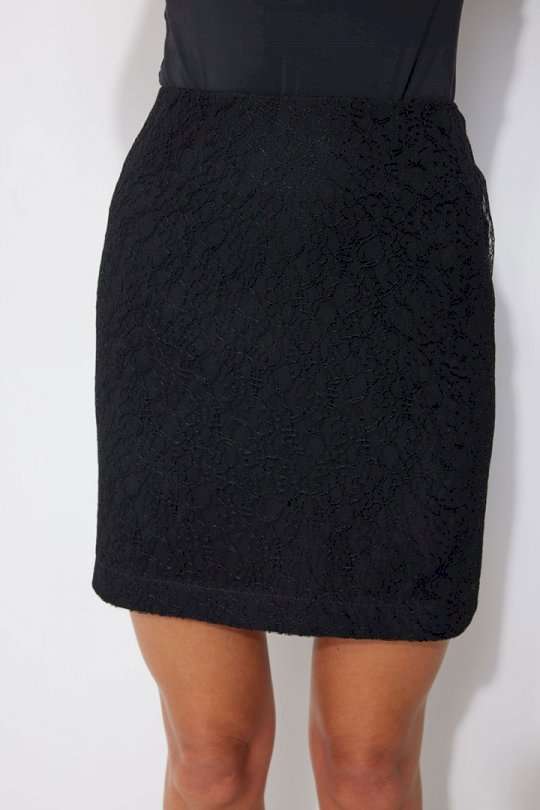 Нарядная мини-юбка. Верхний слой юбки выполнен из кружевной ткани. Нижний слой юбки - плотная струящаяся ткань. С потайной молнией в среднем шве заднего полотнища. Длина юбки 44-48р 44 см, в 50-54р 52 см.
