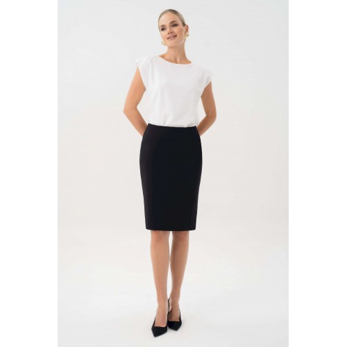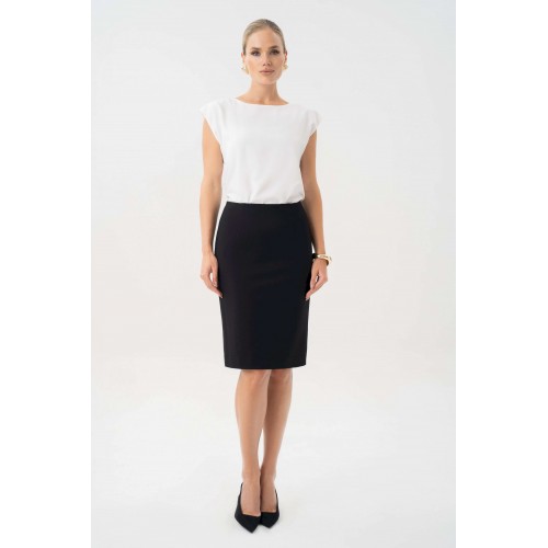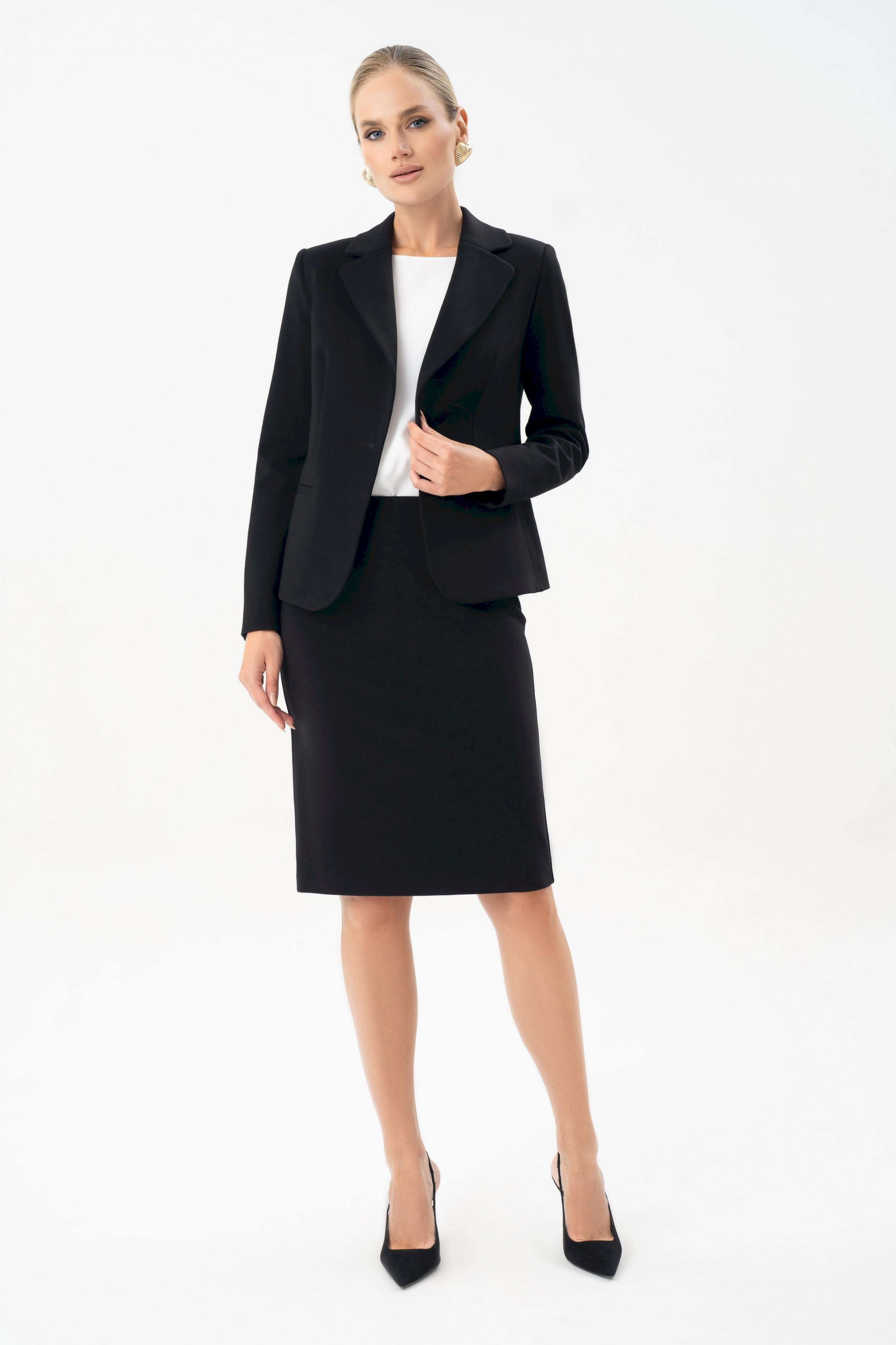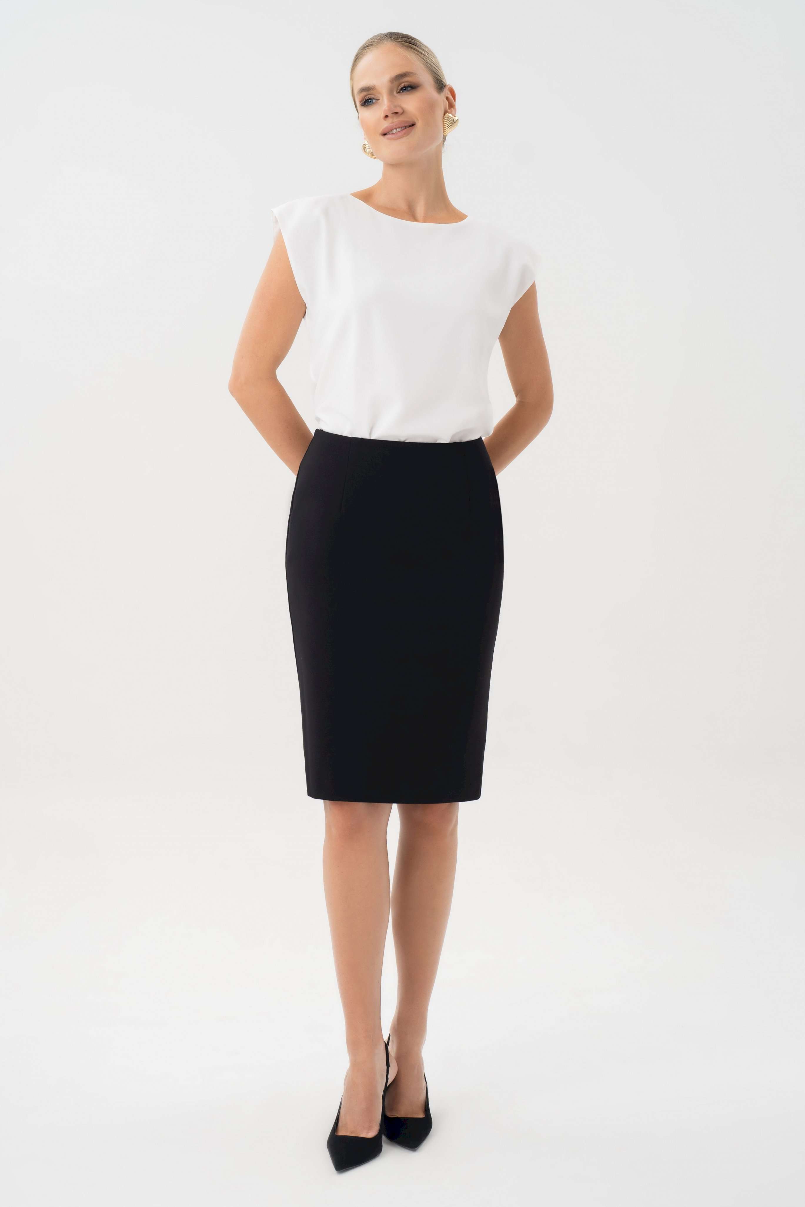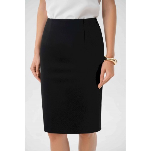 Юбка женская черная URS – это классический элемент базового гардероба, который остается актуальным в любое время года. Юбка прекрасно комбинируется с блузой 24-425-1 и является комплектом к жакету 25-641-1. Юбка женская, зауженная к низу, с посадкой на талии, выполнена из трикотажного полотна, на отлетной по низу подкладке. Юбка предназначена для повседневной носки. Верхний край обработан обтачкой. Переднее полотнище с талиевыми вытачками. Заднее полотнище с талиевыми витачками и средним швом, в верхней части с застежкой на потайную тесьму-молнию, в нижней – со шлицей. Средняя длина юбки по боковому шву заднего полотнища 63,0см (±3,0 см). Тип ткани: трикотажное полотно.