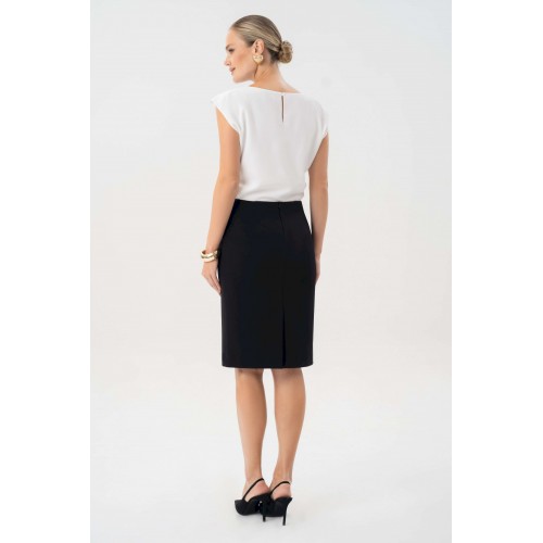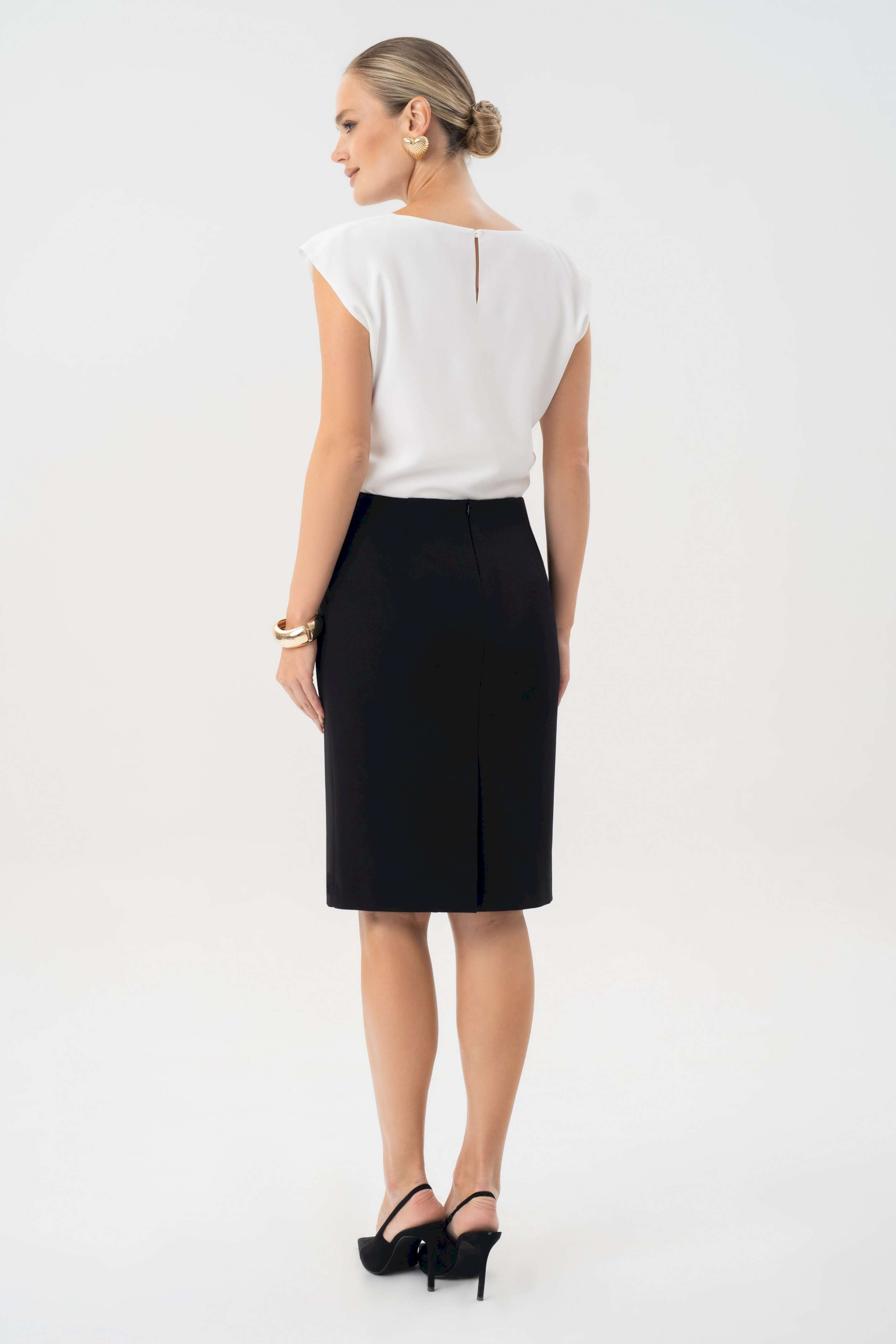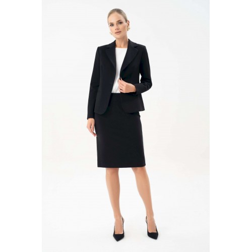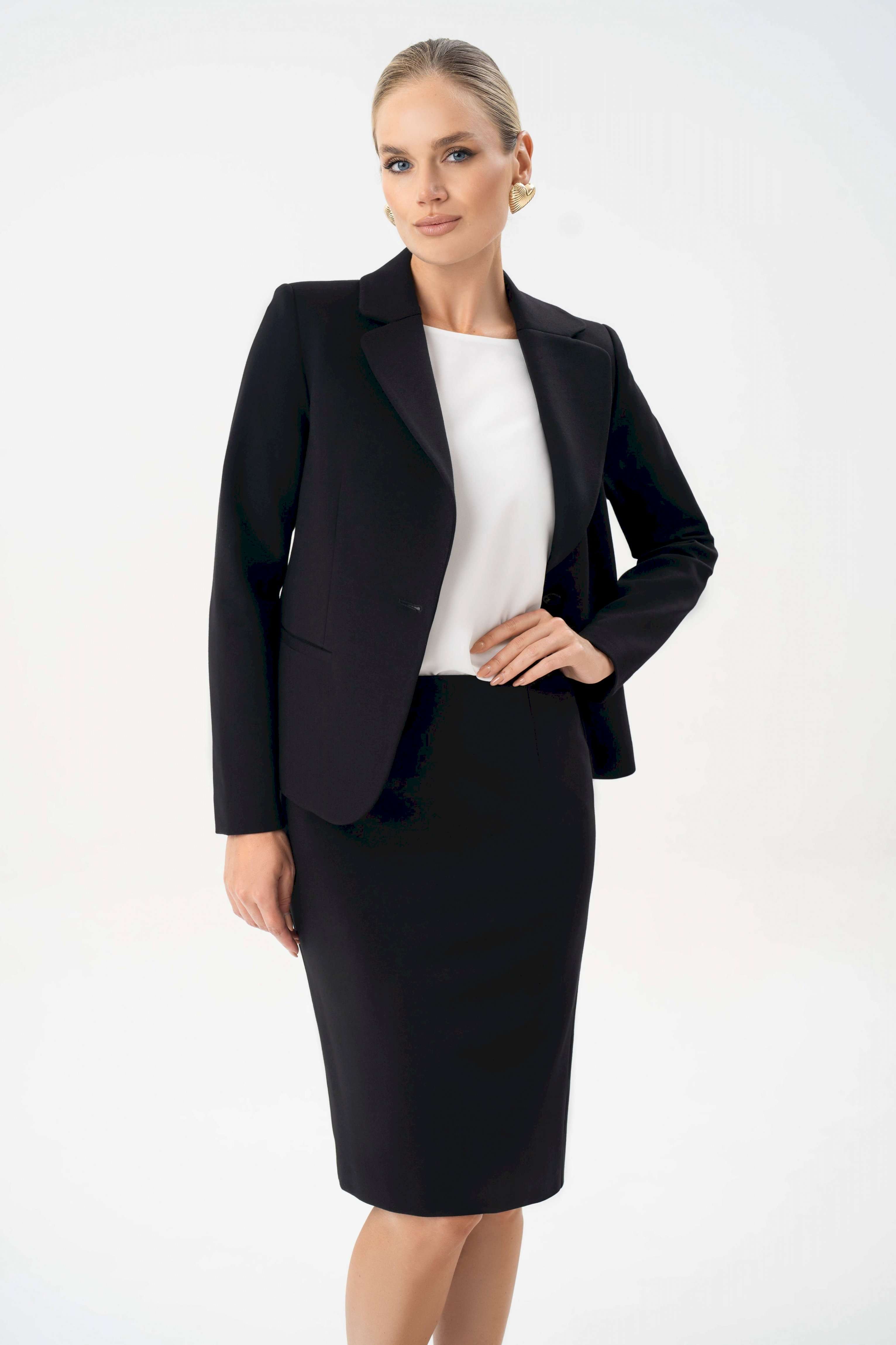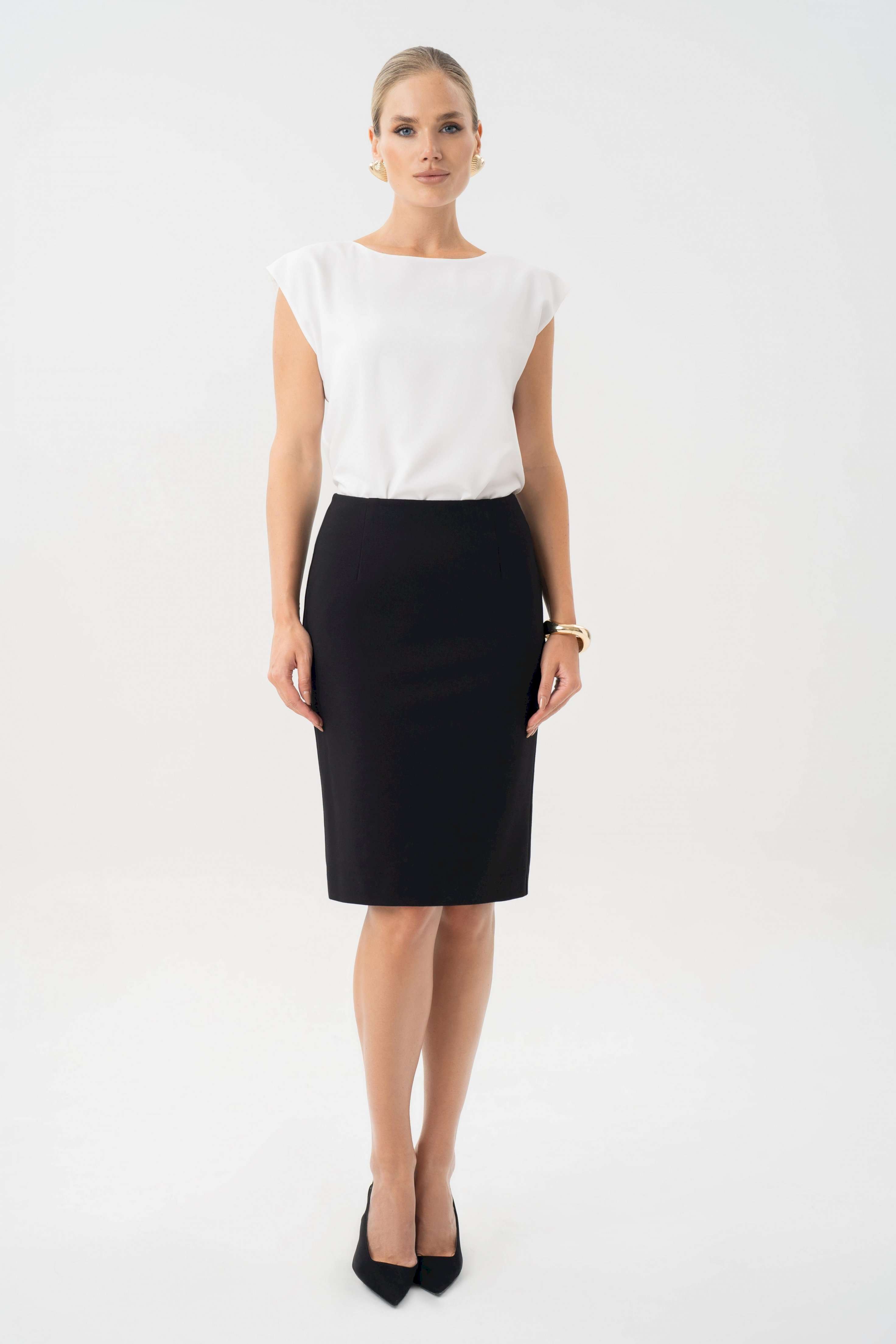 Юбка женская черная URS – это классический элемент базового гардероба, который остается актуальным в любое время года. Юбка прекрасно комбинируется с блузой 24-425-1 и является комплектом к жакету 25-641-1. Юбка женская, зауженная к низу, с посадкой на талии, выполнена из трикотажного полотна, на отлетной по низу подкладке. Юбка предназначена для повседневной носки. Верхний край обработан обтачкой. Переднее полотнище с талиевыми вытачками. Заднее полотнище с талиевыми витачками и средним швом, в верхней части с застежкой на потайную тесьму-молнию, в нижней – со шлицей. Средняя длина юбки по боковому шву заднего полотнища 63,0см (±3,0 см). Тип ткани: трикотажное полотно.