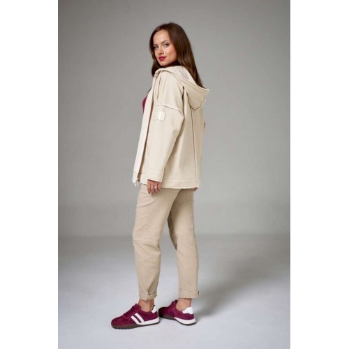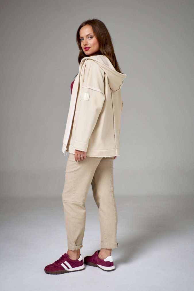 Толстовка из плотного хлопкового футера с мягкой флисовой изнанкой, с застежкой на молнию и капюшоном. Рукав длинный. Линия плеча спущена. На переде удобные прорезные карманы. В капюшоне кулиса со шнуром. Некоторые швы изделия выполнены сырым срезом на лицо.