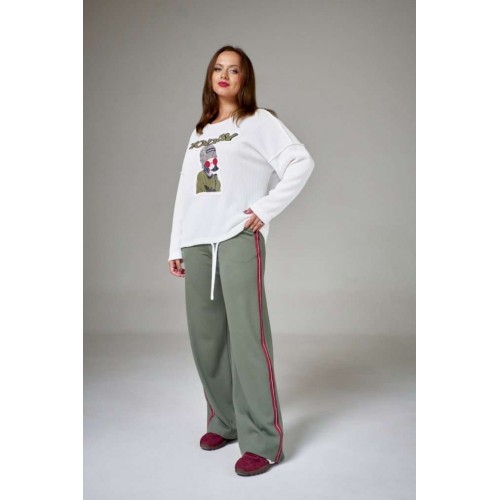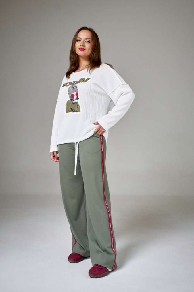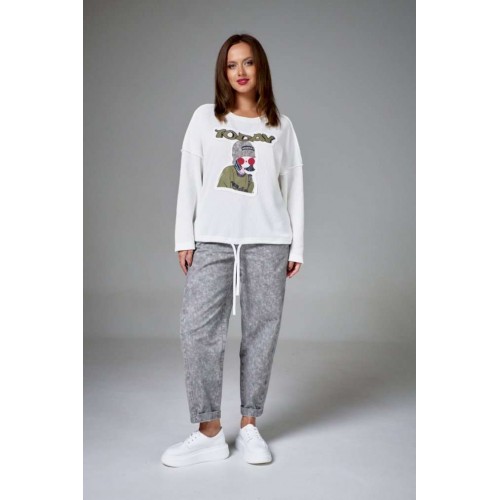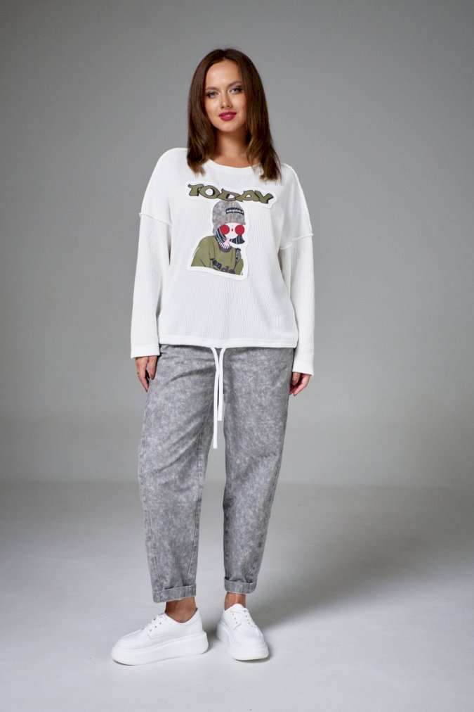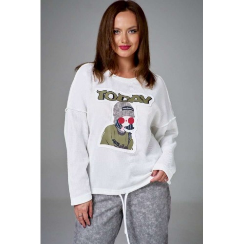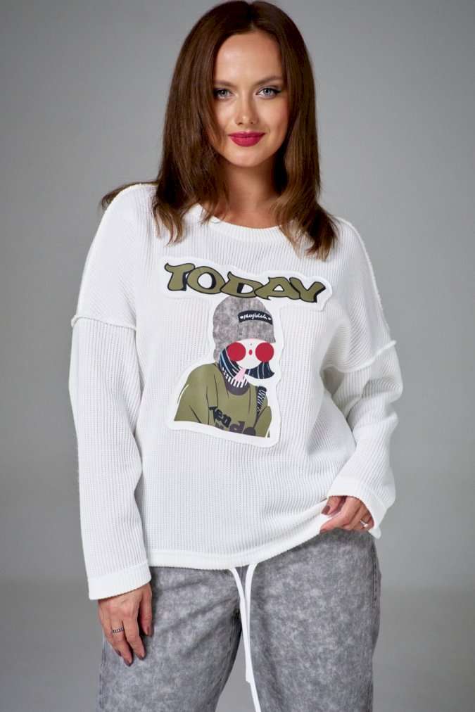 Джемпер из хлопкового трикотажа \"вязка\" на мягкой стабилизирующей основе, свободного силуэта, с круглой горловиной. Рукав длинный, линия плеча спущена. На переде аппликация с авторским принтом. По низу изделия кулиса со шнуром.