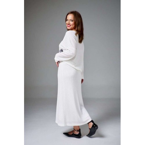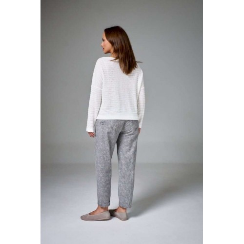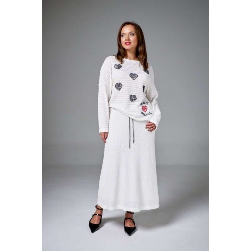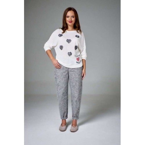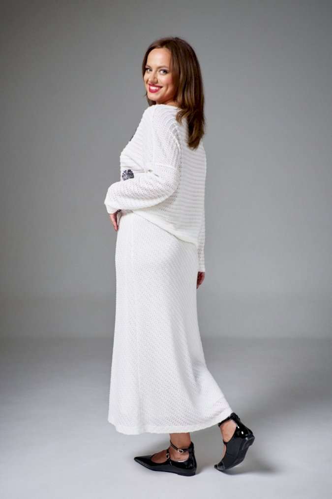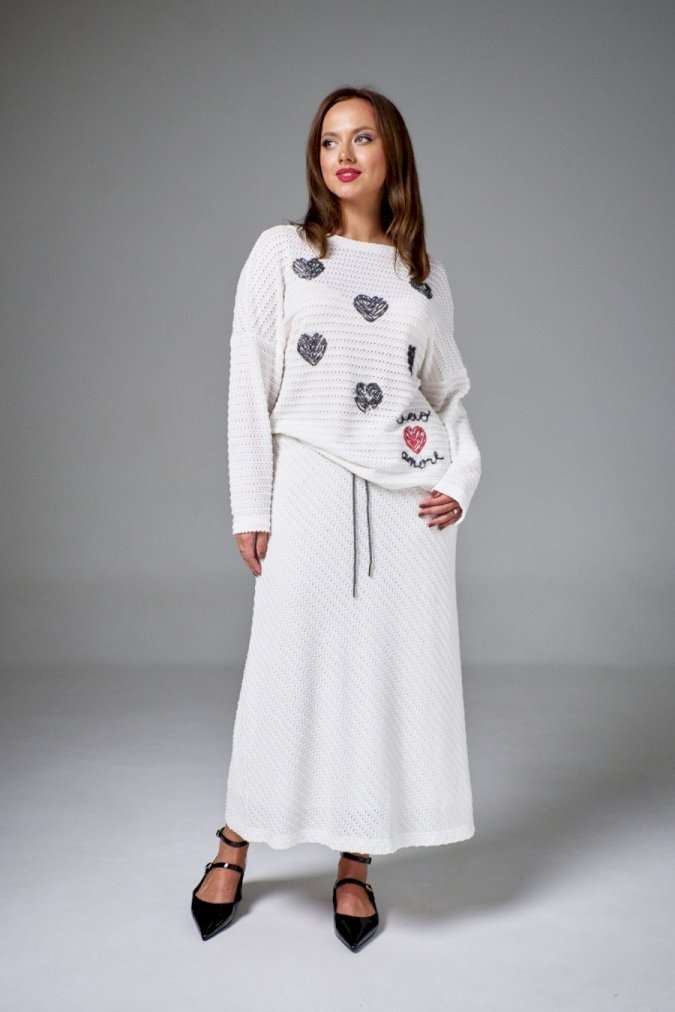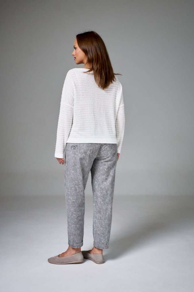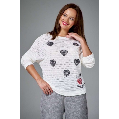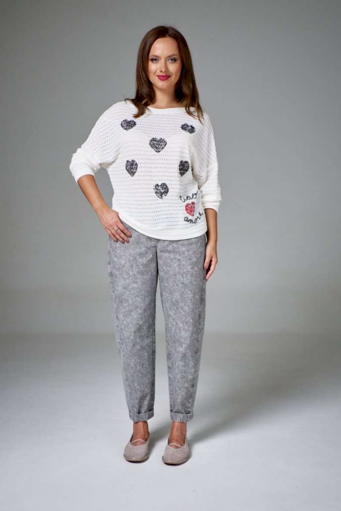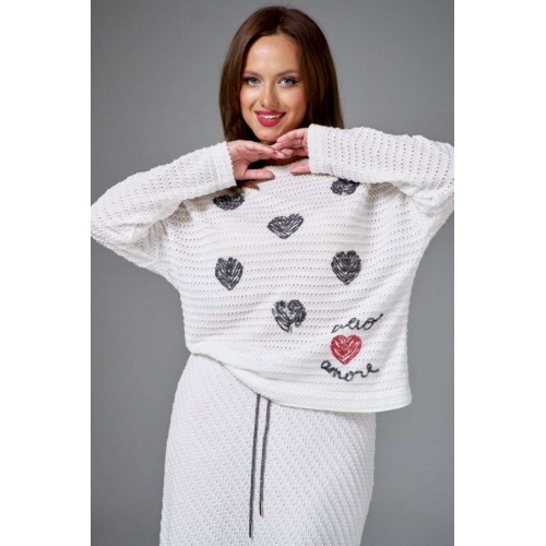 Джемпер из ажурного трикотажа, свободного силуэта, с длинным рукавом и горловиной \"лодочка\". Перед изделия декорированавторской вышивкой с применением пайеток и серебристых нитей.