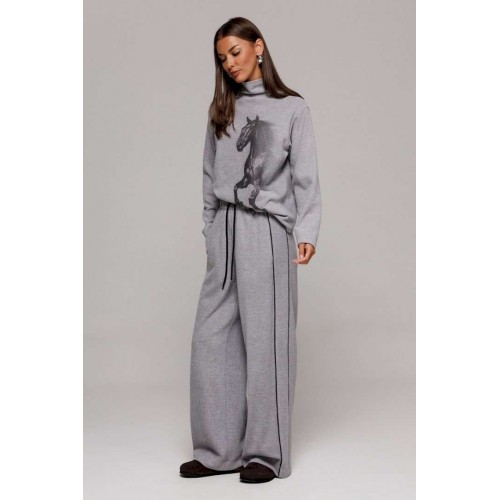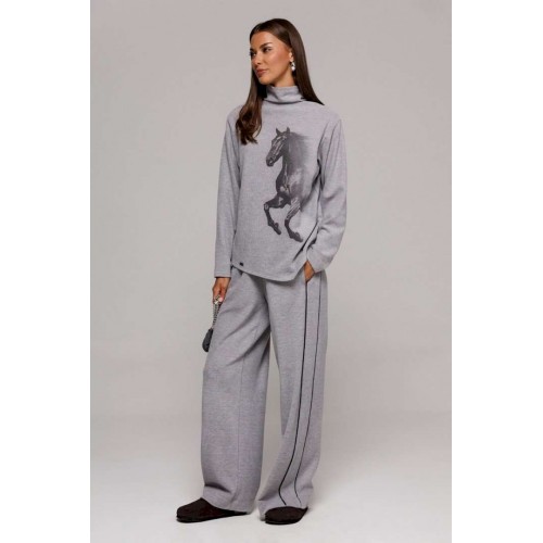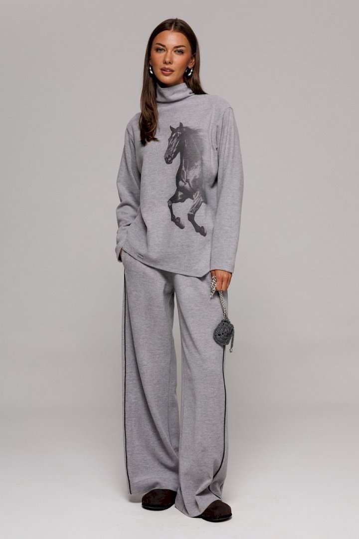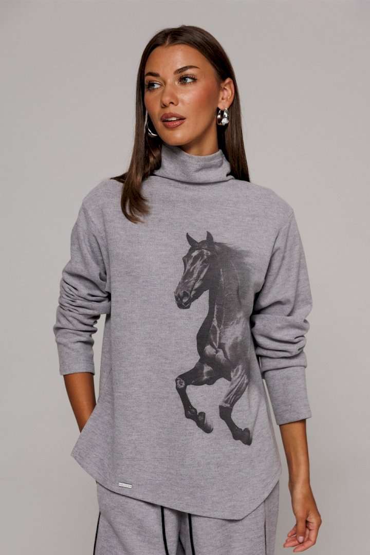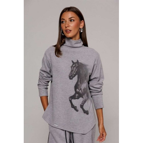 Джемпер из трикотажного полотна с велюровым эффектом прямого силуэта со спущенной линией плеча. Рукав втачной. По переду печать \"Лошадь\" и нашивка с гравировкой \"BUTER\". Низ джемпера по переду фигурный ассиметричный. Внизу по правому боковому шву обработан разрез. Воротник-стойка цельнокроеный.