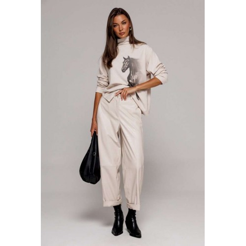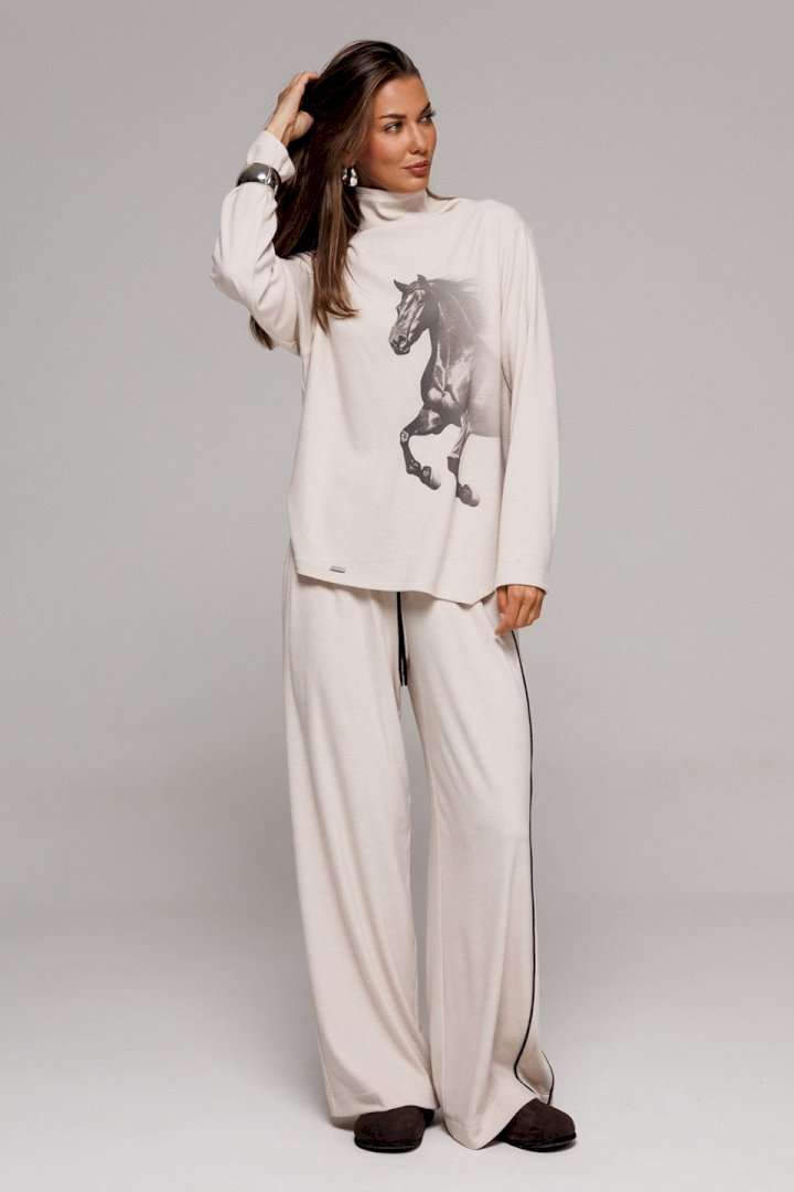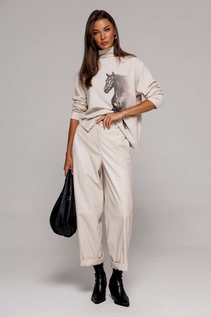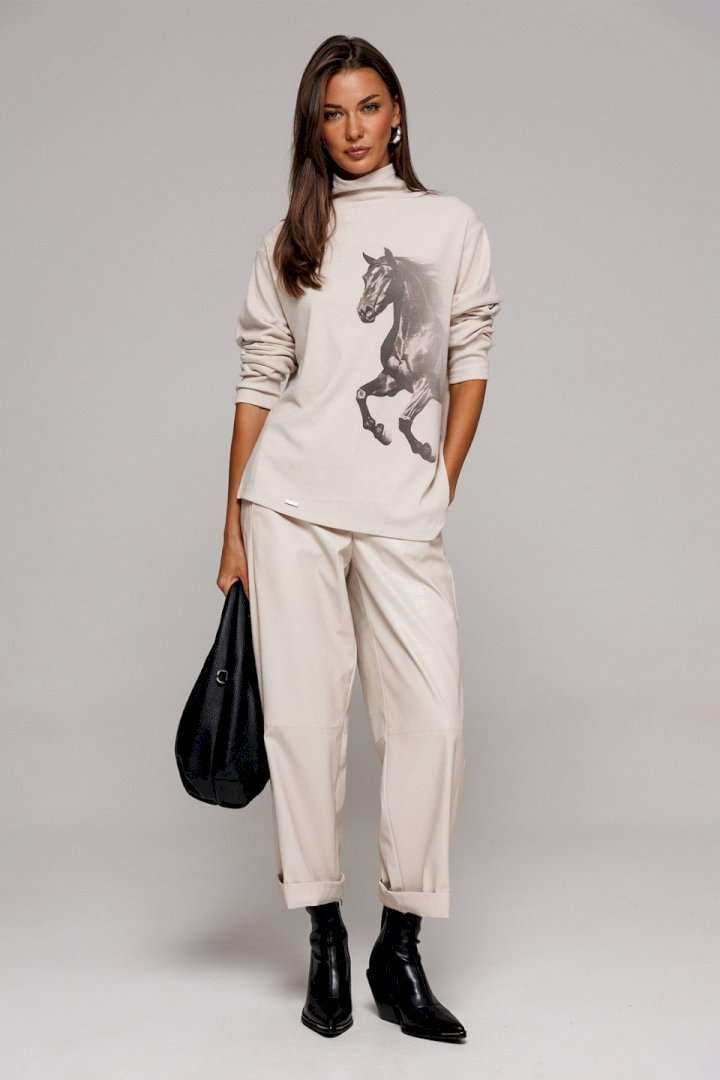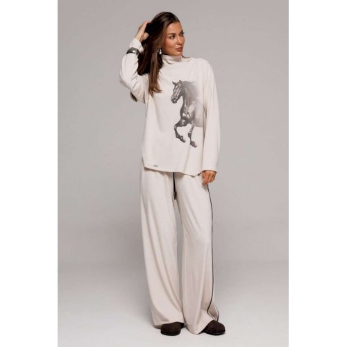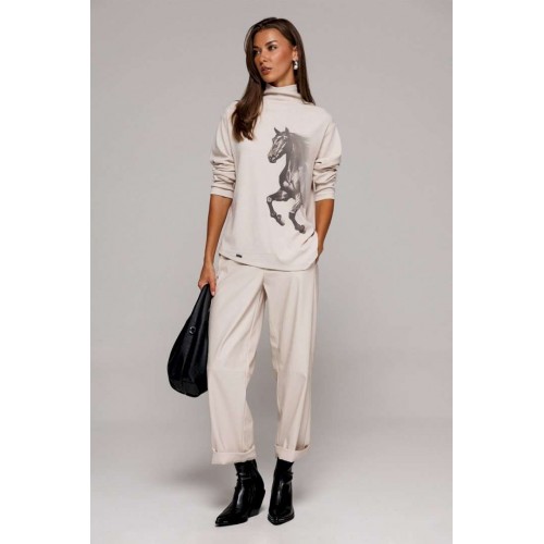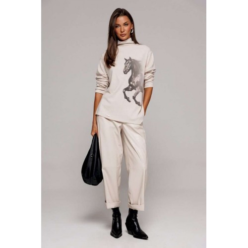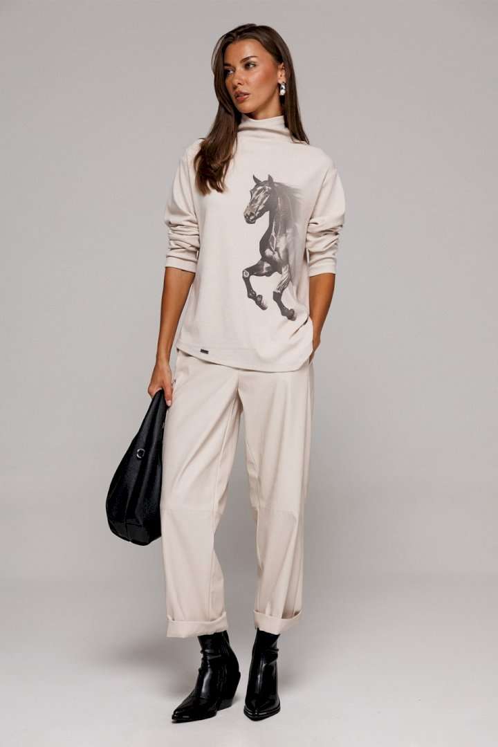 Джемпер из трикотажного полотна с велюровым эффектом прямого силуэта со спущенной линией плеча. Рукав втачной. По переду печать \"Лошадь\" и нашивка с гравировкой \"BUTER\". Низ джемпера по переду фигурный ассиметричный. Внизу по правому боковому шву обработан разрез. Воротник-стойка цельнокроеный.