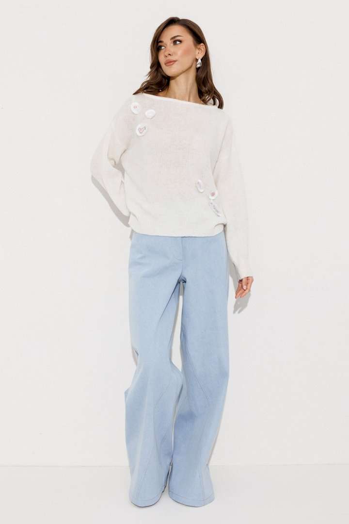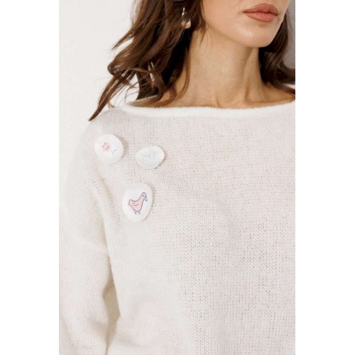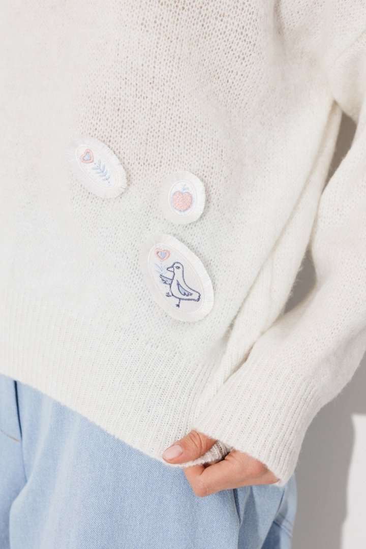 Этот теплый трикотажный джемпер в нежно-белом оттенке идеально подходит для создания расслабленного, но стильного образа. Модель выполнена с длинными втачными рукавами и оформлена спущенной линией плеч, добавляющей изделию современный акцент. Круглый вырез горловины подчеркивает изысканность образа. Особенный шарм джемперу придают нашивки с изображениями в стиле \"дудл\", расположенные как спереди, так и сзади. Эта деталь делает изделие игривым и молодежным.