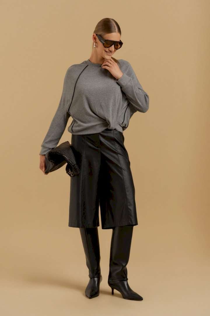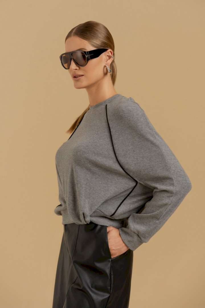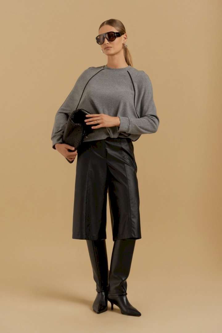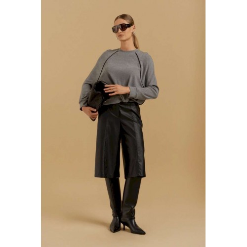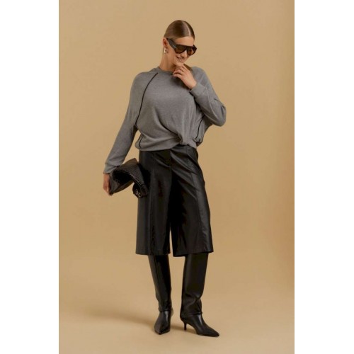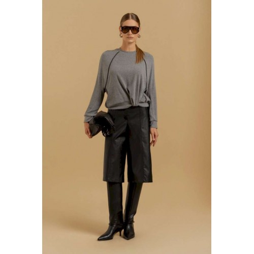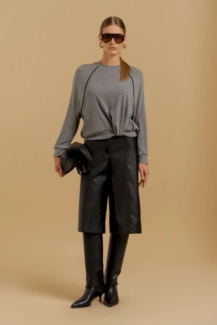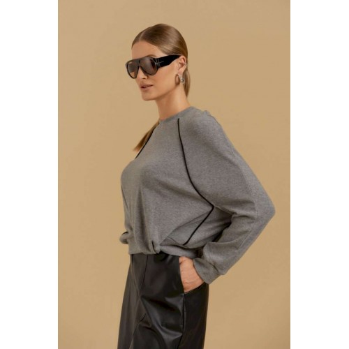 Джемпер женский из мягкого трикотажного полотна средней плотности свободного покроя. Рукава - цельнокроеные с углубленной проймой. Спереди выполнен декоративный элемент в виде драпировки. Вырез горловины - неглубокий с отрезной планкой. Низ изделия посажен на отрезную планку. Спереди и сзади в подрезы вставлены канты из отделочной ткани.