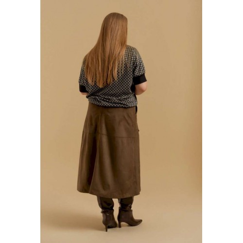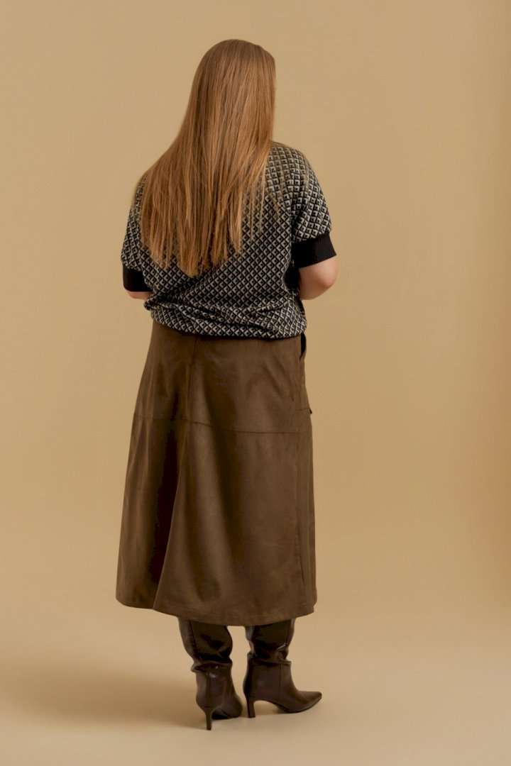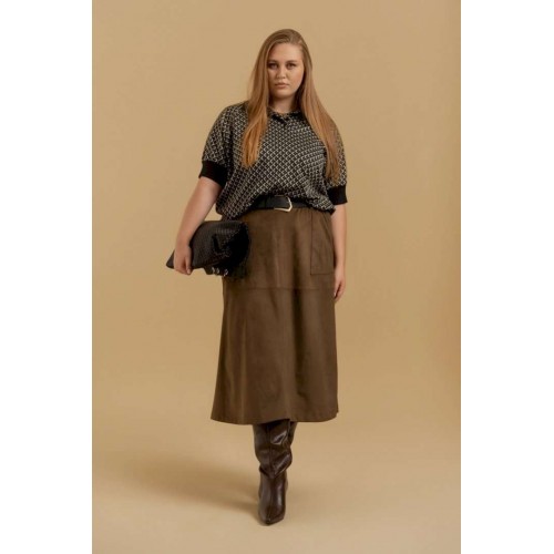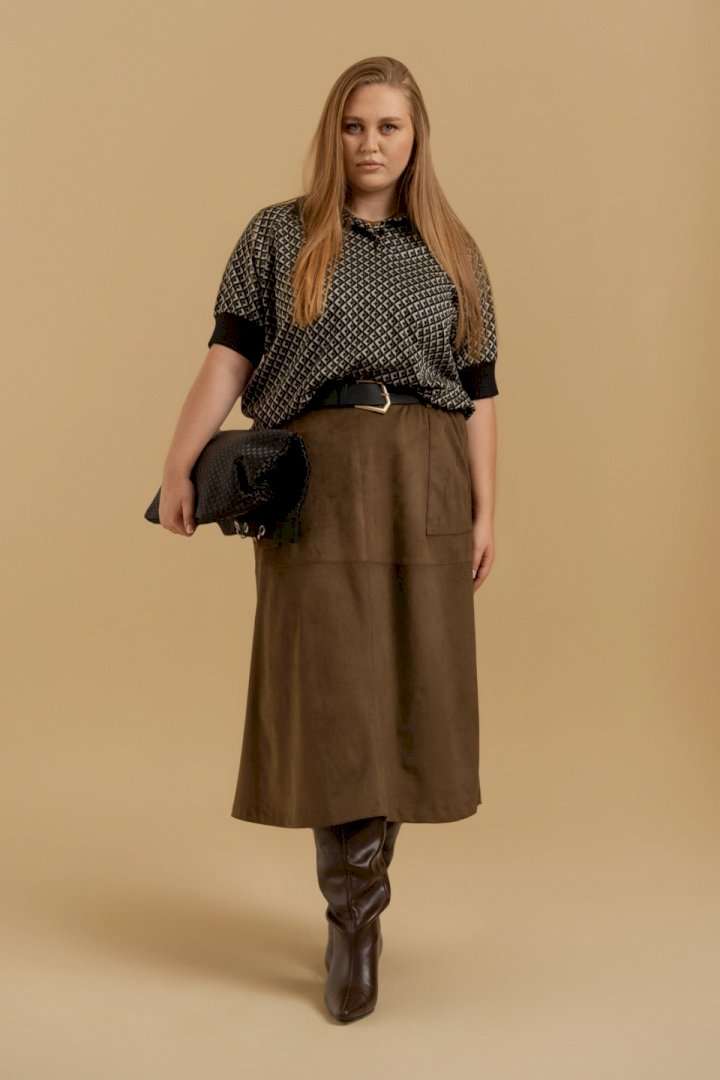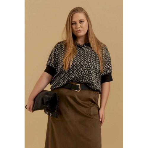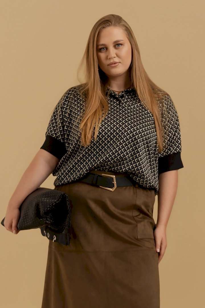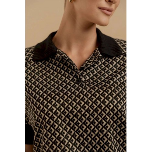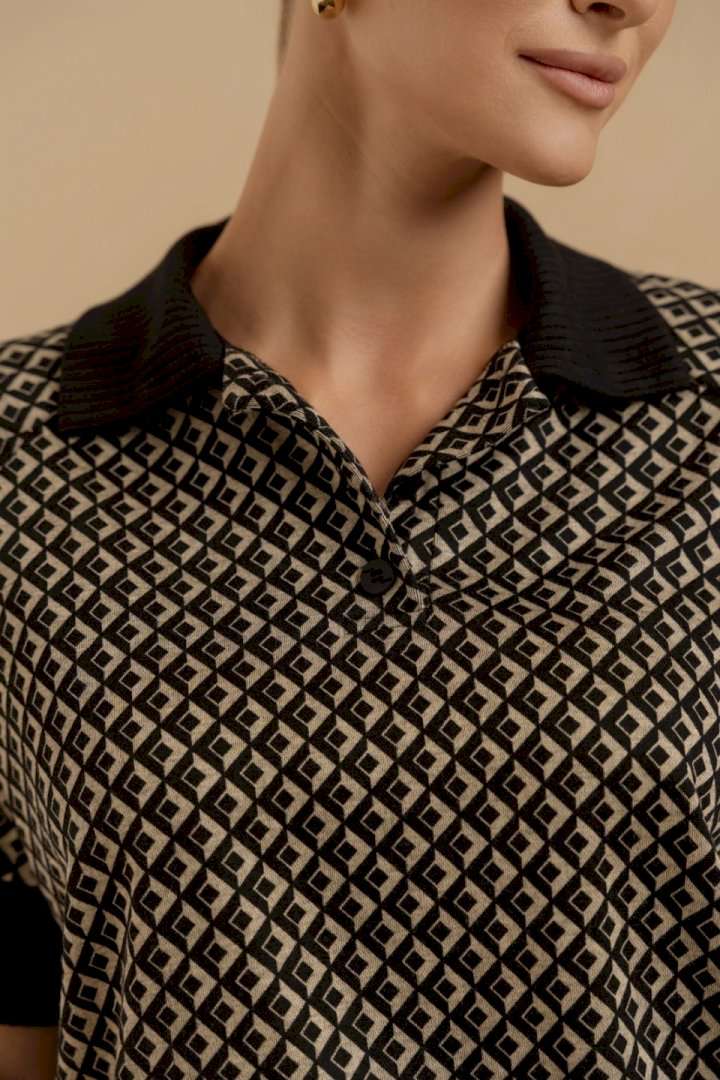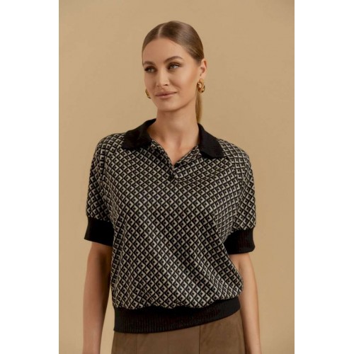 Джемпер женский свободного покроя из трикотажного полотна. Вырез горловины оформлен воротником - поло. Рукава - покроя реглан. Низа изделия посажены на декоративные довязы из отделочной ткани.